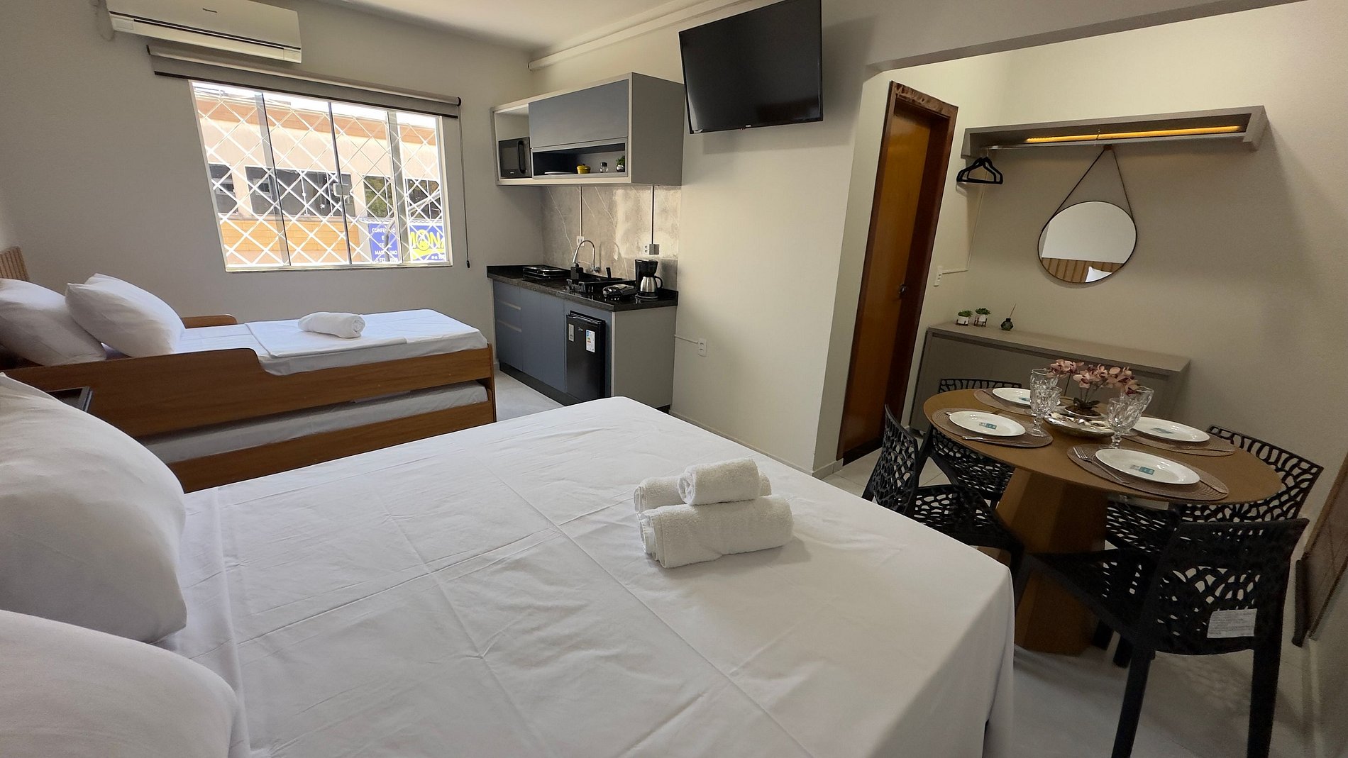 A acomodação conta com uma cama de casal padrão e uma bicama de solteiro, acomodando confortavelmente até quatro hóspedes. A cozinha é totalmente equipada com utensílios e eletrodomésticos do dia a dia, e a mesa de jantar com quatro lugares proporciona ótimos momentos para as refeições ou um café tranquilo antes dos passeios. O banheiro é funcional e conta com ducha higiênica e chuveiro elétrico.