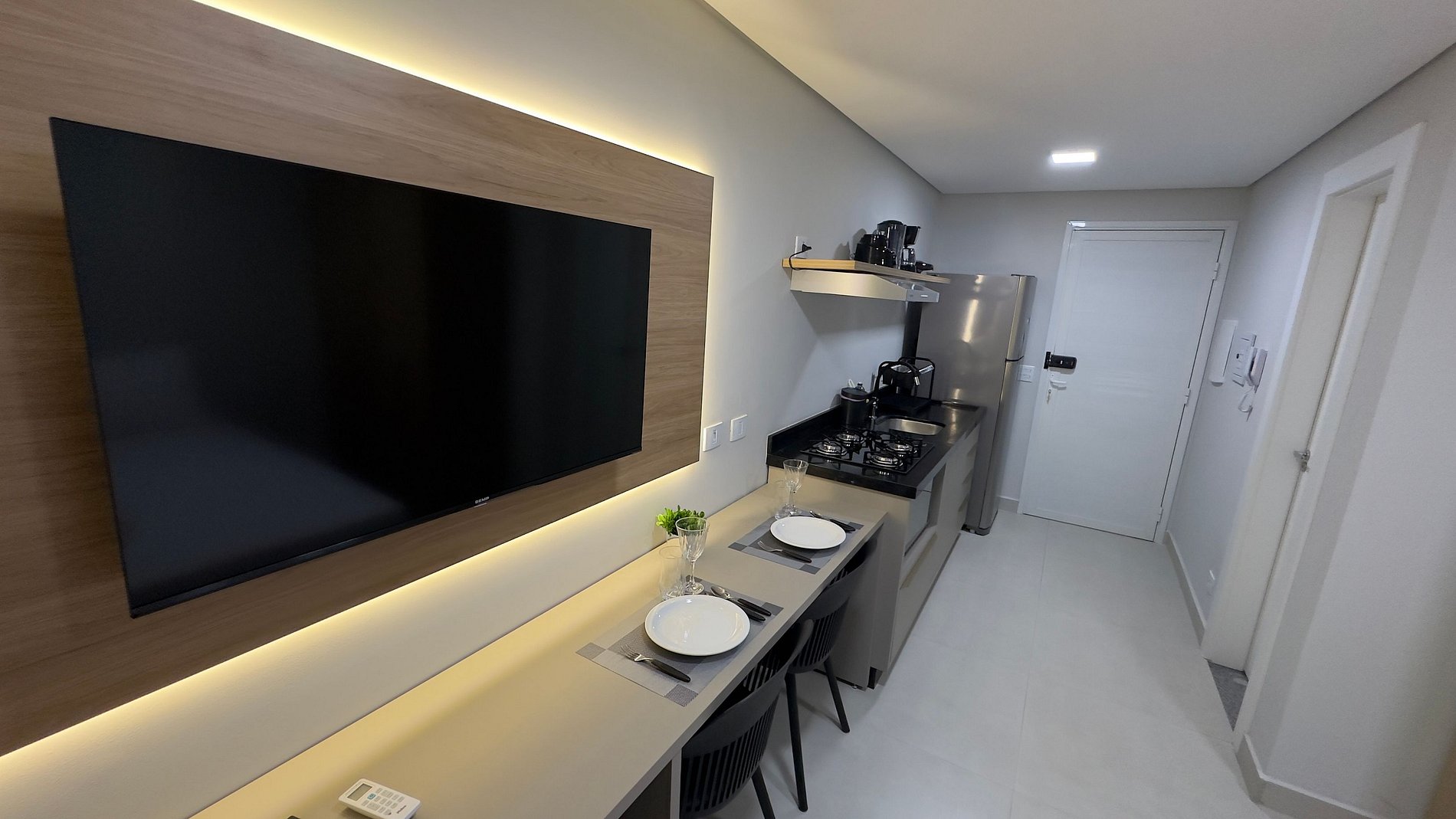 O apartamento térreo e compacto, mas extremamente funcional, com uma cama de casal padrão, cozinha equipada com utensílios do dia a dia, banheiro com ducha elétrica, banheiro com chuveiro elétrico, mesa para trabalhos, além de um ambiente moderno e bem decorado. O prédio é novo e conta com fechadura eletrônica, garantindo praticidade no acesso, além de entrada totalmente tecnológica e segura.