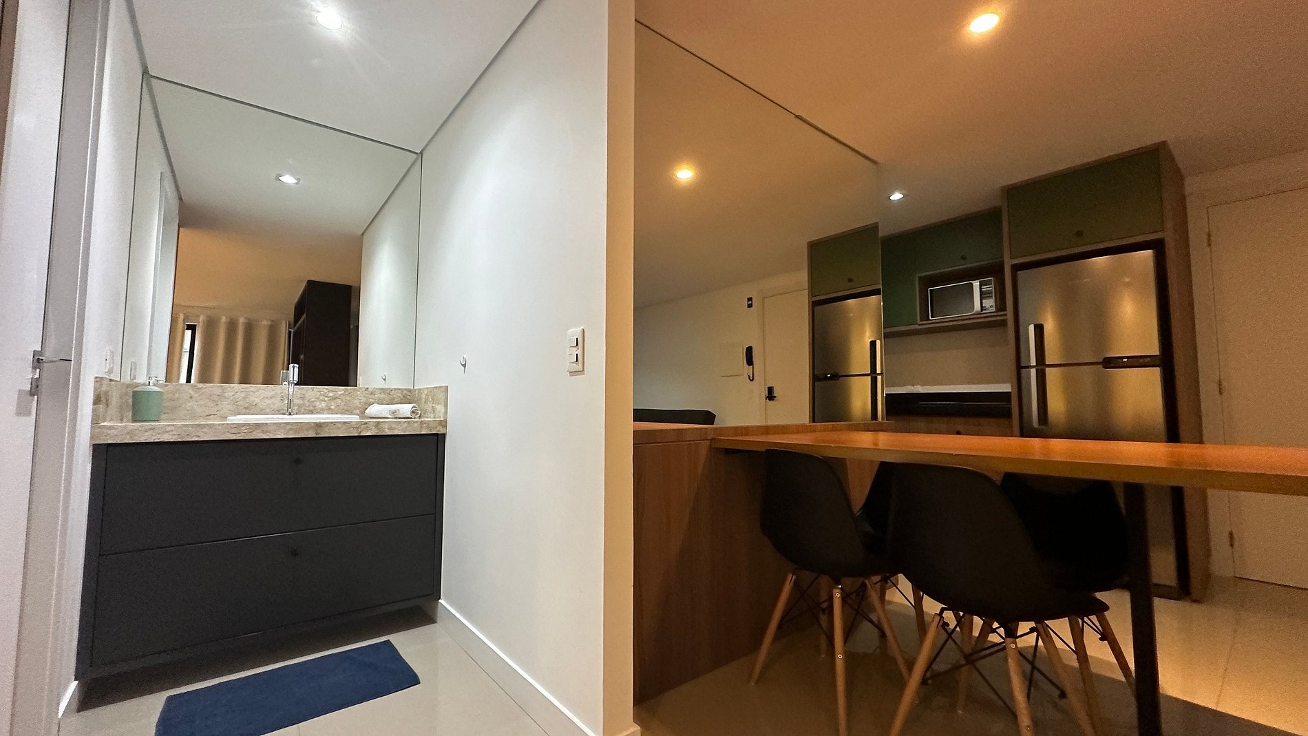 Apto Studio com decoração aconchegante e moderna, equipado com tudo o que você precisa para ficar confortável durante sua hospedagem. A uma quadra da avenida Jorge Schimmelpfeng, no centro de Foz do Iguaçu. Próximo a bares, restaurantes, farmácias e com uma padaria ao lado. De fácil acesso aos pontos turísticos seja por transporte publico, taxi ou qualquer meio de transporte, auxiliando para quem não conhece a cidade.
