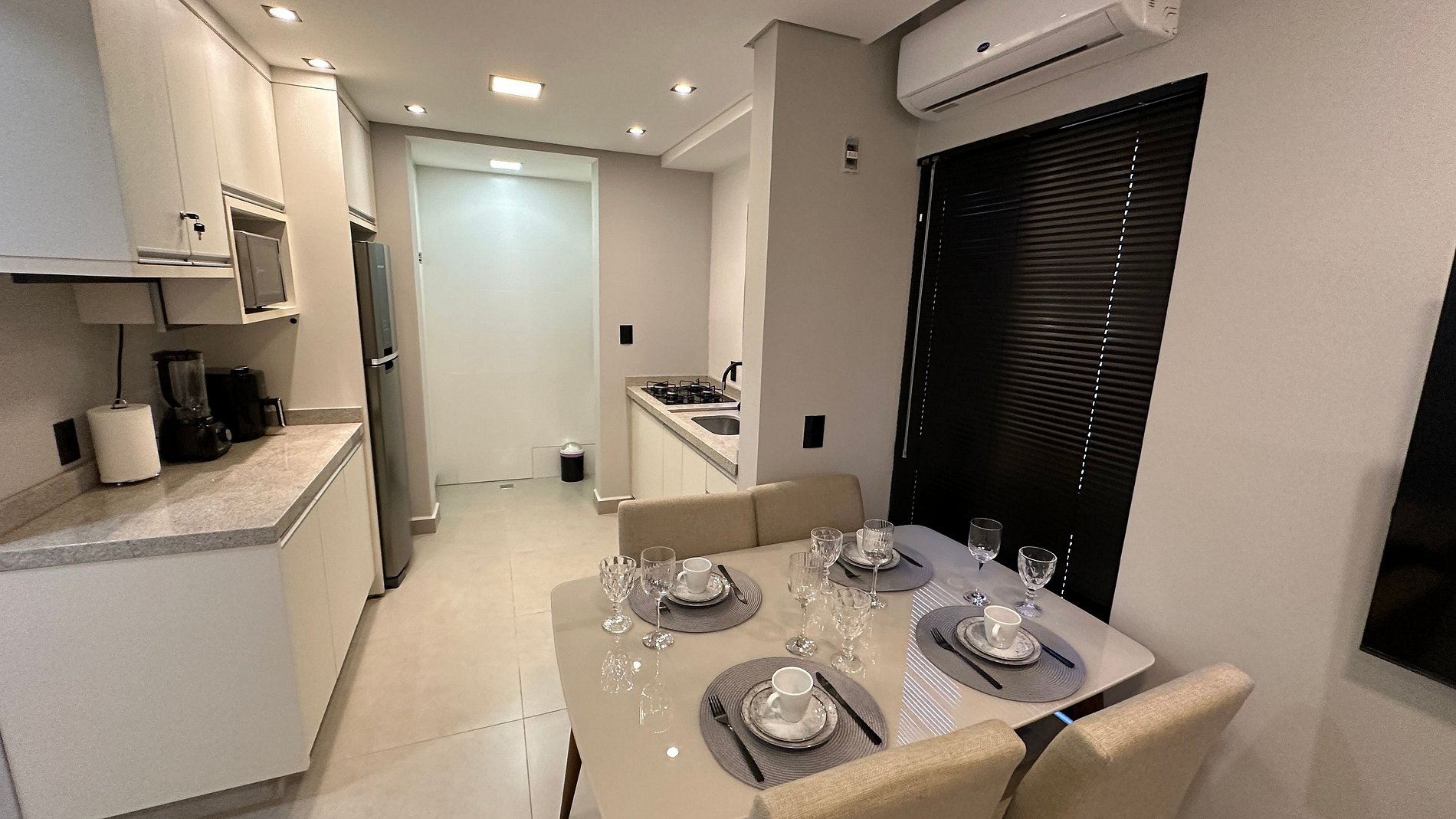 - Cozinha com itens/aparelhos básicos para refeições do dia a dia; (Micro-ondas, fogão 04 bocas, Airfryer, liquidificador, e geladeira com congelador)