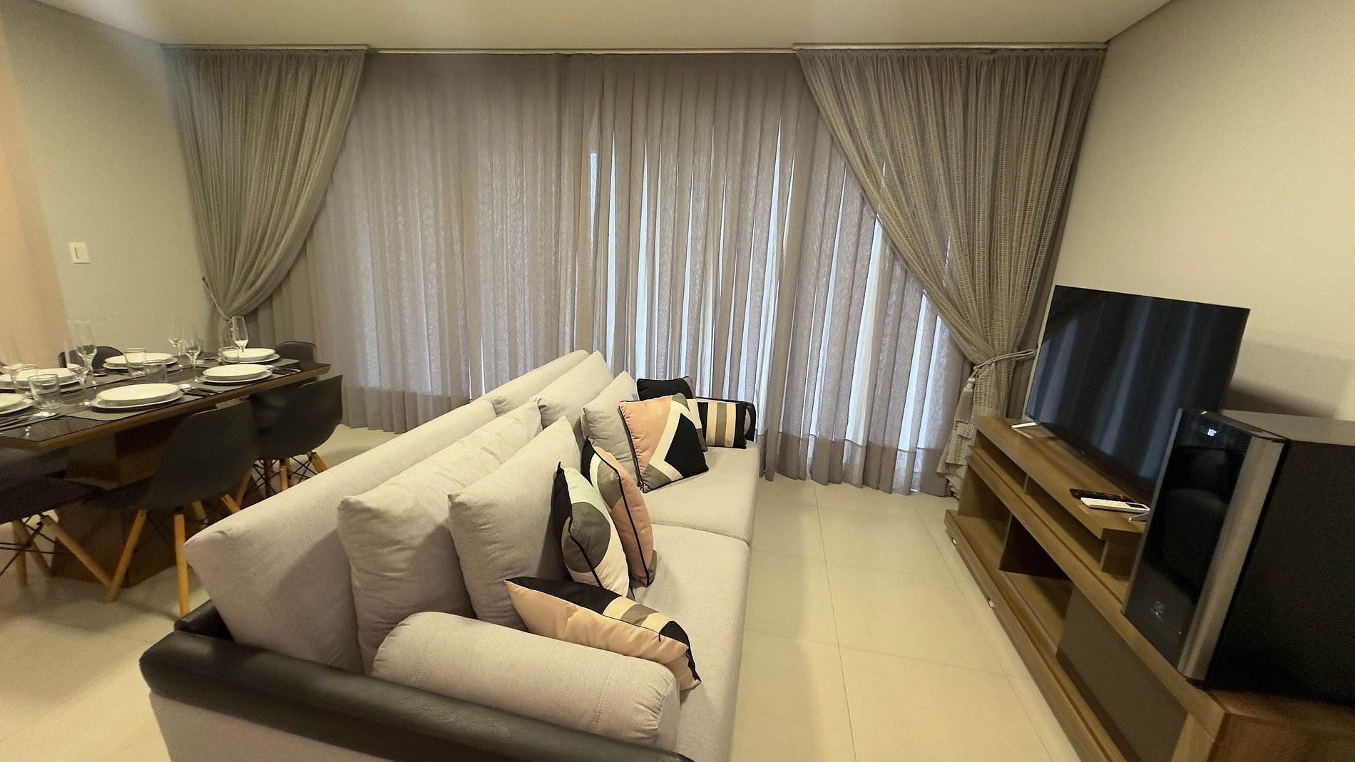 A sala de estar se integra à área de jantar, formando um ambiente moderno, climatizado e muito agradável. Smart TV de tela grande, adega, ampla varanda com churrasqueira que proporciona momentos de lazer e descontração. A iluminação planejada valoriza a decoração e torna o espaço ainda mais aconchegante — perfeita para relaxar após um dia de passeios.