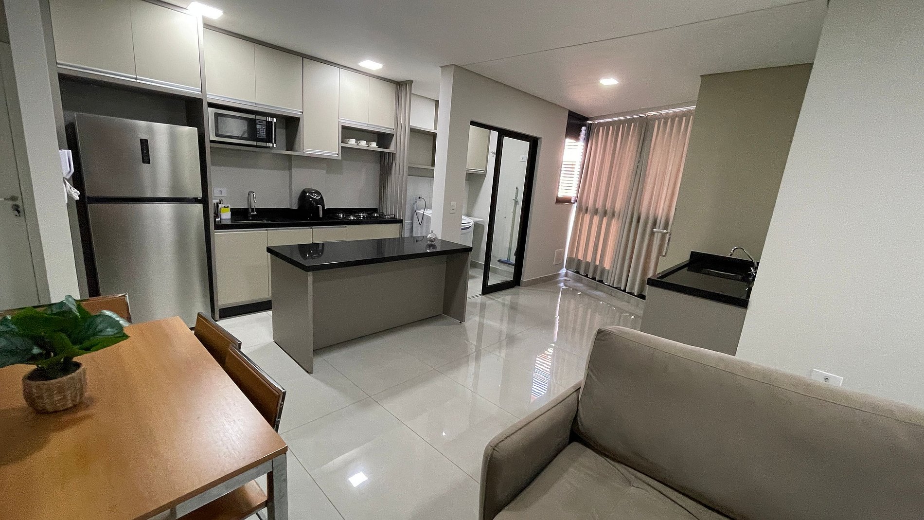 Cozinha equipada para refeições do dia-a-dia. Microondas, Airfryer, fogão, panelas e os principais utensílios domésticos para a sua estadia.