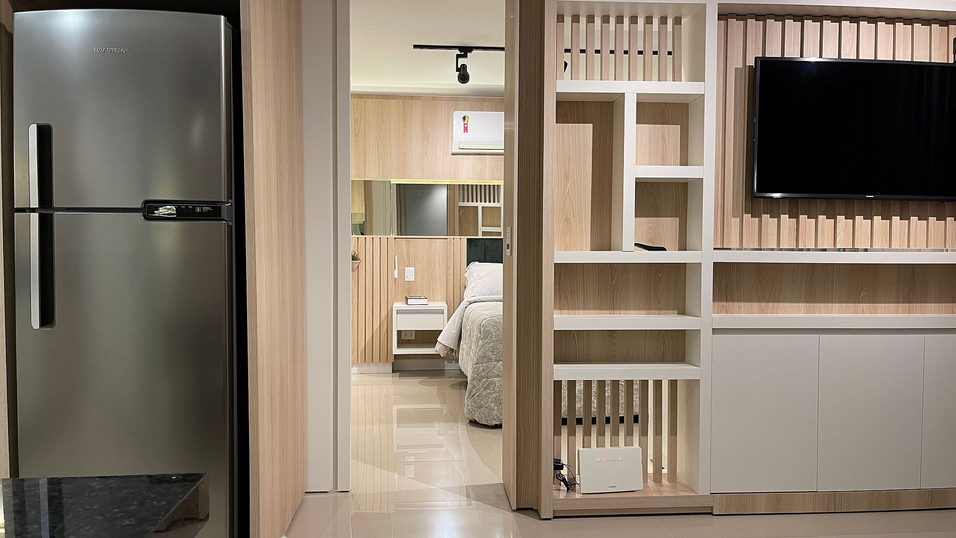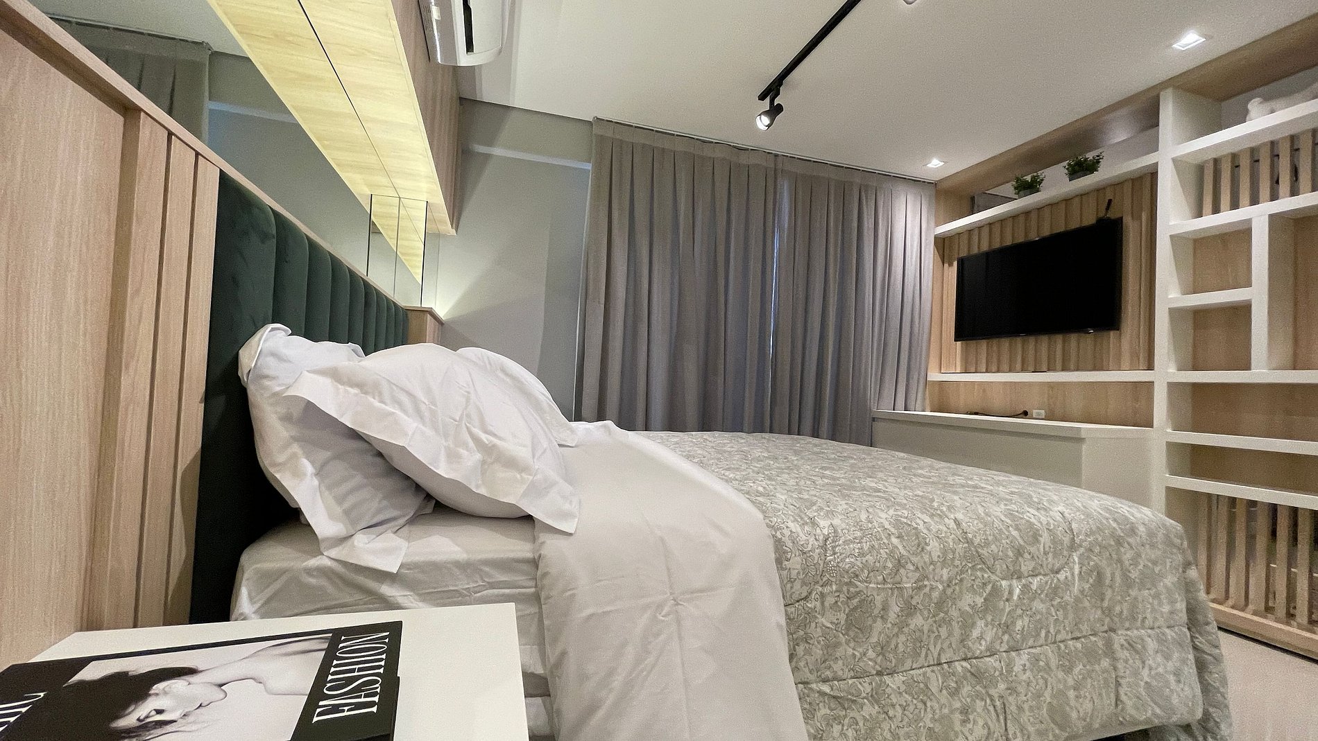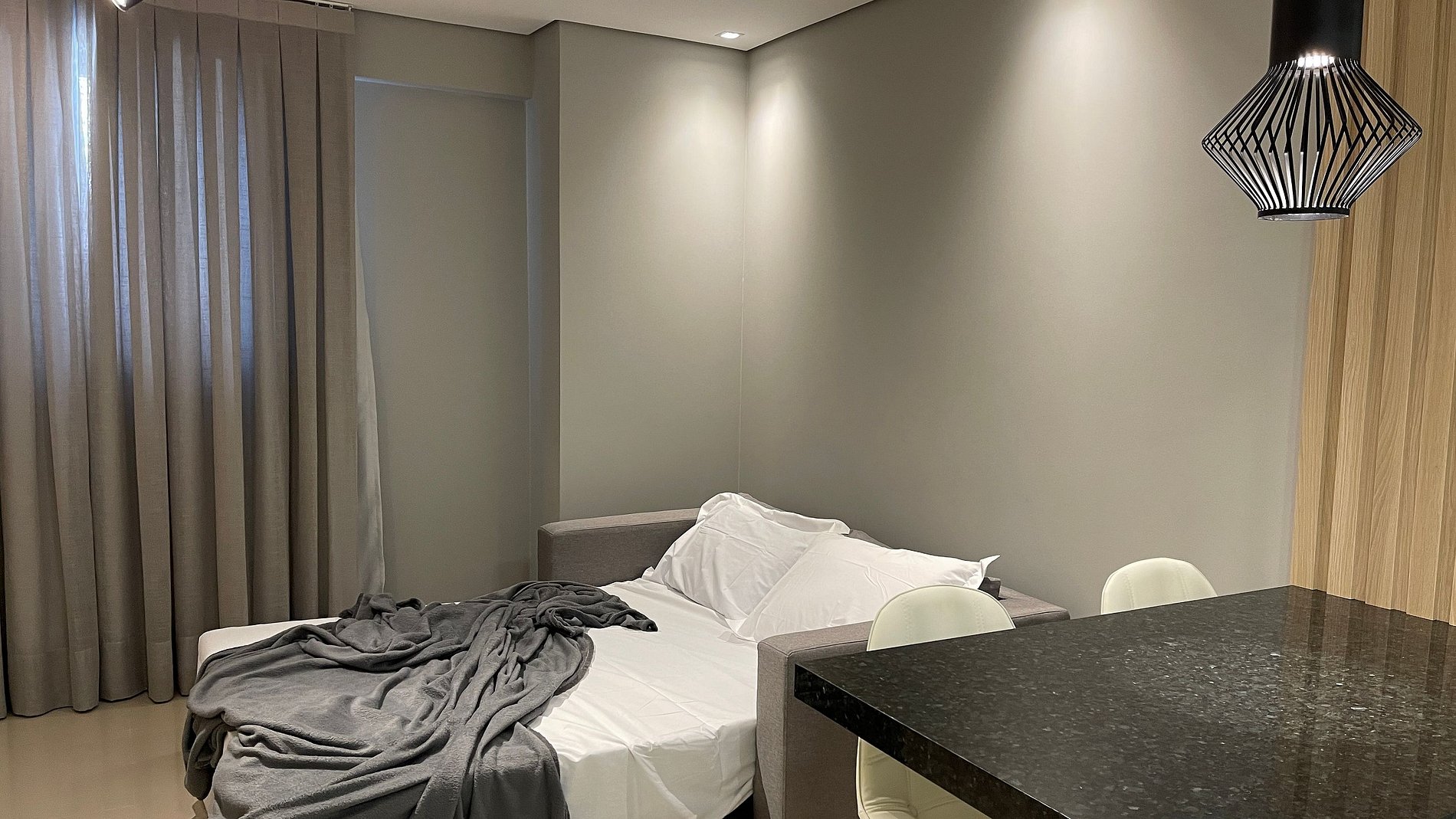 O espaço conta com: - 01 quarto com cama casal queen e armários; - 01 sala com sofá cama CONFORTÁVEL para até 02 adultos; - - 01 banheiro com ducha elétrica; - Itens de cozinha básicos; - Wi-fi Equipamentos: - Ar condicionado no quarto que refrigera todo o espaço respectivamente; - Geladeira, fogão 2 bocas de indução (elétrico), micro-ondas, liquidificador, cafeteira, sanduicheira, chaleira e forno elétricos, ferro a vapor, depurador de ar - TV Smart , com sinal de TV digital e NETFLIX ( usuário não fornecido) ; - Enxoval de cama e banho; - Enxoval de cozinha com taças de vinho , jogo de panelas , jogo de jantar e café completo, jogo de talheres e demais utensílios;