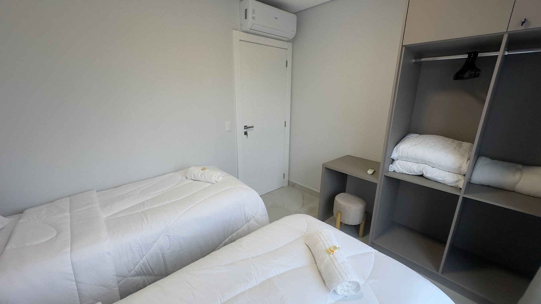 O apartamento dispõe de três quartos, sendo uma suíte com cama queen, outro quarto com cama queen e um terceiro com duas camas de solteiro. Todos os quartos têm móveis planejados, guarda-roupas espaçosos, ar condicionado e uma vista incrível da cidade.