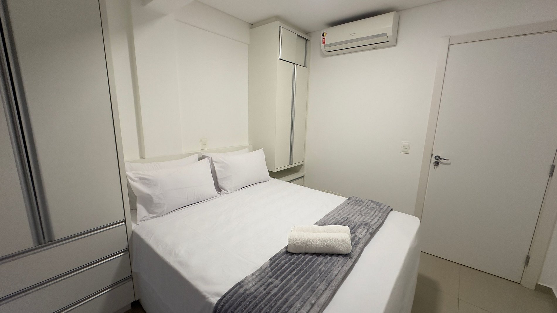 Na suíte principal, o conforto é garantido com uma cama Queen, ar-condicionado e móveis planejados que garantem organização e praticidade. O banheiro da suíte é completo, com chuveiro elétrico e bom espaço de bancada para itens de uso pessoal. É importante destacar que a sala de estar não possui ar-condicionado, embora seja bem ventilada e agradável.