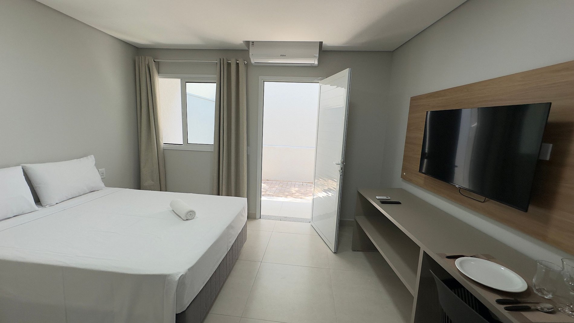 O apartamento térreo e compacto, mas extremamente funcional, com uma cama de casal padrão, cozinha equipada com utensílios do dia a dia, banheiro com ducha elétrica, banheiro com chuveiro elétrico, mesa para trabalhos, além de um ambiente moderno e bem decorado. O prédio é novo e conta com fechadura eletrônica, garantindo praticidade no acesso, além de entrada totalmente tecnológica e segura.