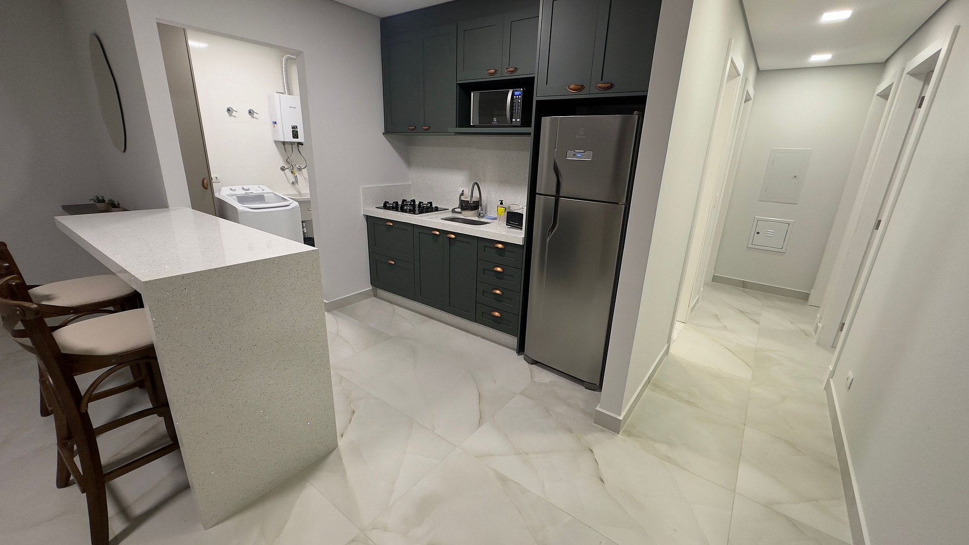 O destaque fica por conta do espaço gourmet com churrasqueira, perfeito para confraternizações e momentos especiais. A cozinha planejada é linda e totalmente equipada com eletrodomésticos, facilitando suas refeições durante a estadia. Além disso, há um espaço de lavanderia com máquina de lavar e tanque para sua conveniência.
