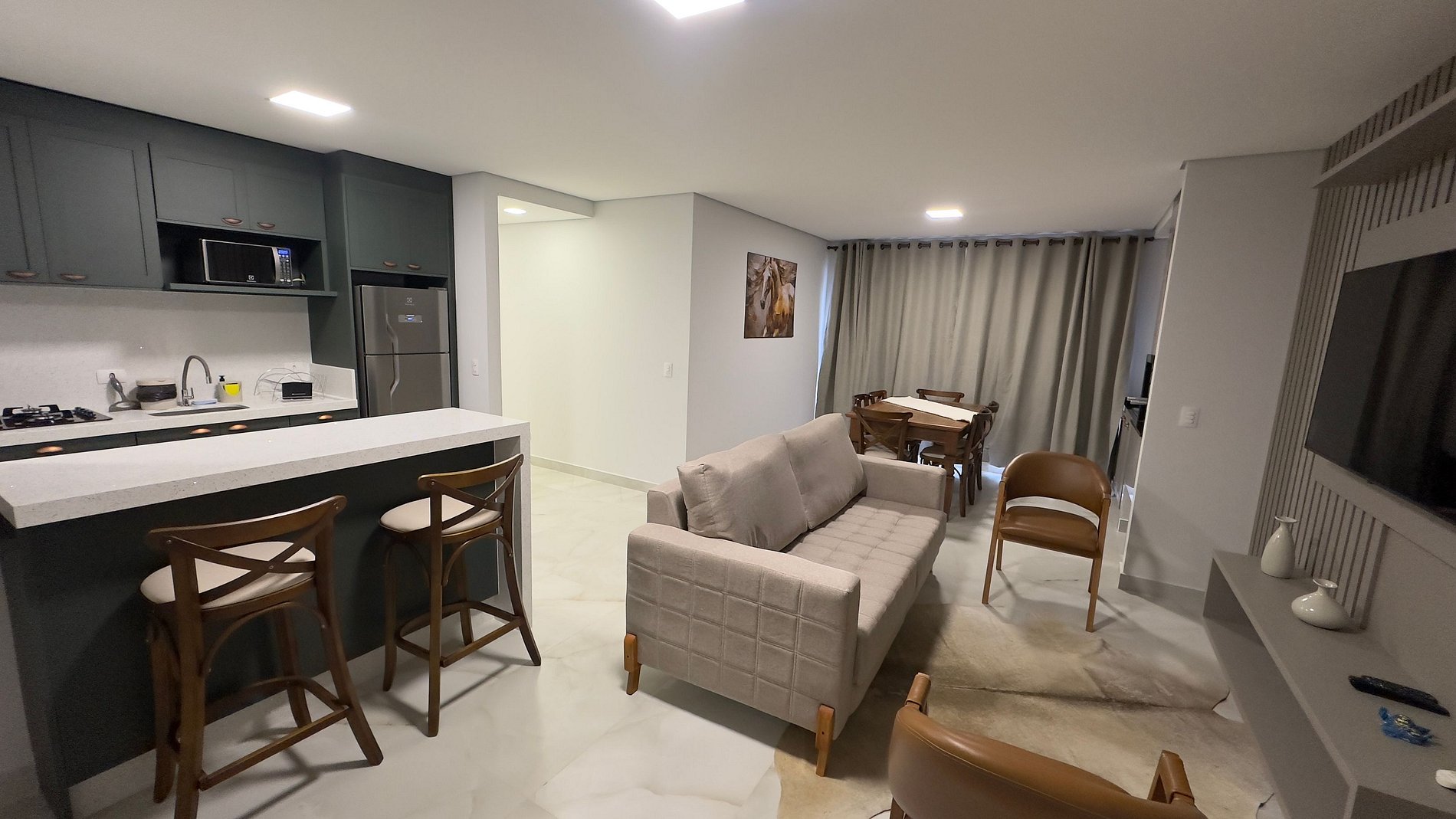 Na sala, você vai encontrar um sofá aconchegante, Smart TV e internet de 300 Mbps para garantir que você esteja sempre conectado.