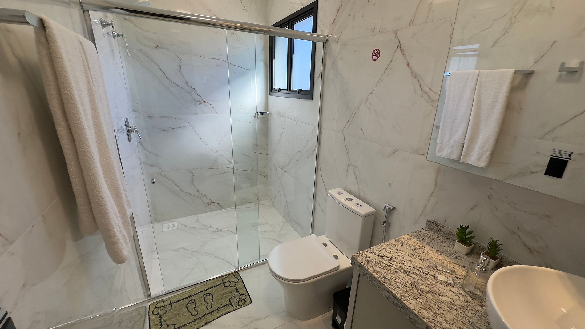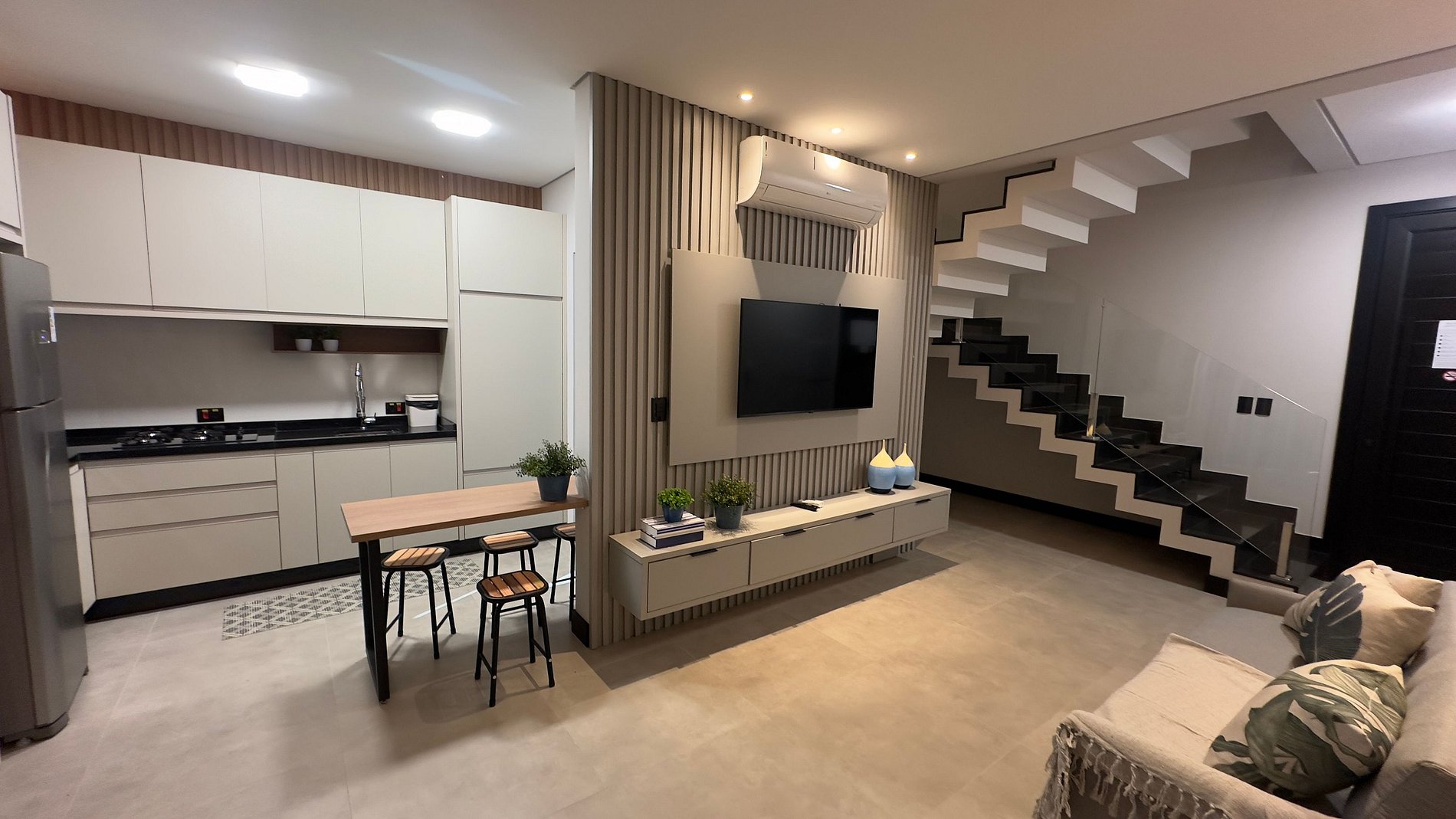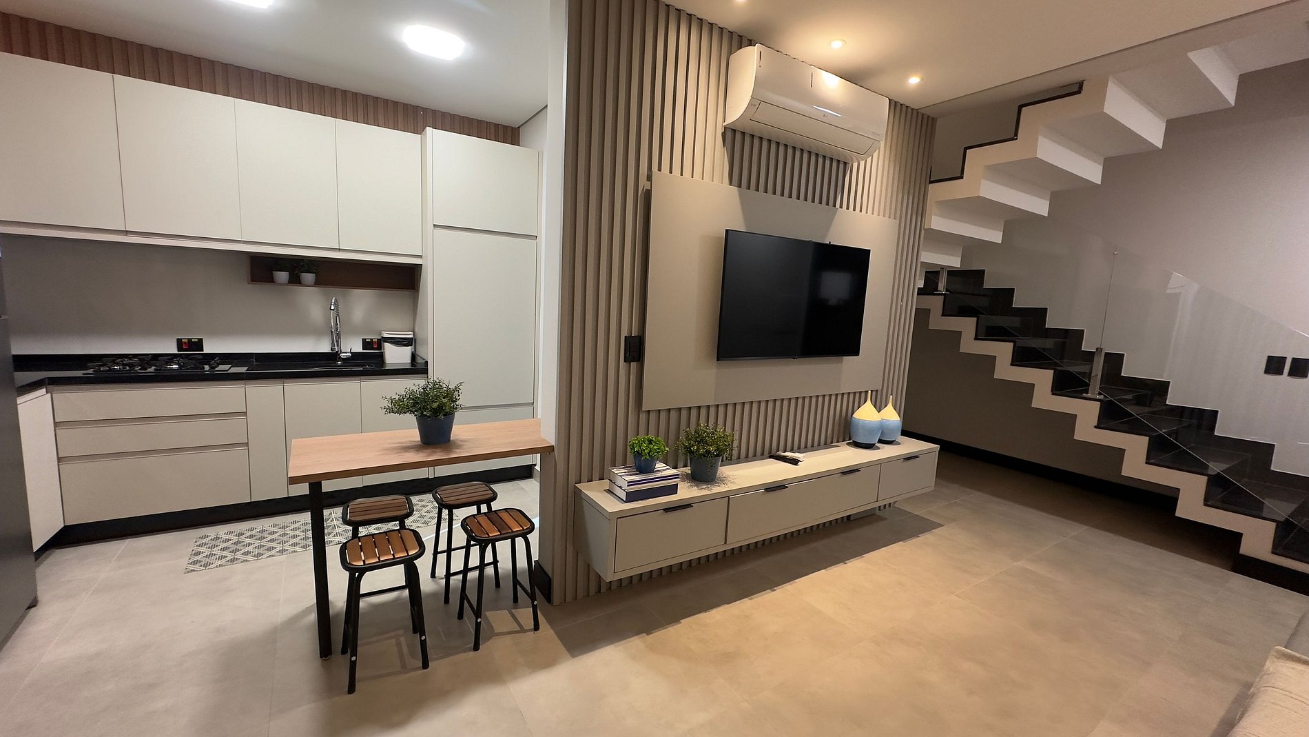 No piso térreo, você encontrará uma sala ampla com sofá-cama tamanho queen super confortável, cozinha equipada com utensílios e eletrodomésticos para o dia a dia, lavanderia com máquina de lavar e tanque, além de uma área gourmet externa aconchegante com churrasqueira, bancada e banquetas — ideal para momentos especiais.