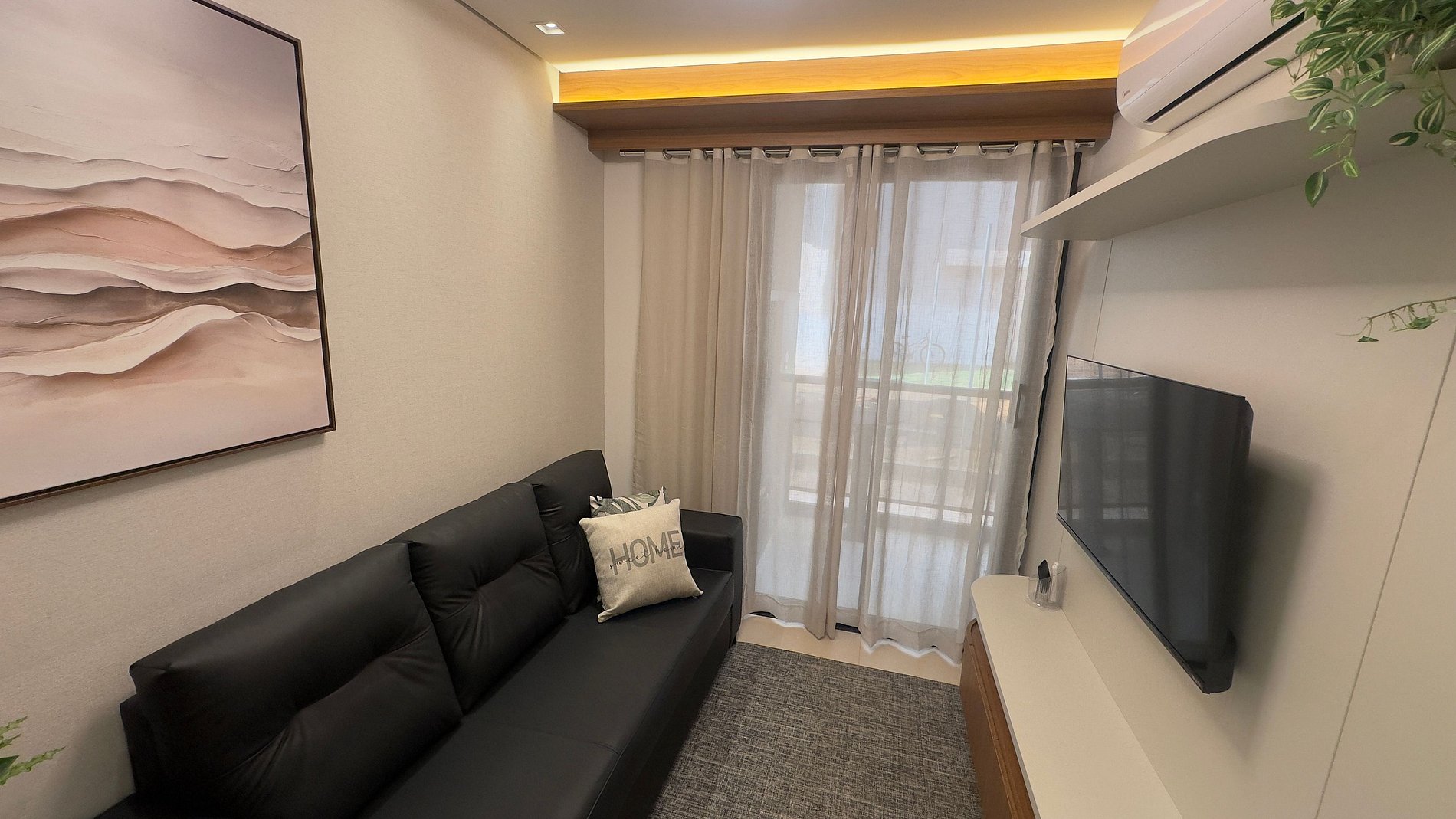 O apartamento conta com cozinha equipada com utensílios para refeições do dia a dia, área de lavanderia com tanque e máquina de lavar, varanda com churrasqueira para confraternizações, dois quartos bem equipados (O primeiro quarto possui uma cama de casal, móveis planejados e ar-condicionado, garantindo noites frescas e confortáveis. O segundo quarto dispõe de uma bicama de solteiro, ideal para acomodar mais dois hóspedes, e utiliza a refrescância do ar-condicionado da sala para climatização). Internet banda larga de 200 megabits, perfeita para quem precisa se manter conectado.