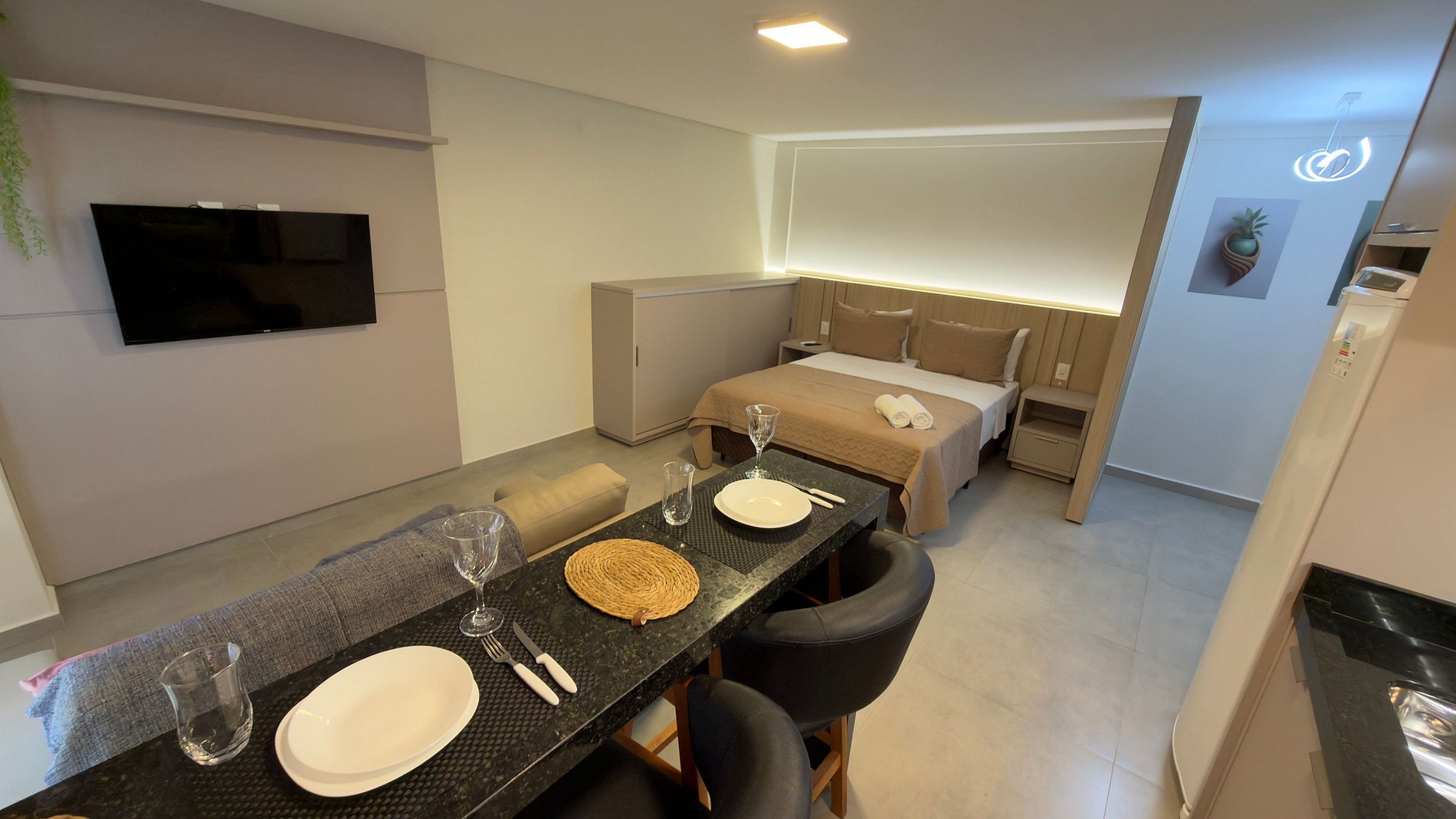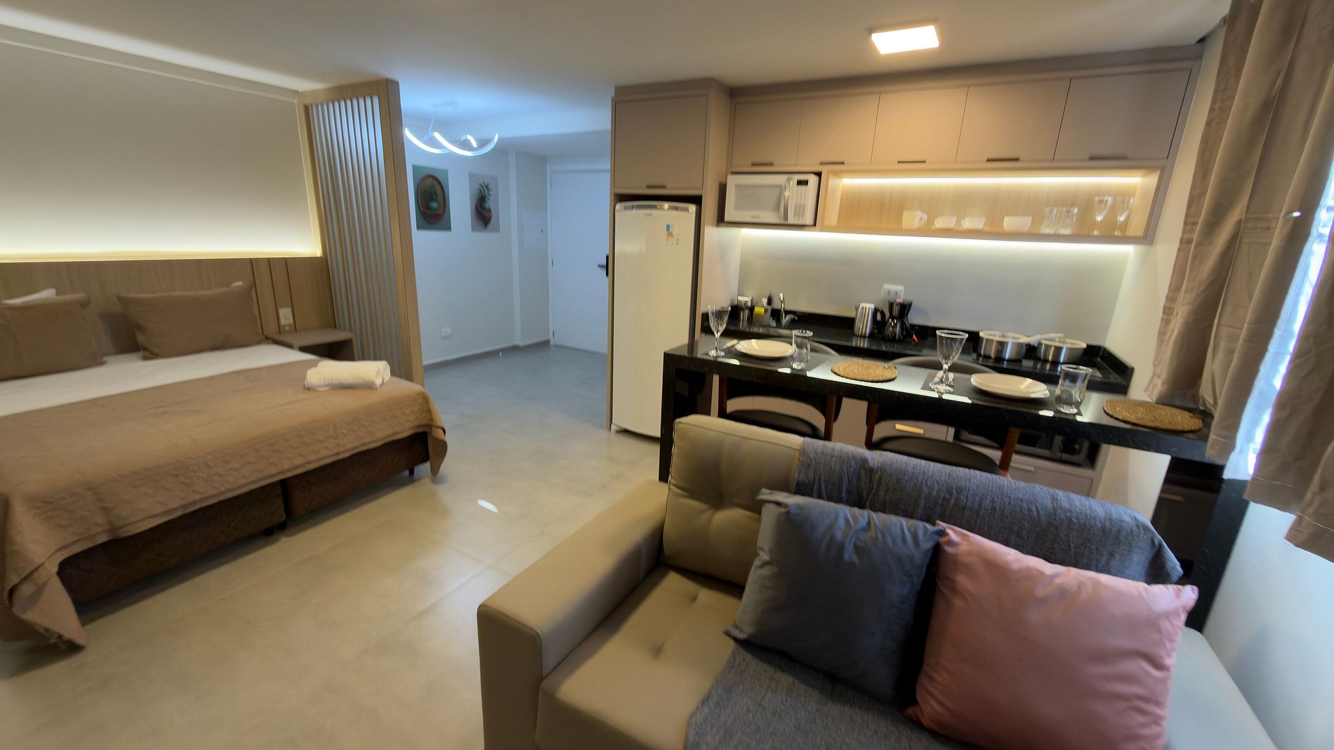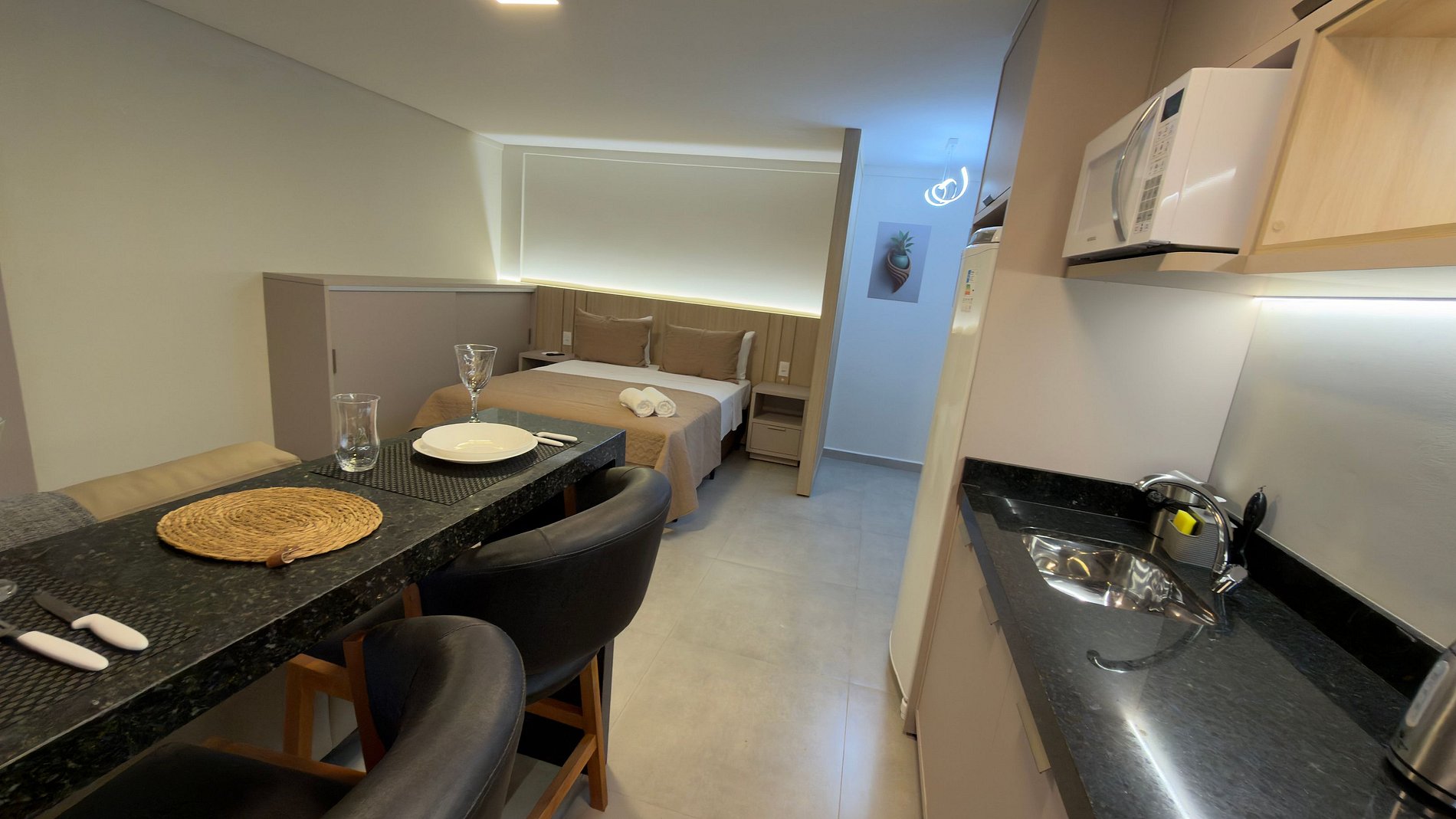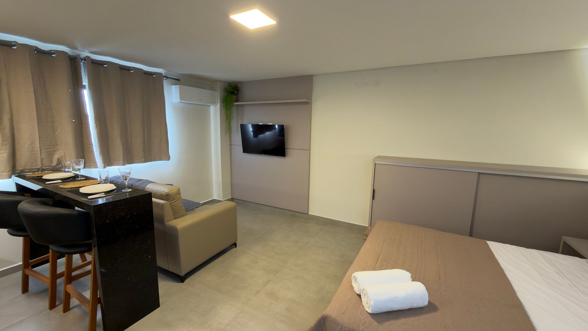 Este estúdio moderno e bem planejado é ideal para quem busca conforto, praticidade e uma excelente localização em Foz do Iguaçu. O espaço é compacto, funcional e muito bem iluminado, com mobiliário contemporâneo e acabamento de qualidade, pensado tanto para estadias curtas quanto mais longas.