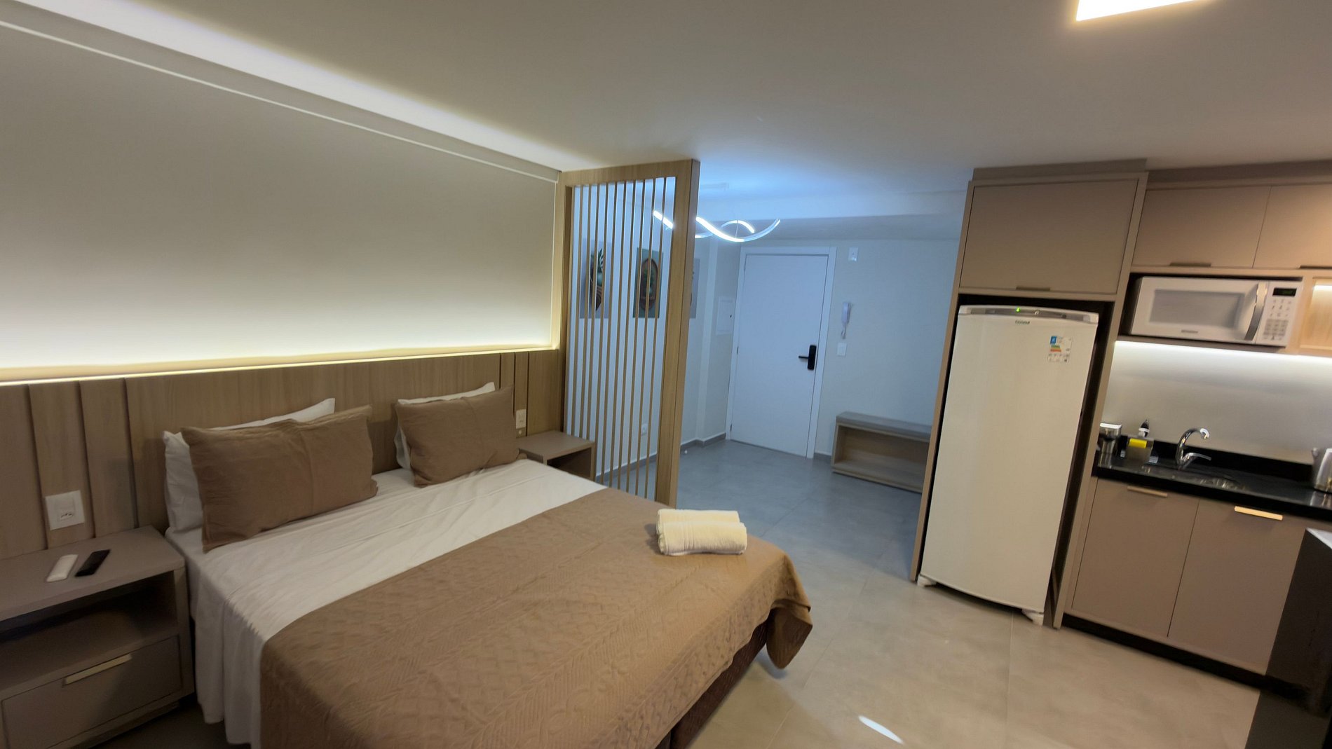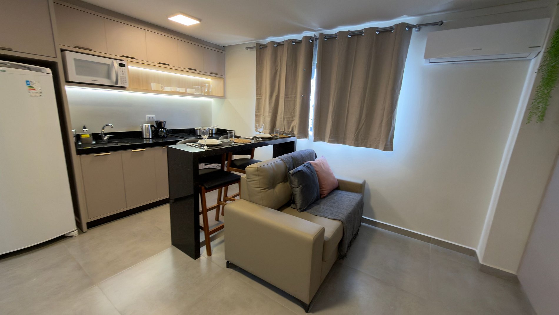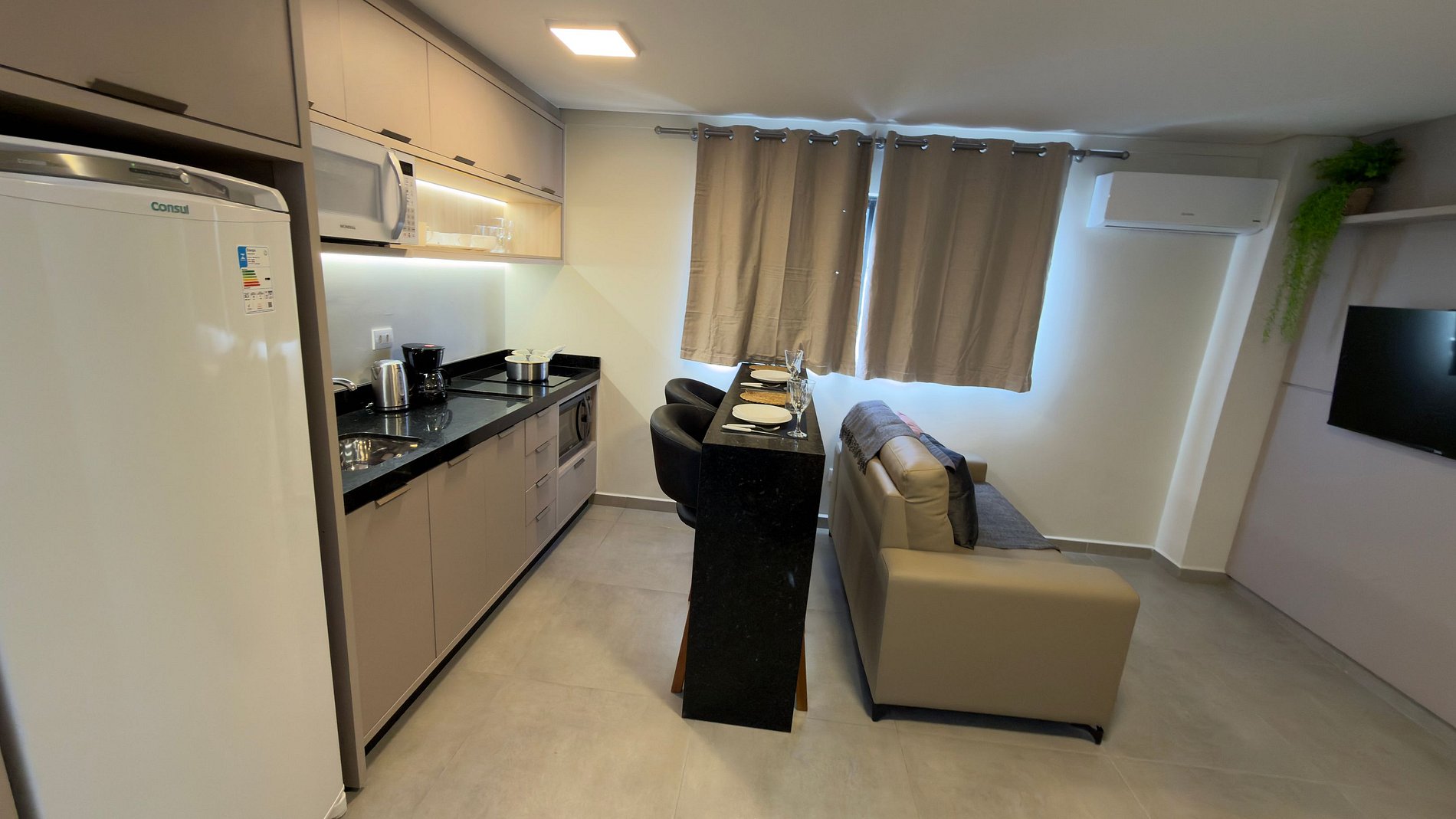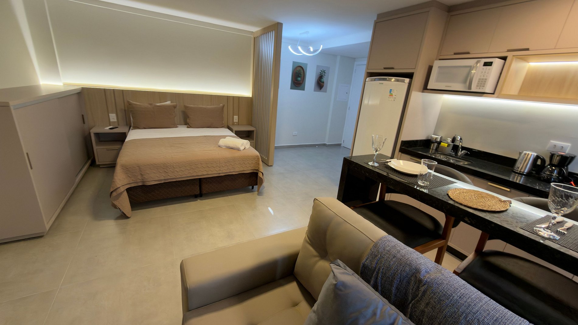 Este estúdio moderno e bem planejado é ideal para quem busca conforto, praticidade e uma excelente localização em Foz do Iguaçu. O espaço é compacto, funcional e muito bem iluminado, com mobiliário contemporâneo e acabamento de qualidade, pensado tanto para estadias curtas quanto mais longas.