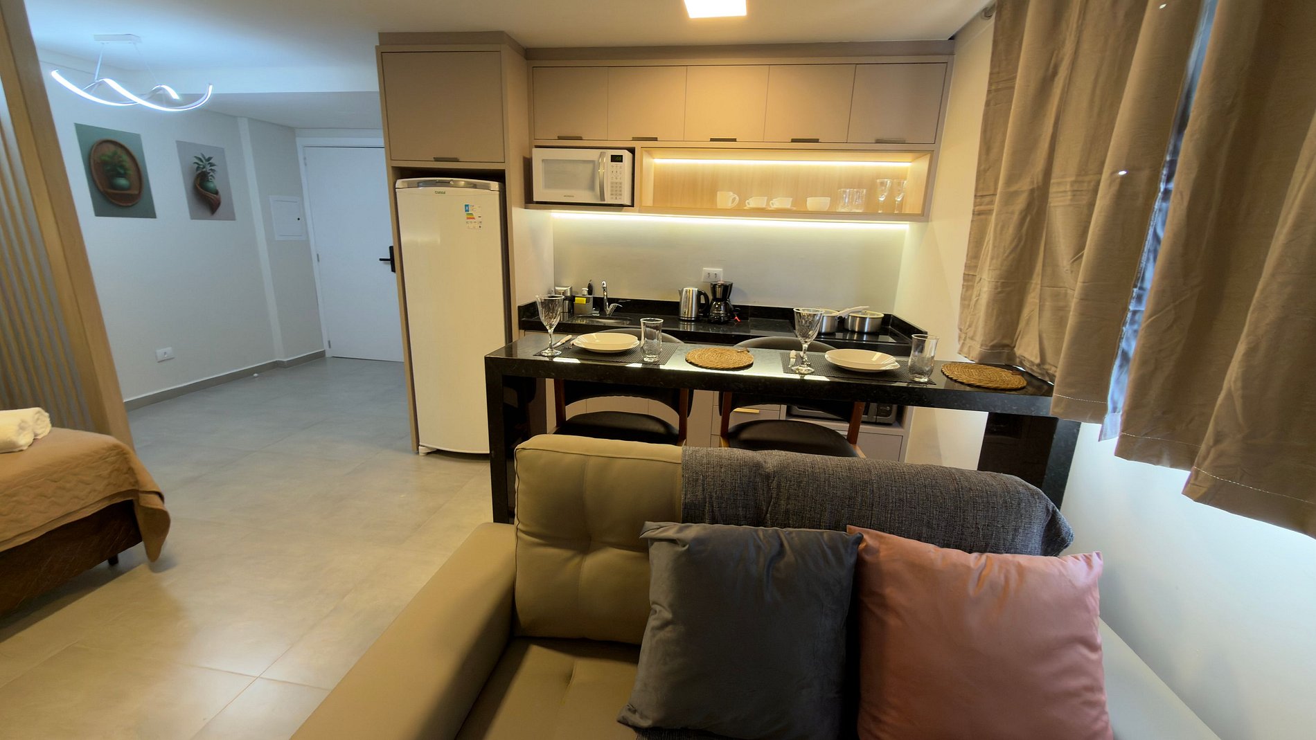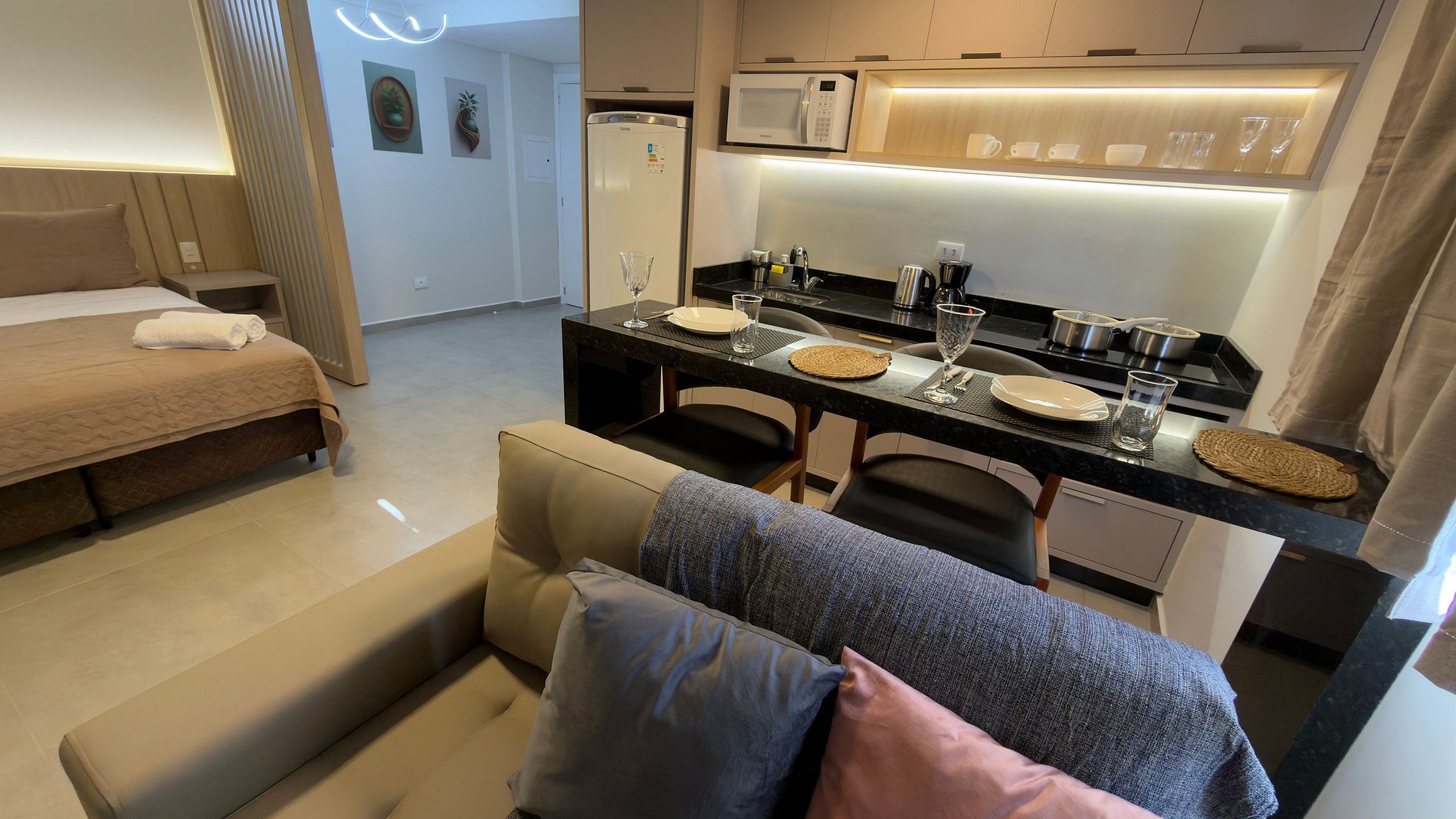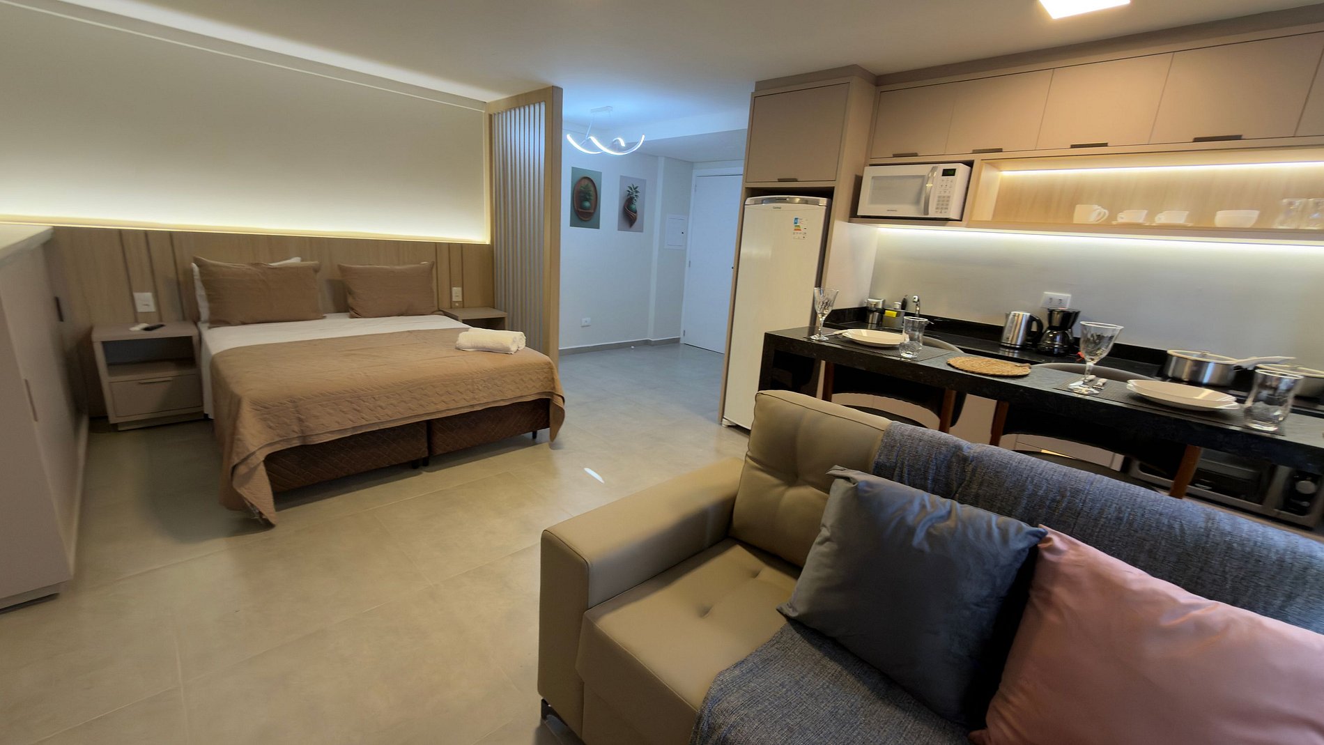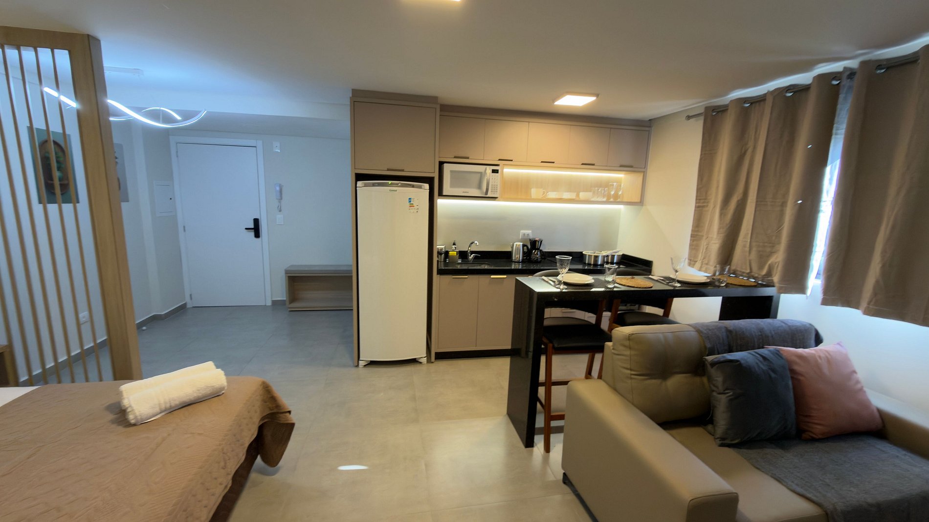 Este estúdio moderno e bem planejado é ideal para quem busca conforto, praticidade e uma excelente localização em Foz do Iguaçu. O espaço é compacto, funcional e muito bem iluminado, com mobiliário contemporâneo e acabamento de qualidade, pensado tanto para estadias curtas quanto mais longas.