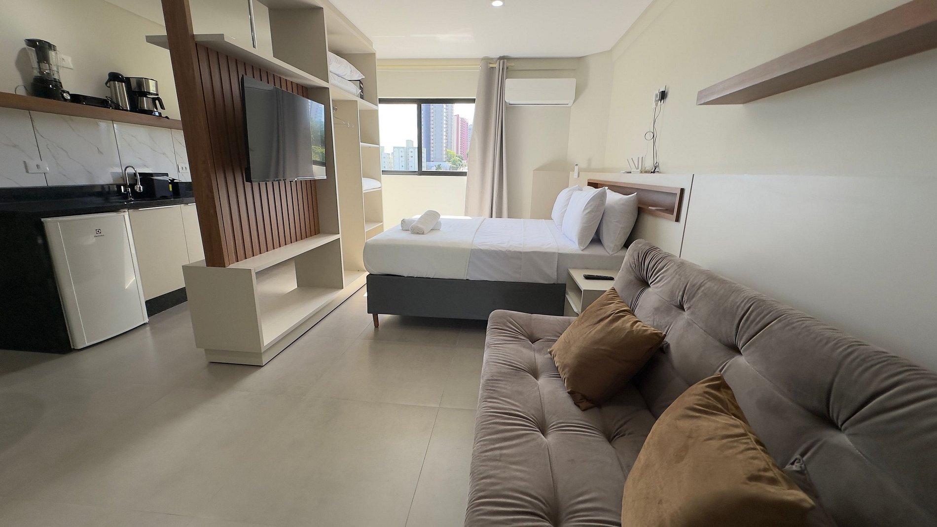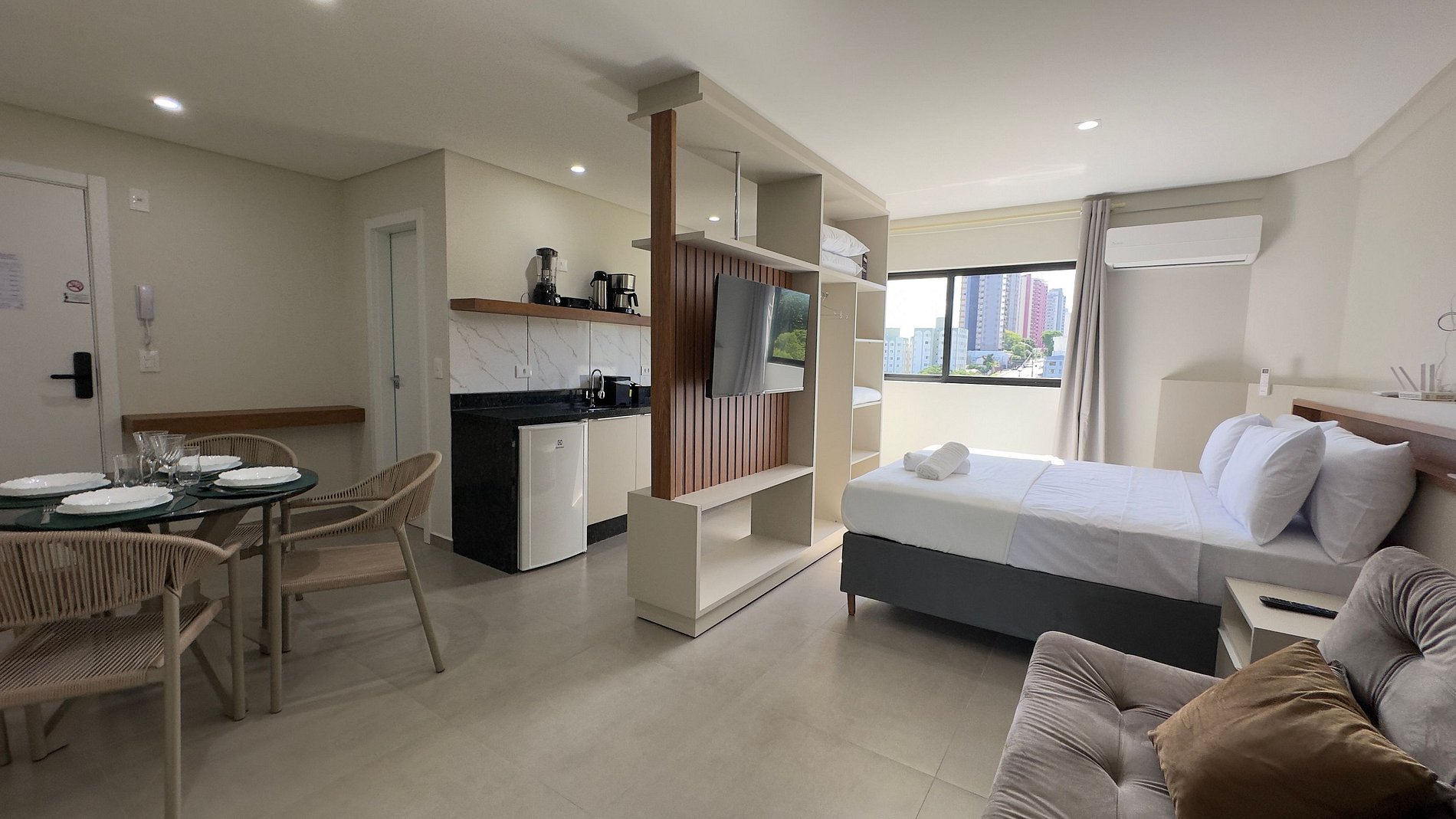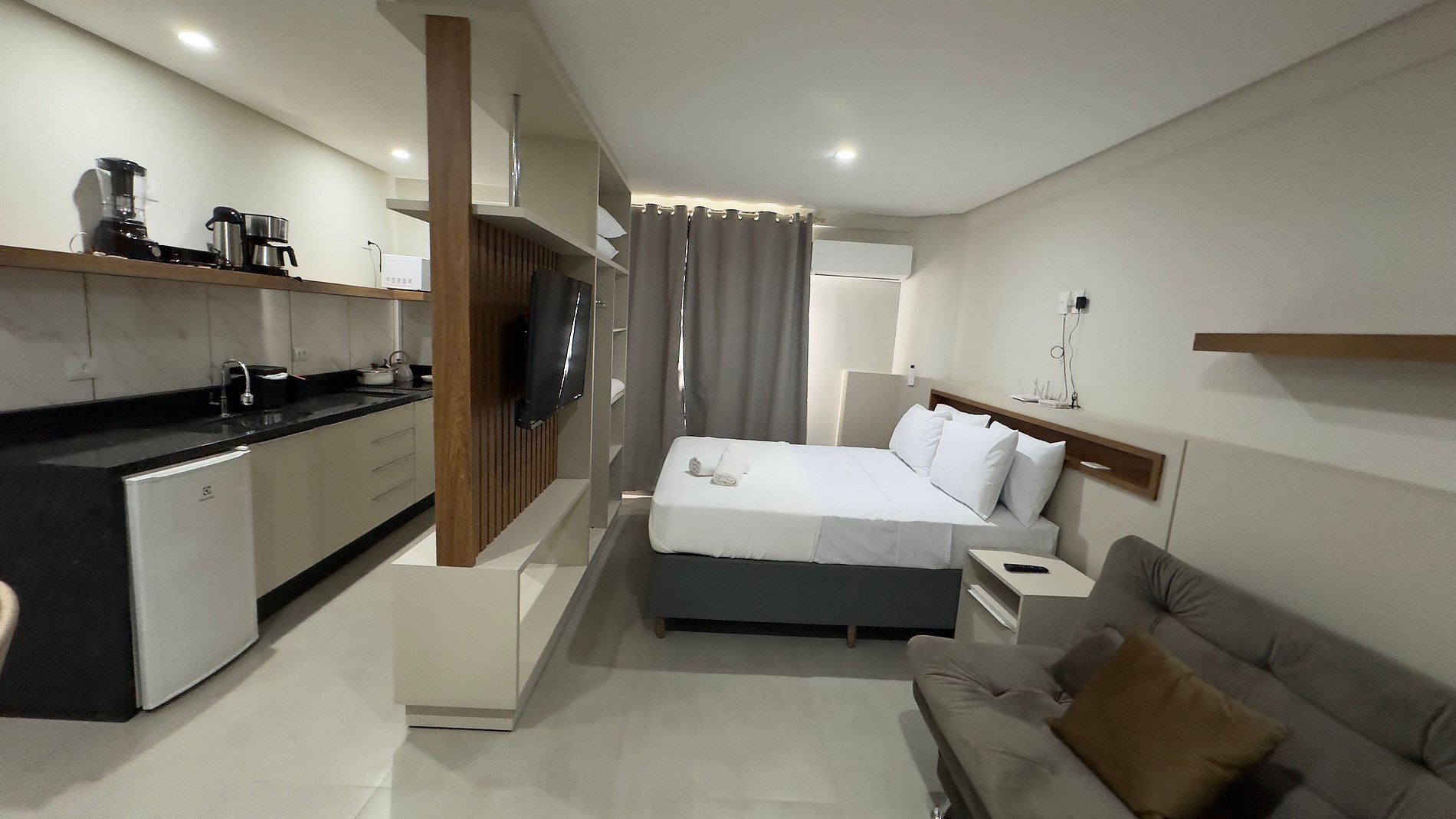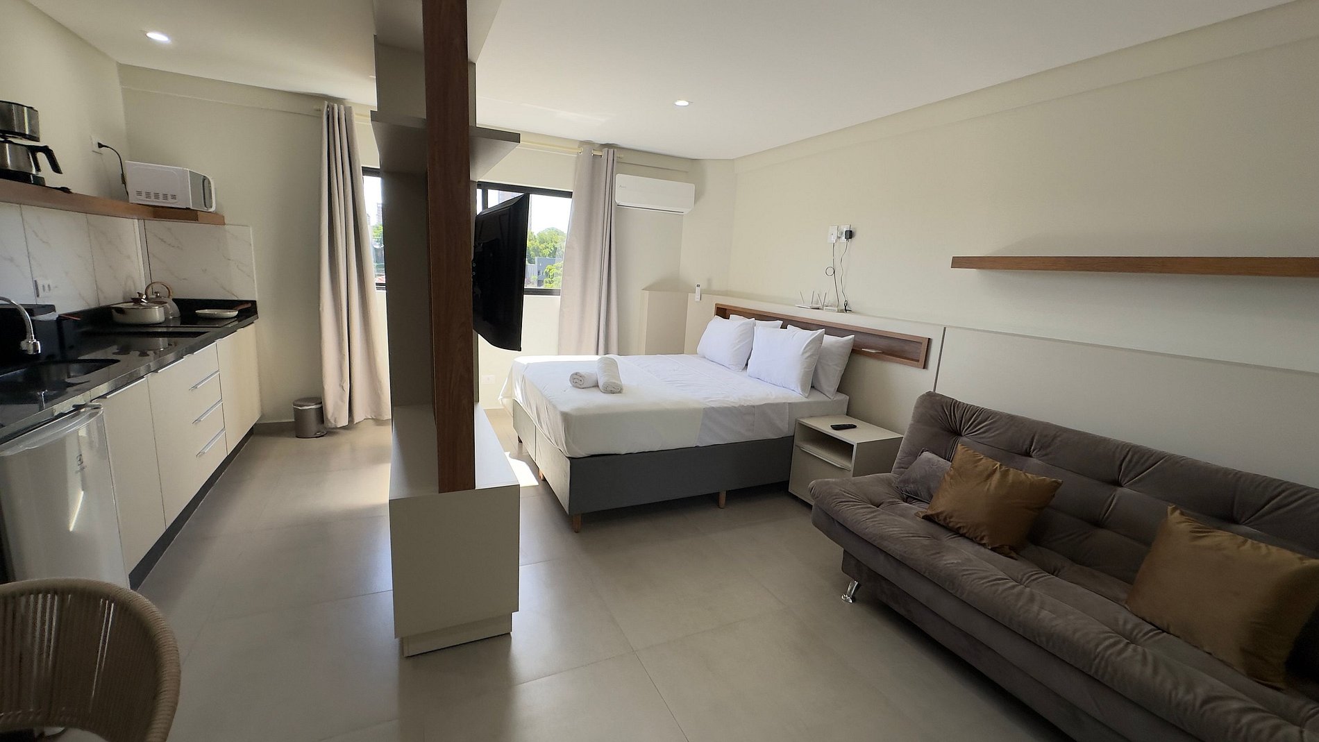 Este estúdio moderno e bem planejado é ideal para quem busca conforto, praticidade e uma excelente localização em Foz do Iguaçu. O espaço é compacto, funcional e muito bem iluminado, com mobiliário contemporâneo e acabamento de qualidade, pensado tanto para estadias curtas quanto mais longas.
