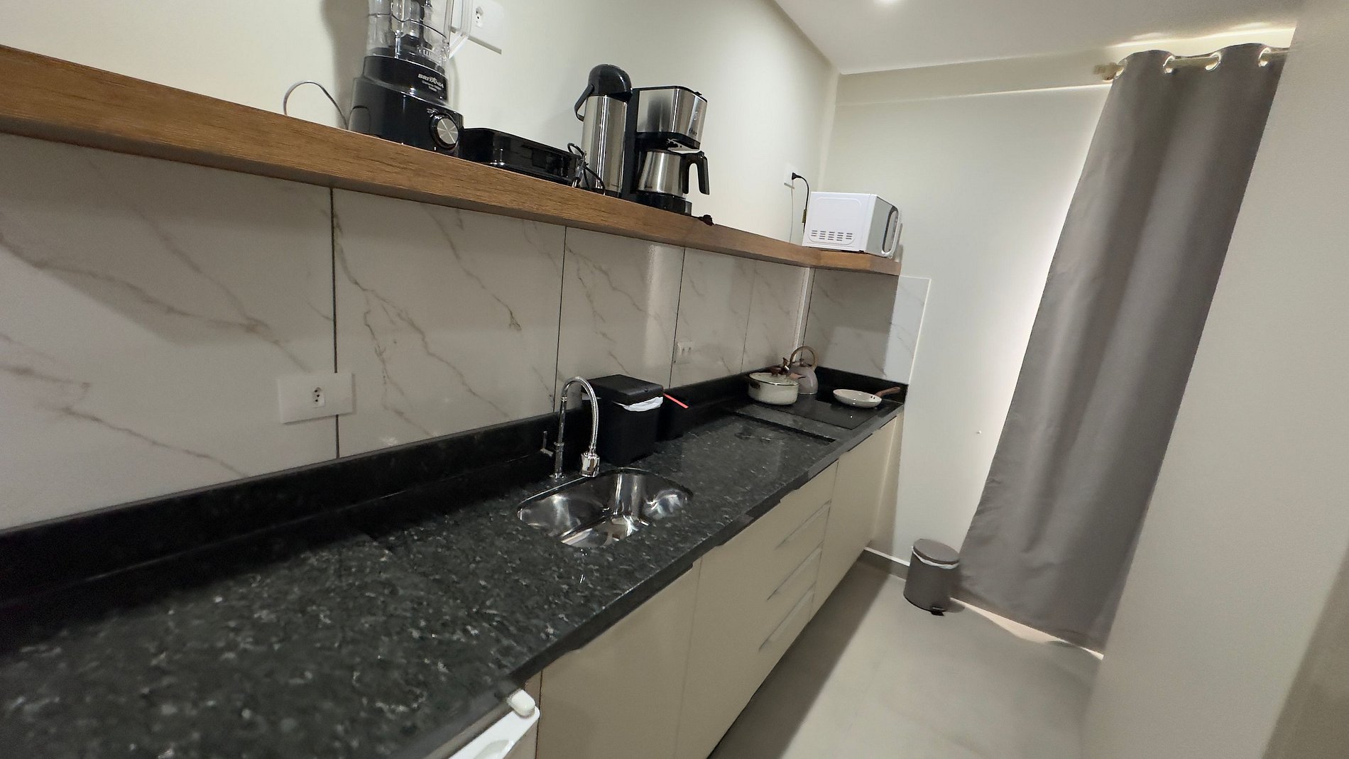 A cozinha é equipada para refeição do dia a dia, com frigobar, cooktop, micro-ondas, pia e utensílios básicos para preparo de refeições rápidas. Há também uma mesa com cadeiras, ideal para refeições ou apoio para trabalho. O banheiro é bem ventilado, com bancada em granito, ducha eficiente e itens essenciais para a estadia.