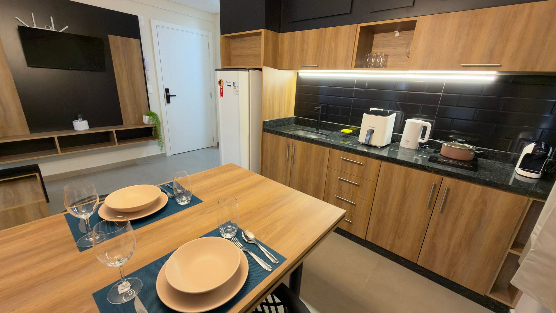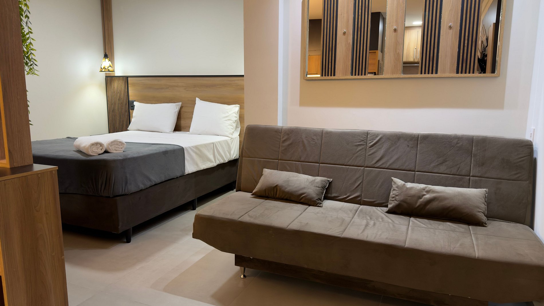 O ambiente integra dormitório, sala e cozinha de forma inteligente. A área de descanso conta com cama confortável tamanho queen, enxoval completo e ar-condicionado, garantindo noites tranquilas. A sala possui sofá cama que comporta uma pessoa, Smart TV e um espaço agradável para relaxar após um dia de passeios ou compras.