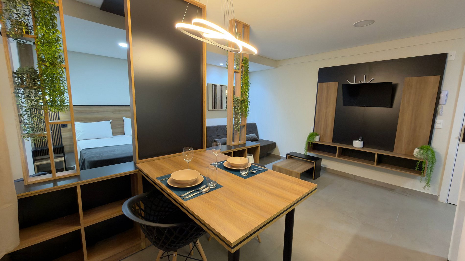 Este estúdio moderno oferece conforto, praticidade e ótima localização em Foz do Iguaçu. O espaço é compacto, funcional e bem iluminado, com mobília contemporânea e acabamento de qualidade, ideal para estadias de qualquer duração.