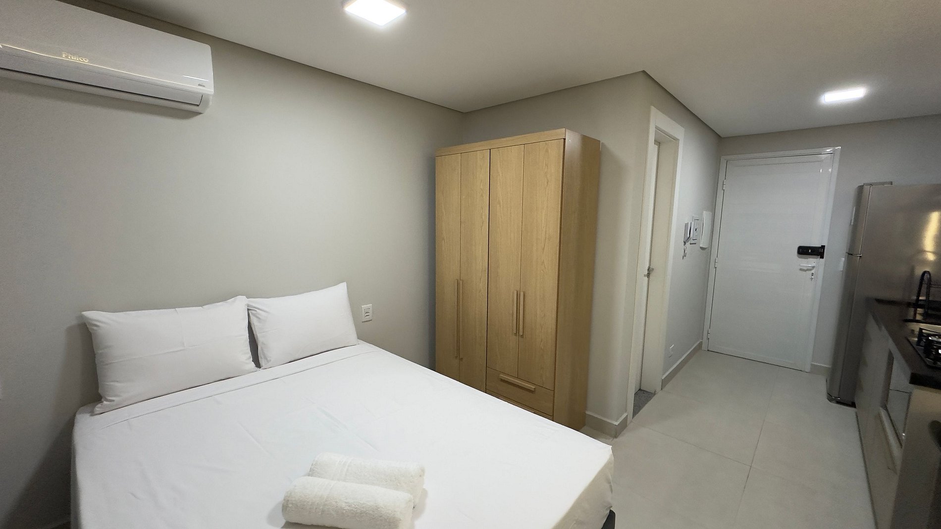 O apartamento é um estúdio moderno e confortável, com uma cama de casal, cozinha equipada e um banheiro com ducha elétrica. O prédio é novo, conta com fechadura eletrônica e um acesso prático e tecnológico, garantindo segurança e comodidade.