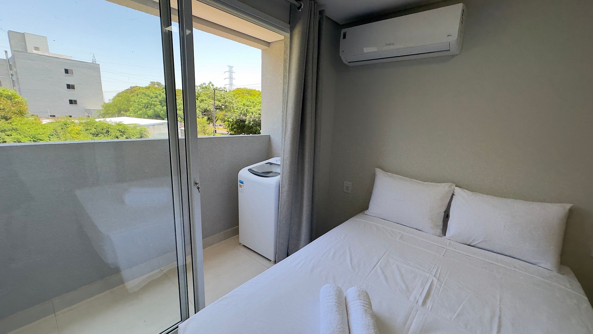 O apartamento é um estúdio moderno e confortável, com uma cama de casal, cozinha equipada e um banheiro com ducha elétrica. O prédio é novo, conta com fechadura eletrônica e um acesso prático e tecnológico, garantindo segurança e comodidade. Além disso, o apartamento possui uma vaga de garagem coberta para veículos de tamanho padrão.