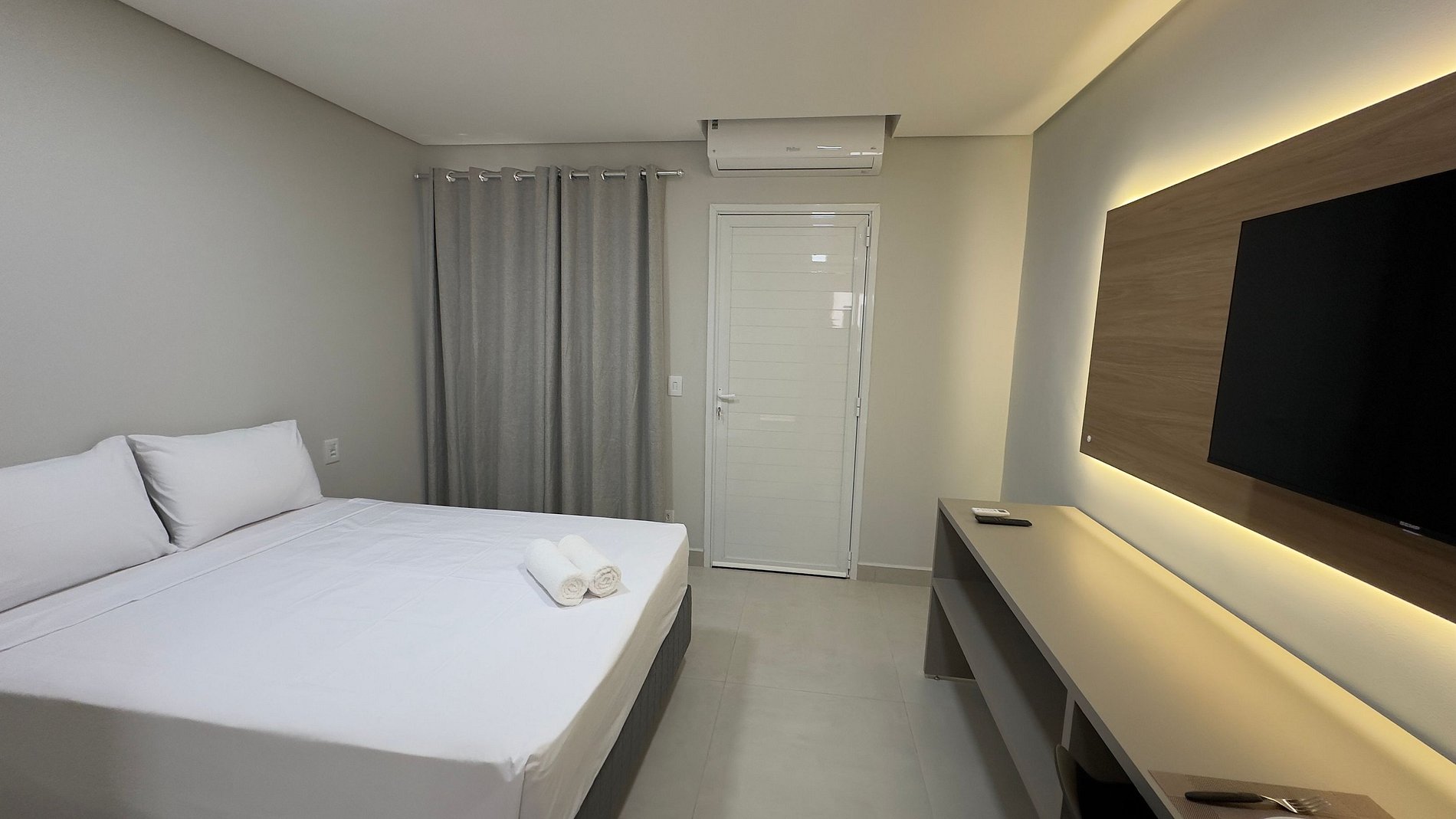 O apartamento é um estúdio moderno e confortável, com uma cama de casal, cozinha equipada e um banheiro com ducha elétrica. O prédio é novo, conta com fechadura eletrônica e um acesso prático e tecnológico, garantindo segurança e comodidade.