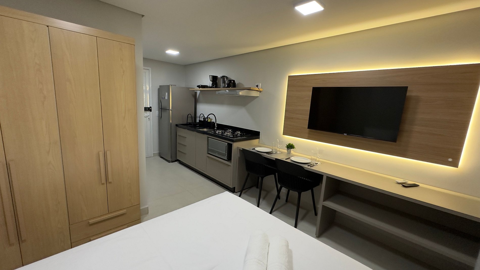 O apartamento é um estúdio moderno e confortável, com uma cama de casal, cozinha equipada e um banheiro com ducha elétrica. O prédio é novo, conta com fechadura eletrônica e um acesso prático e tecnológico, garantindo segurança e comodidade.