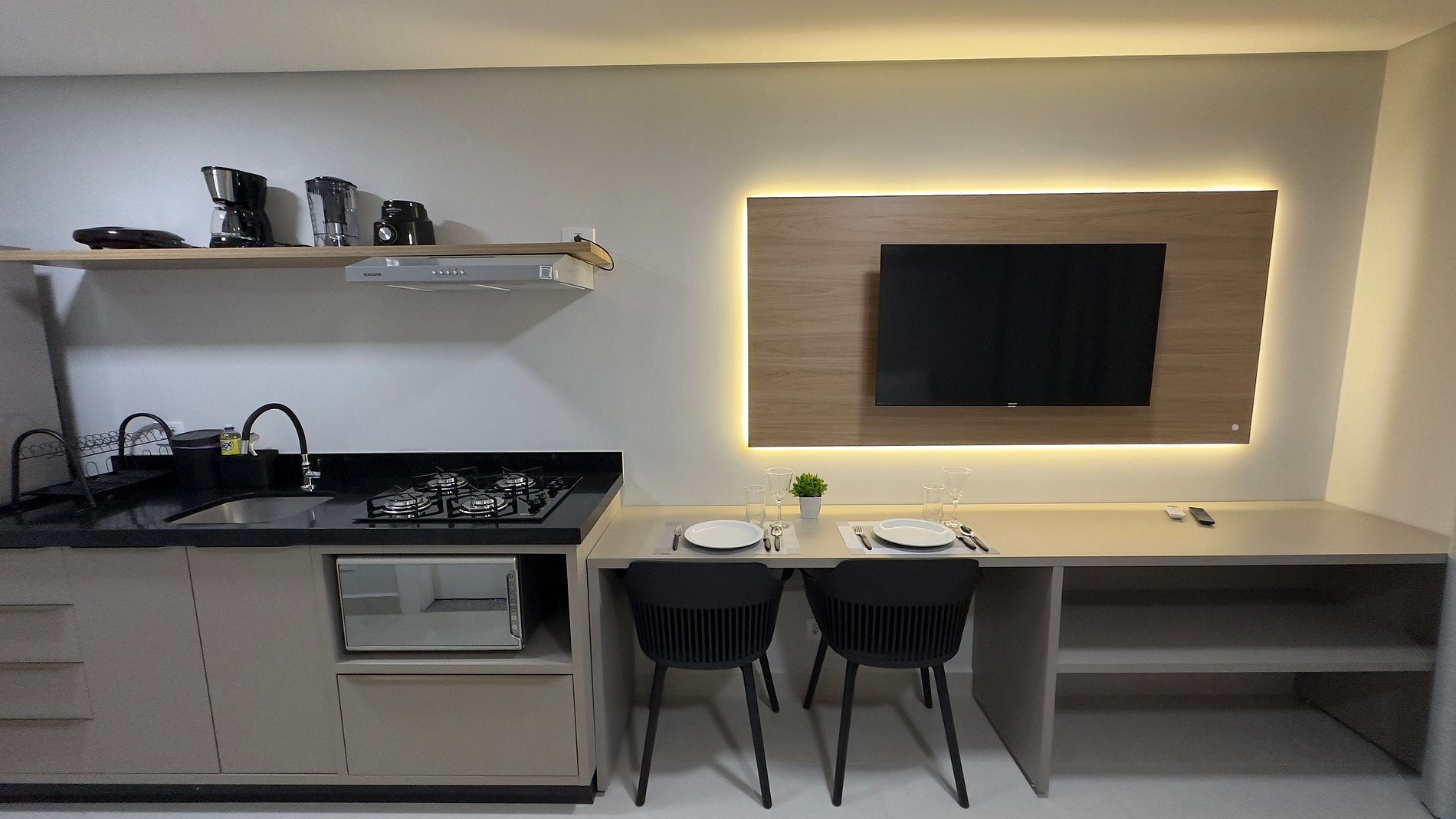 O apartamento térreo e compacto, mas extremamente funcional, com uma cama de casal padrão, cozinha equipada com utensílios do dia a dia, banheiro com ducha elétrica, banheiro com chuveiro elétrico, mesa para trabalhos, além de um ambiente moderno e bem decorado. O prédio é novo e conta com fechadura eletrônica, garantindo praticidade no acesso, além de entrada totalmente tecnológica e segura.