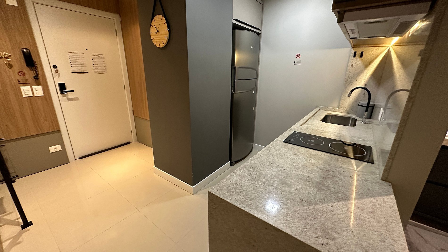 O espaço conta com: - 01 quarto com cama casal queen e armários; - 01 sala com sofá cama CONFORTÁVEL para até 01 adulto; - - 01 banheiro com ducha elétrica; - Itens de cozinha para refeições do dia a dia; - Wi-fi . Equipamentos: - Ar condicionado no quarto e sala que refrigera todo o espaço; - Geladeira, fogão 2 bocas de indução (elétrico), micro-ondas, liquidificador, cafeteira, sanduicheira, chaleira e forno elétricos, ferro a vapor, depurador de ar - TV Smart , com sinal de TV digital e NETFLIX ( Usuário não fornecido); - Enxoval de cama e banho; - Enxoval de cozinha com taças de vinho , jogo de panelas , jogo de jantar e café completo, jogo de talheres e demais utensílios;