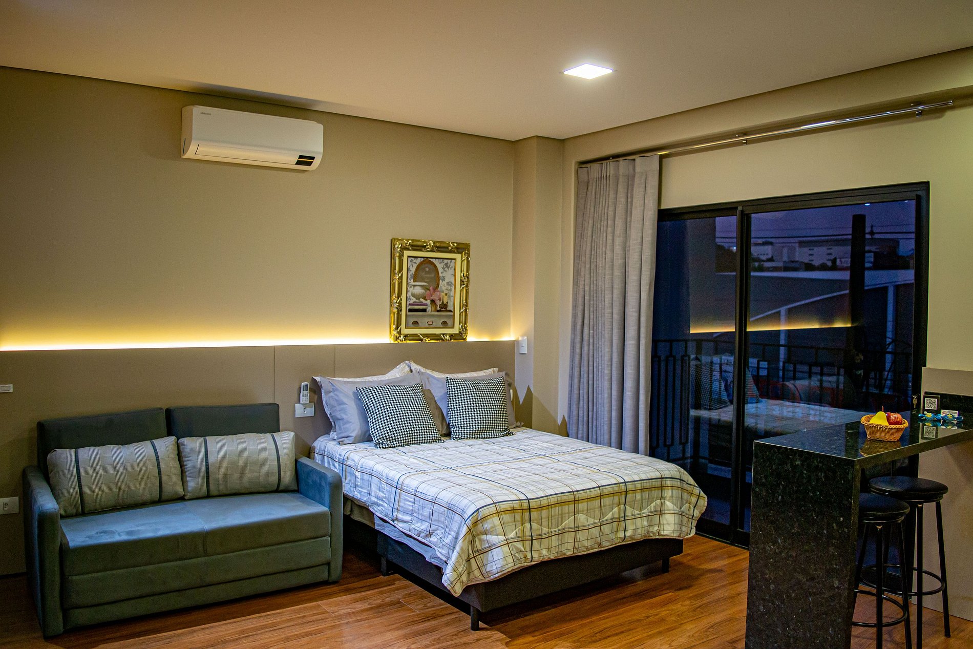 Seus apartamentos contam com cozinha equipada, Smart tv, cama confortável, ar-condicionado que refrigeram todo o espaço, central de trabalho/estudos, enxoval de cama e banho.