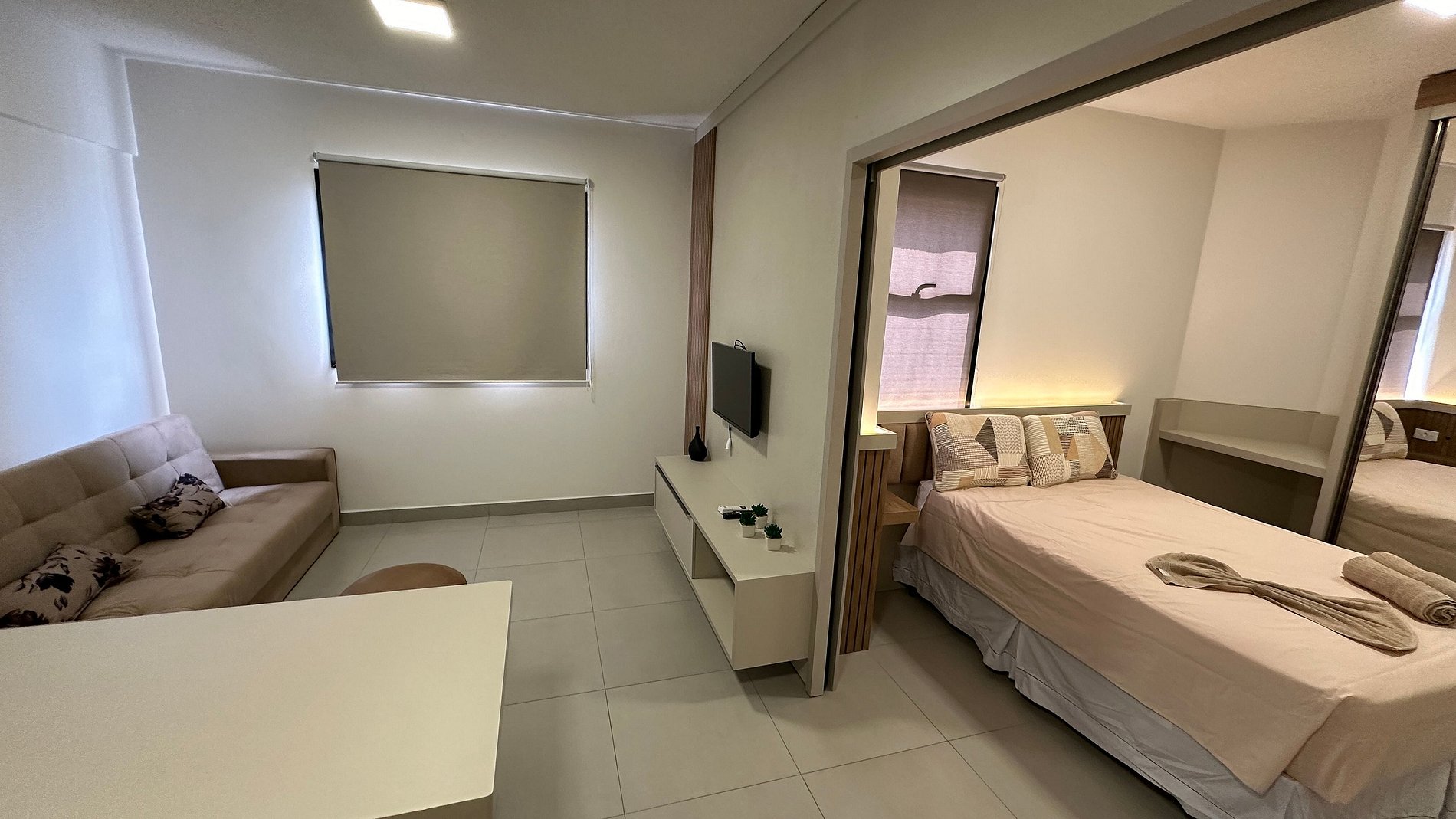 O apartamento contém uma cama de casal e um sofá cama na sala. Assim comportando 03 pessoas confortavelmente.