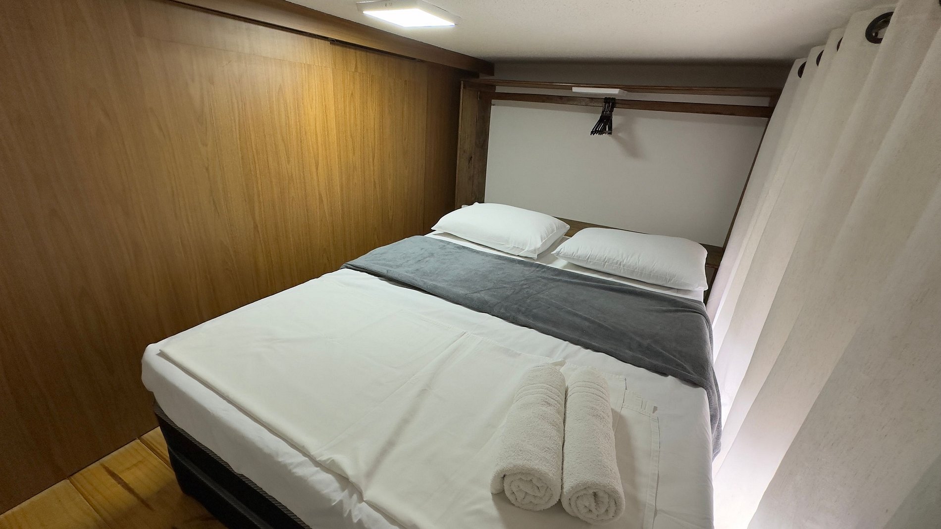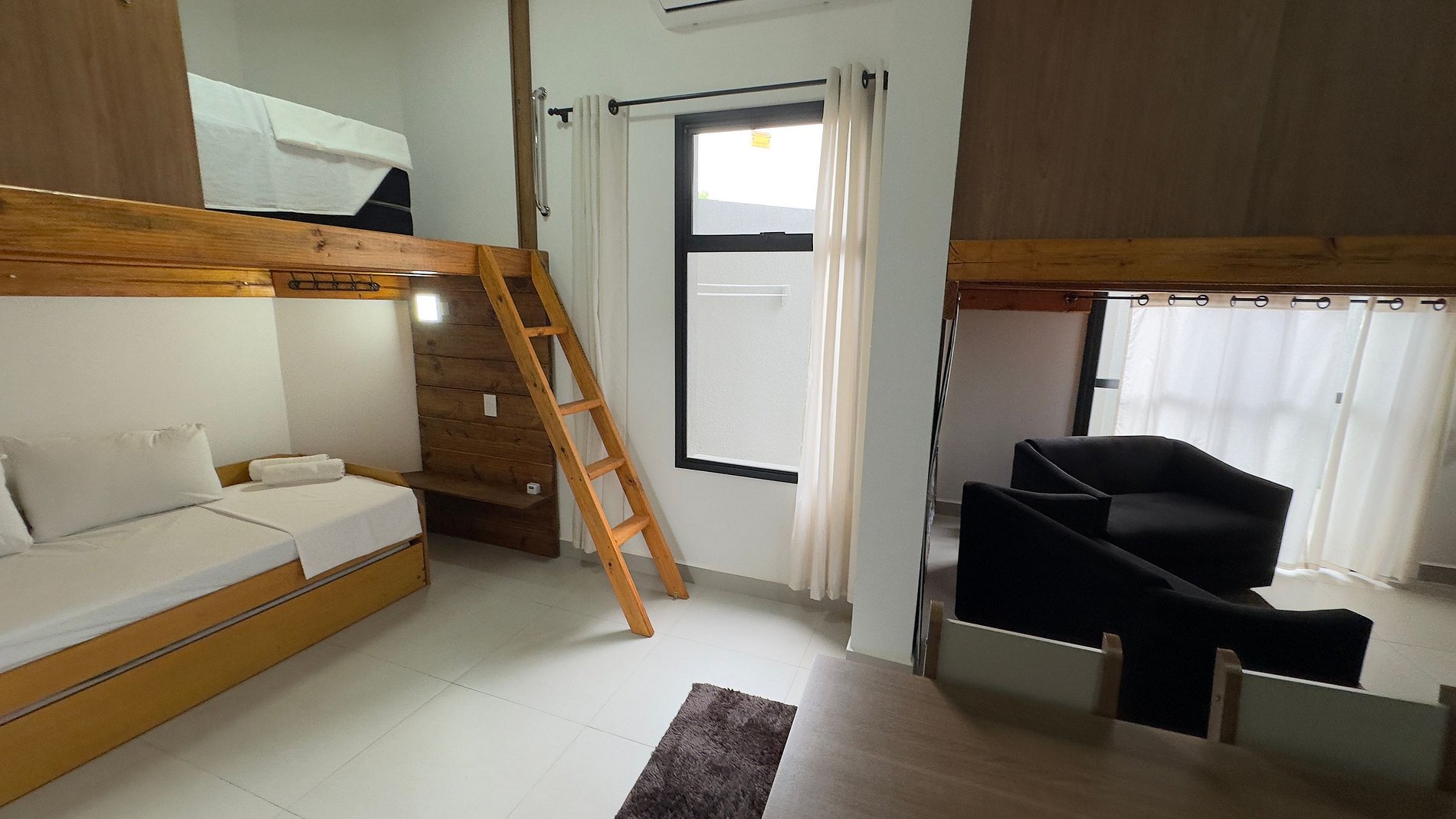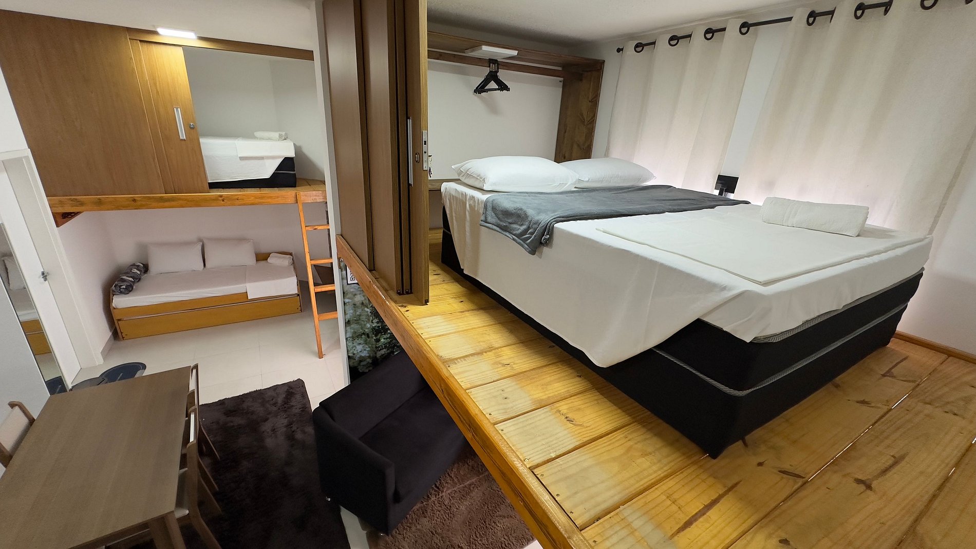 Os quartos ficam no mezanino tendo acesso por escadas e as camas de solteiro no térreo. Todos de fácil acesso e com privacidade.