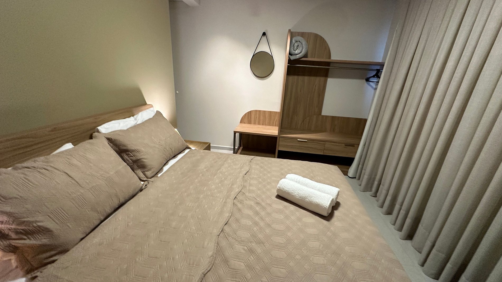 - 01 quarto com cama queen e armário conceito aberto;