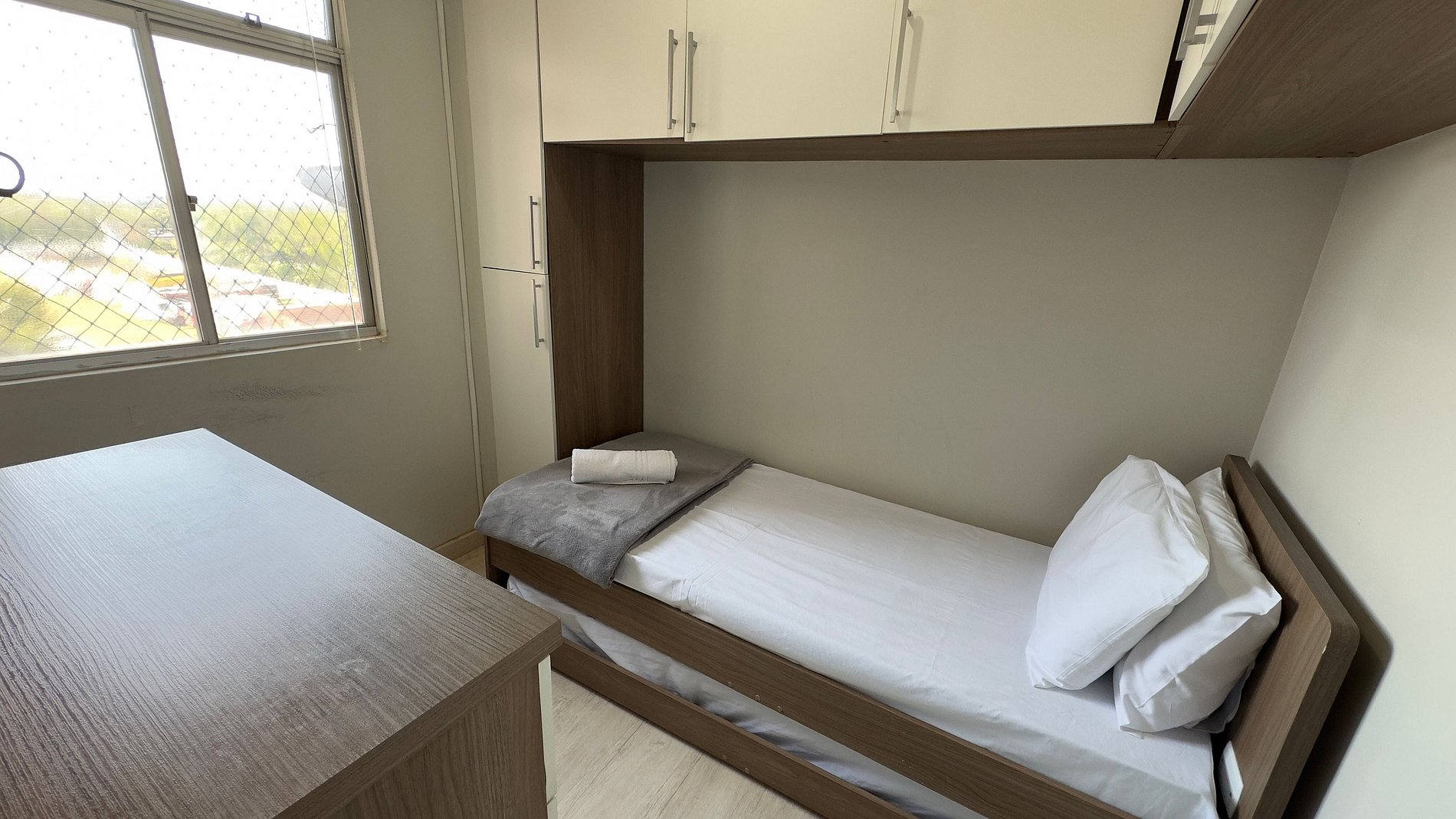 - 02 quartos. (01 contendo uma cama de casal e outro com duas camas de solteiro ( Bi cama) - precisando locomover móveis do quarto para montagem.)