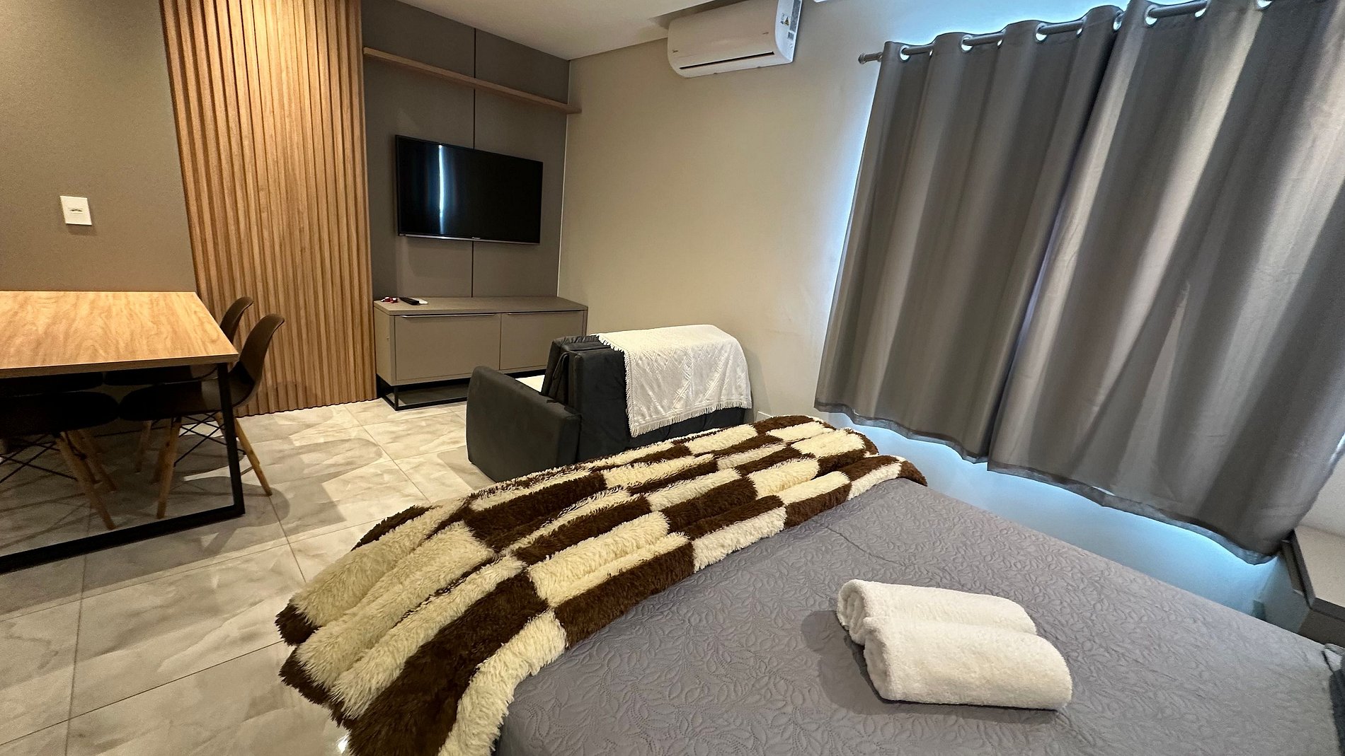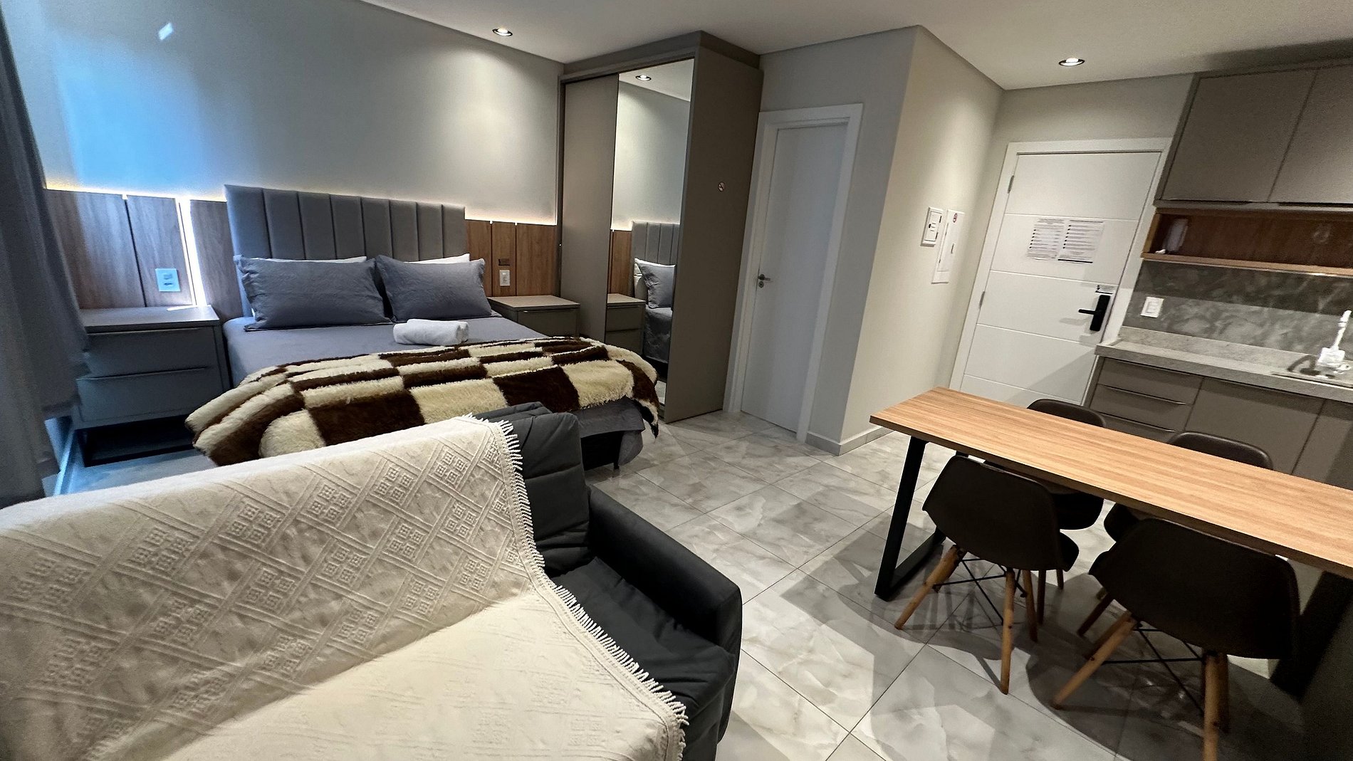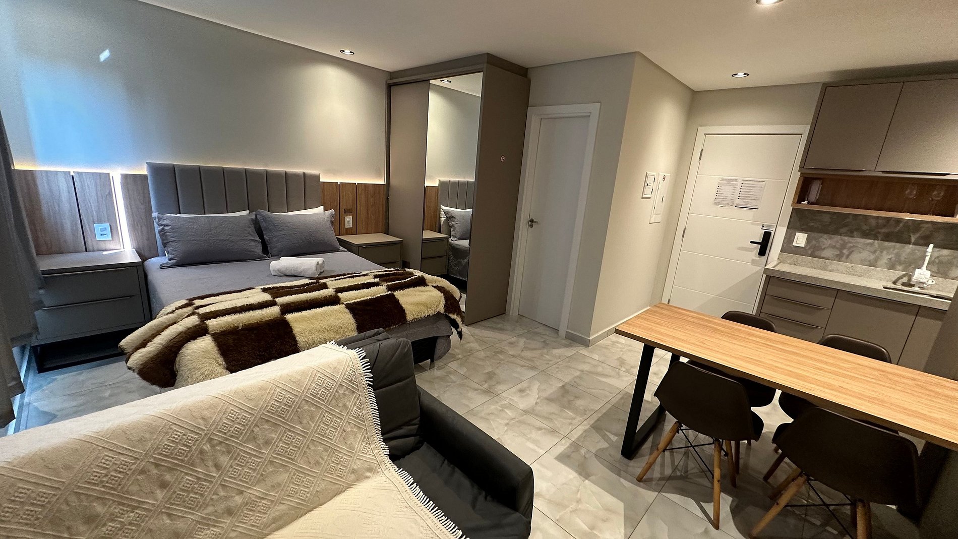- 01 quarto com cama casal e armários; ( O apartamento tem o conceito aberto, ou seja, integra um único ambiente) ;