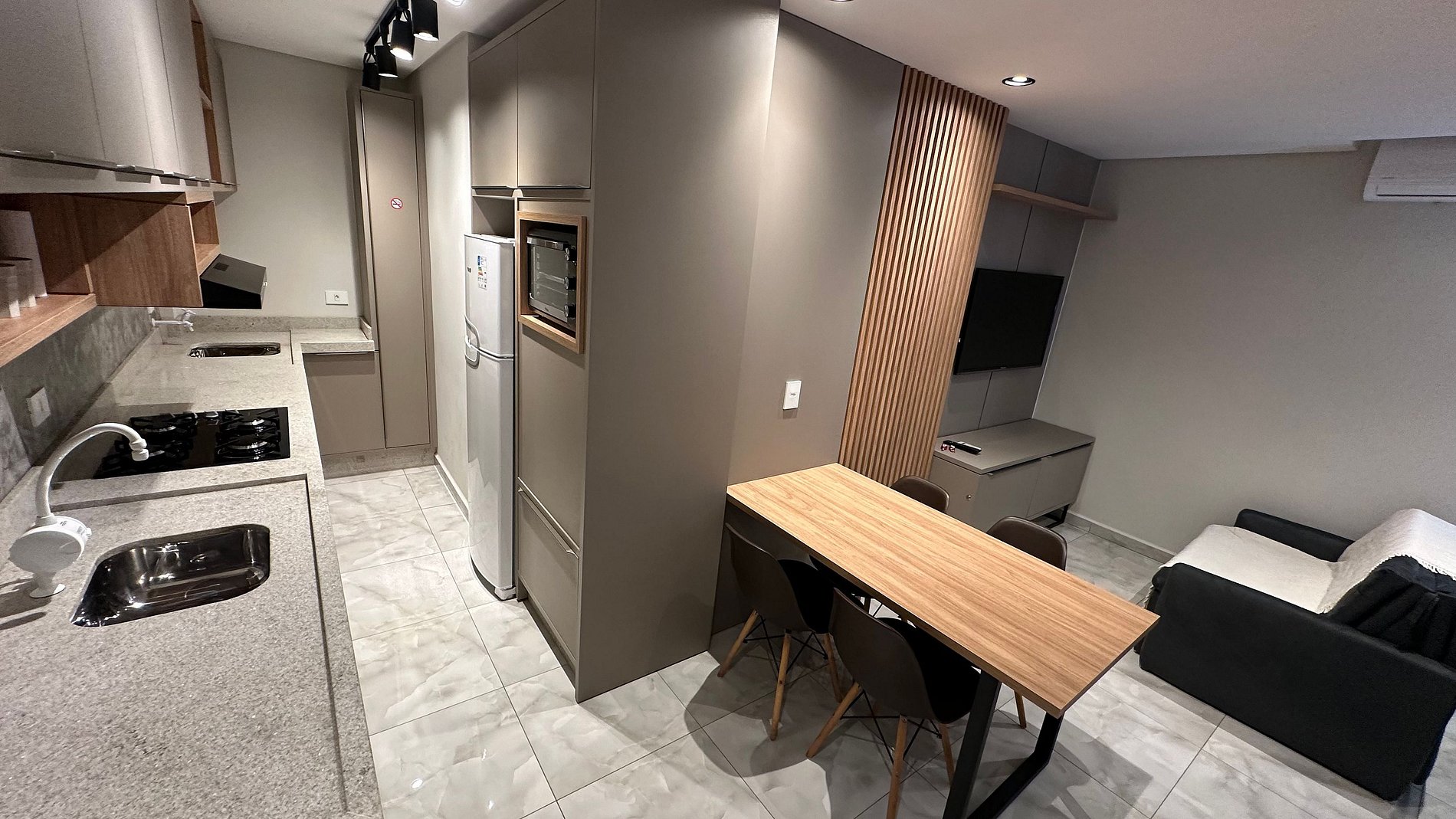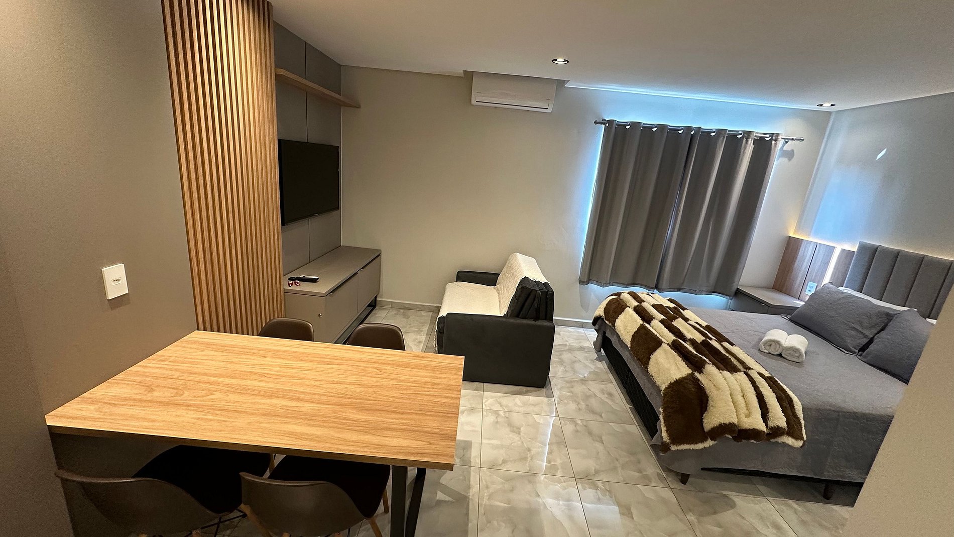 - 01 quarto com cama casal e armários; ( O apartamento tem o conceito aberto, ou seja, integra um único ambiente) ;