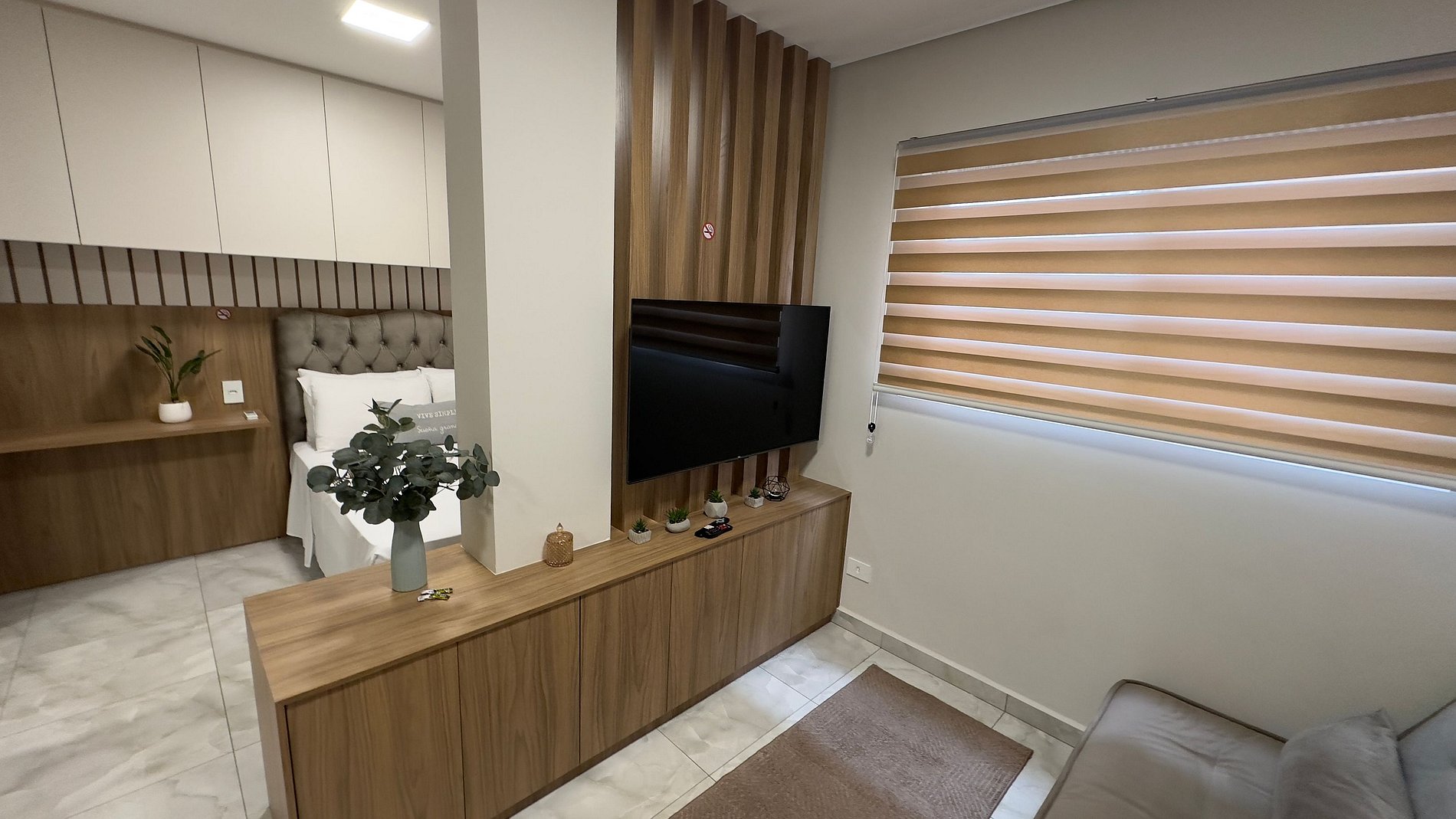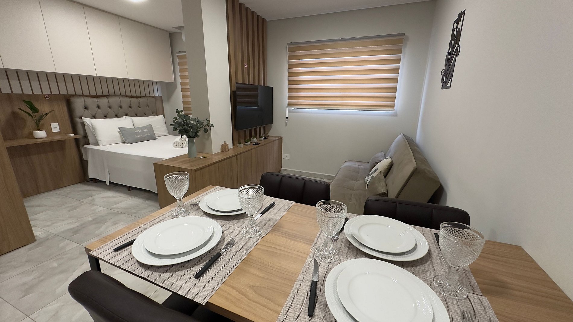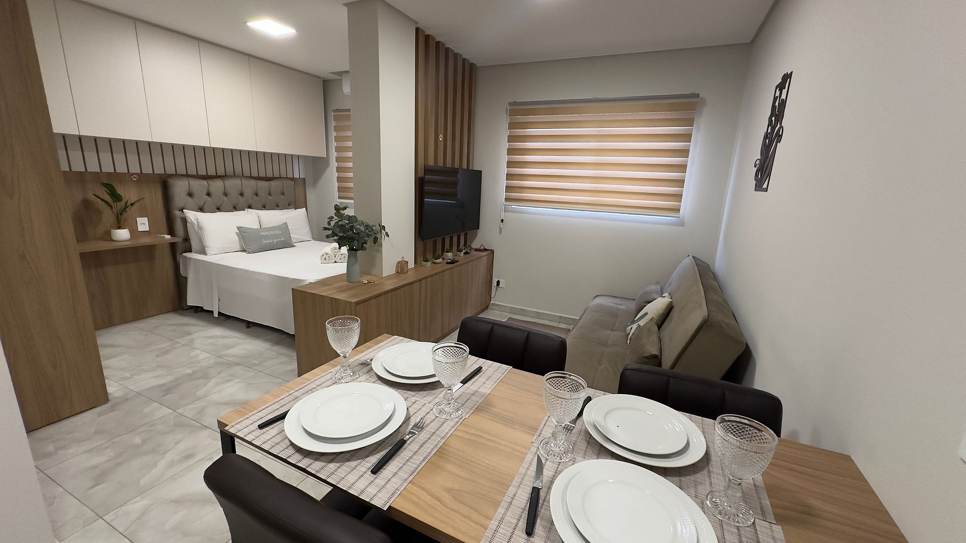 - 01 quarto com cama casal e armários; ( O apartamento tem o conceito aberto, ou seja, integra um único ambiente) ;