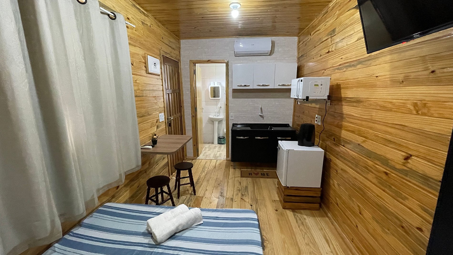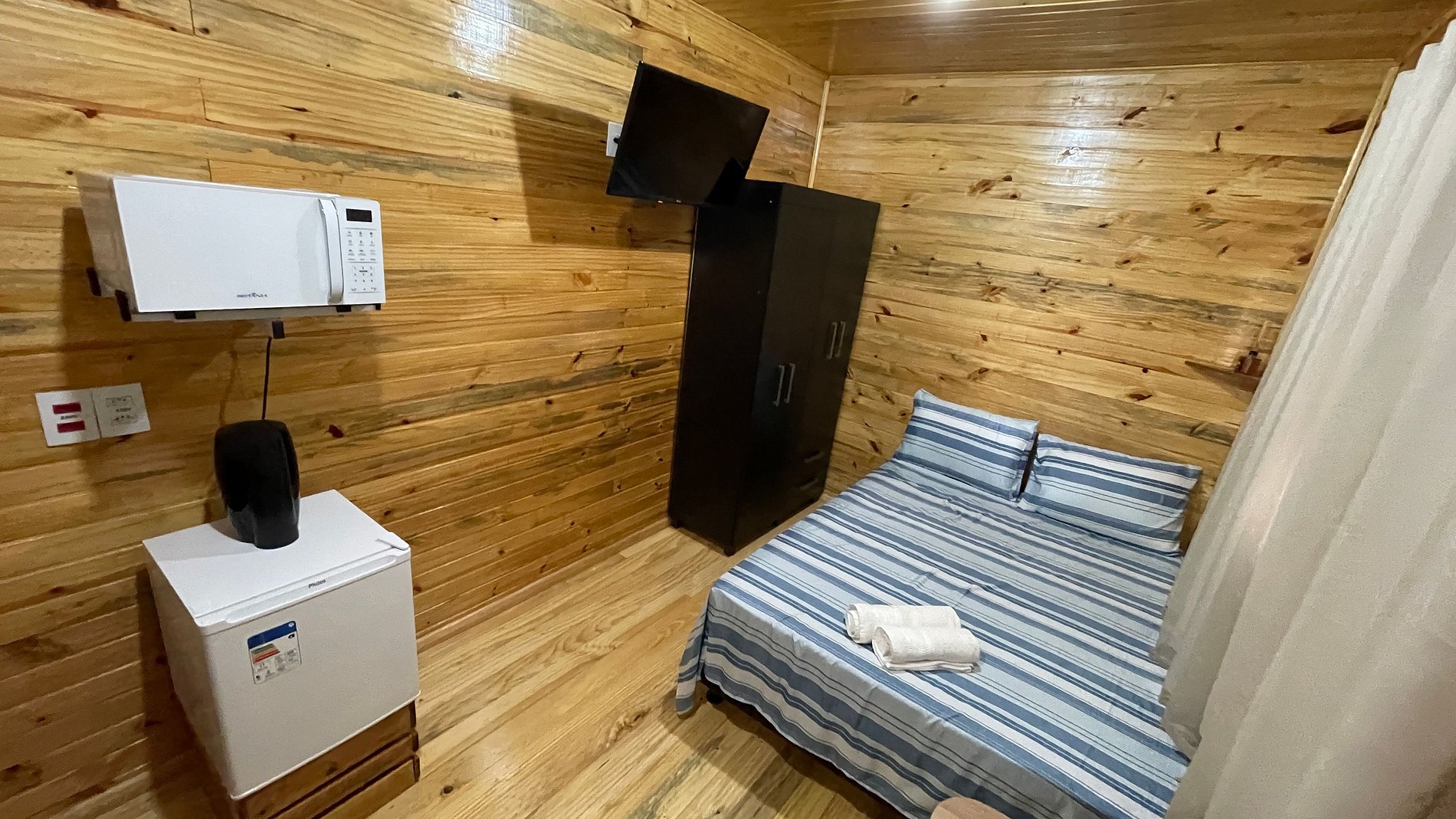 O Chalé contém cama casal, Tv, decoração rústica e banheiro completo.