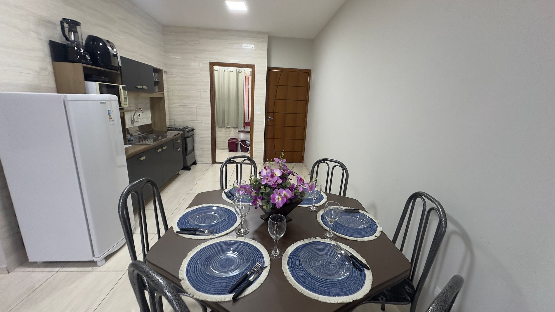 Equipamentos: - Ar condicionado nos quartos e sala; - Geladeira, fogão 4 bocas,, cafeteira, chaleira, ferro a vapor; - TV Smart, com sinal locais abertos e NETFLIX ( usuário não disponível); - Enxoval de cama e banho; - Enxoval de cozinha com taças de vinho, jogo de panelas , jogo de jantar e café completo, jogo de talheres e demais utensílios;