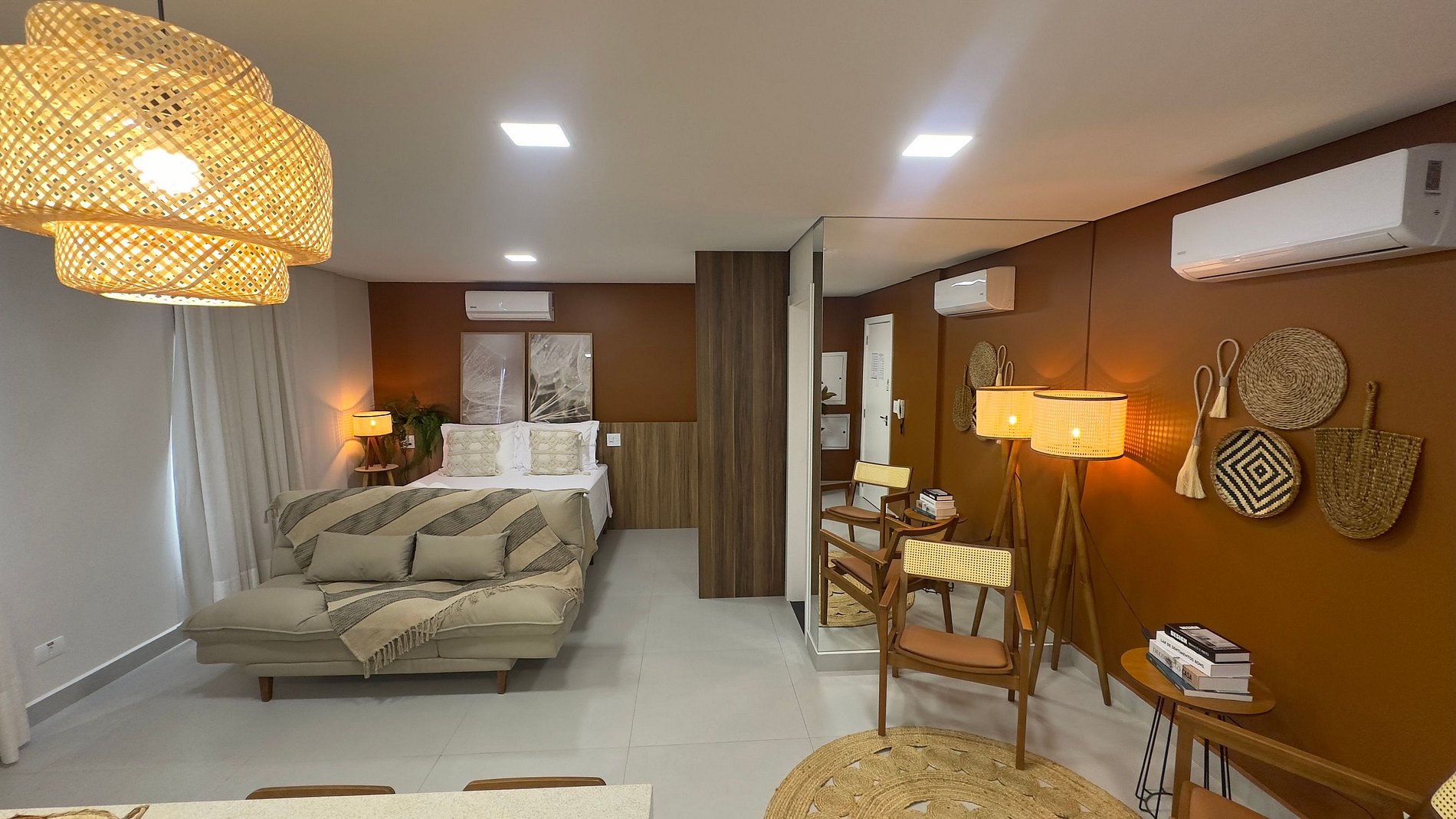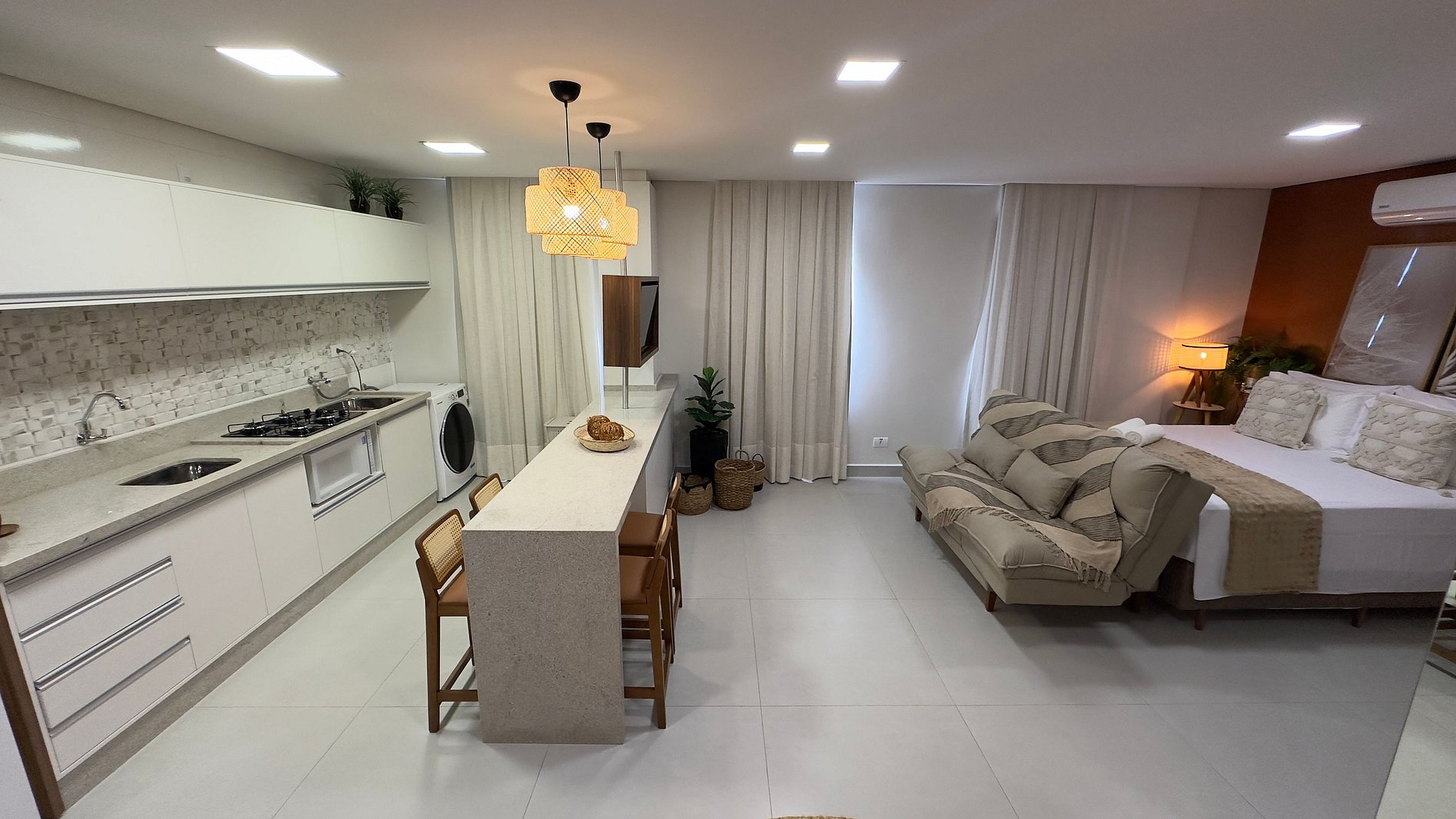 Sua localização por ser no centro de Foz possibilita acesso rápido e fácil aos principais pontos turísticos da cidade por meio de transporte público, dentre outros. O espaço de ambiente integrado com uma cozinha equipada para refeições do dia a dia, 01 cama Queen confortável e sofá cama. Assim comportando até 04 pessoas confortavelmente. 01 social com ducha higiênica e chuveiro elétrico, wifi , ambiente climatizado com ar condicionado potente com função frio e quente, área de lavanderia com lava e seca, smart tv de 35".
