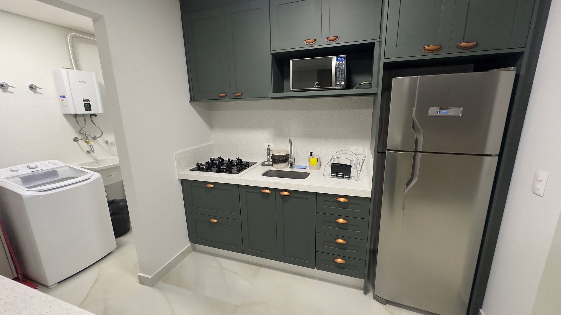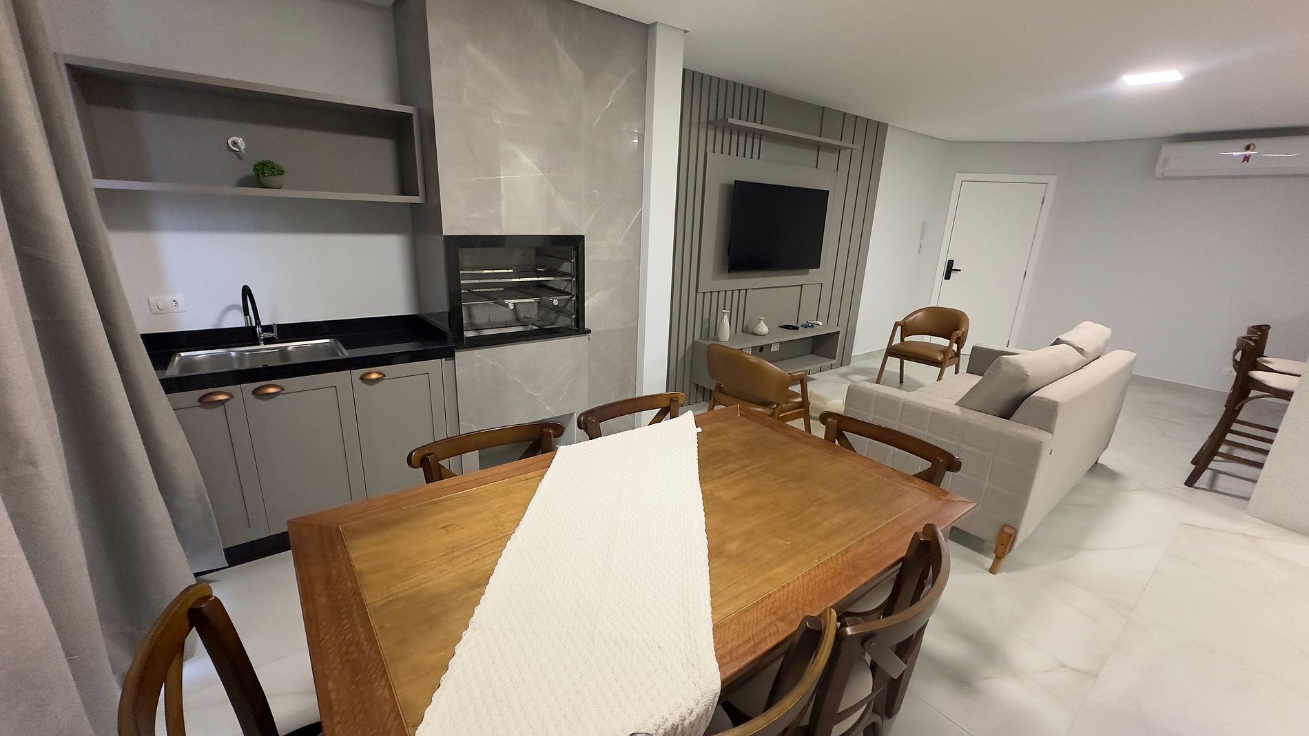 O destaque fica por conta do espaço gourmet com churrasqueira, perfeito para confraternizações e momentos especiais. A cozinha planejada é linda e totalmente equipada com eletrodomésticos, facilitando suas refeições durante a estadia. Além disso, há um espaço de lavanderia com máquina de lavar e tanque para sua conveniência.