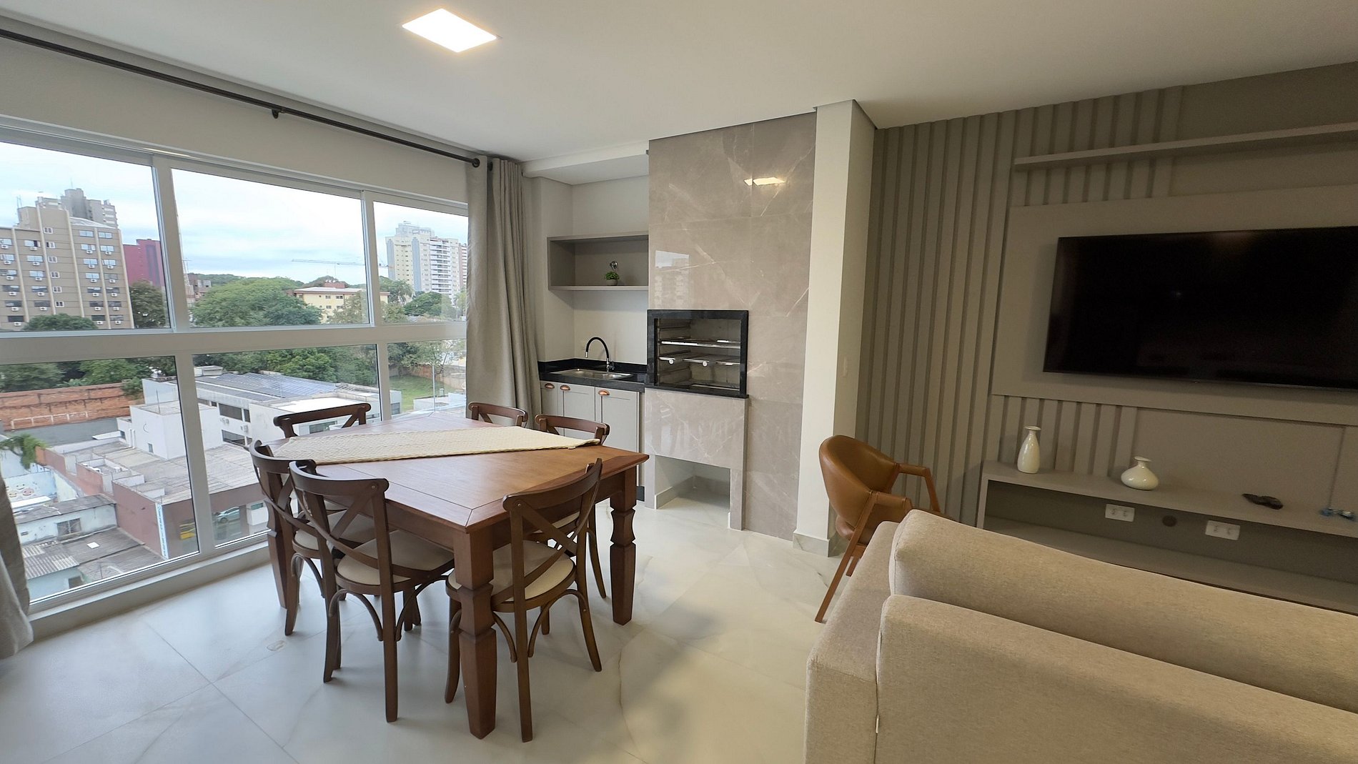 Na sala, você vai encontrar um sofá aconchegante, Smart TV e internet de 300 Mbps para garantir que você esteja sempre conectado.