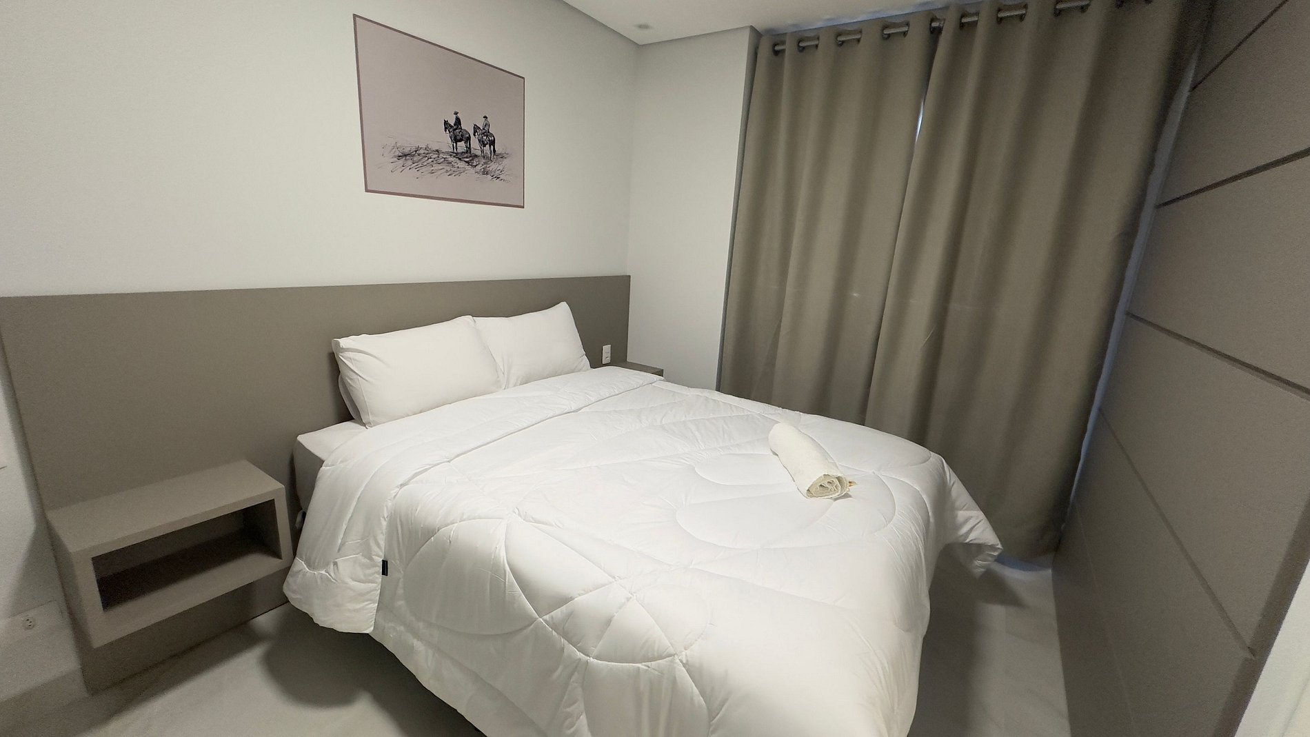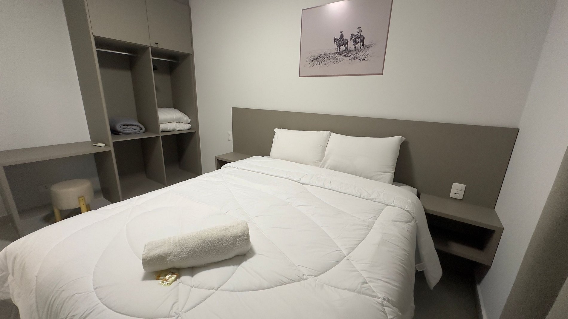 O apartamento dispõe de três quartos, sendo uma suíte com cama queen, outro quarto com cama queen e um terceiro com duas camas de solteiro. Todos os quartos têm móveis planejados, guarda-roupas espaçosos, ar condicionado e uma vista incrível da cidade.
