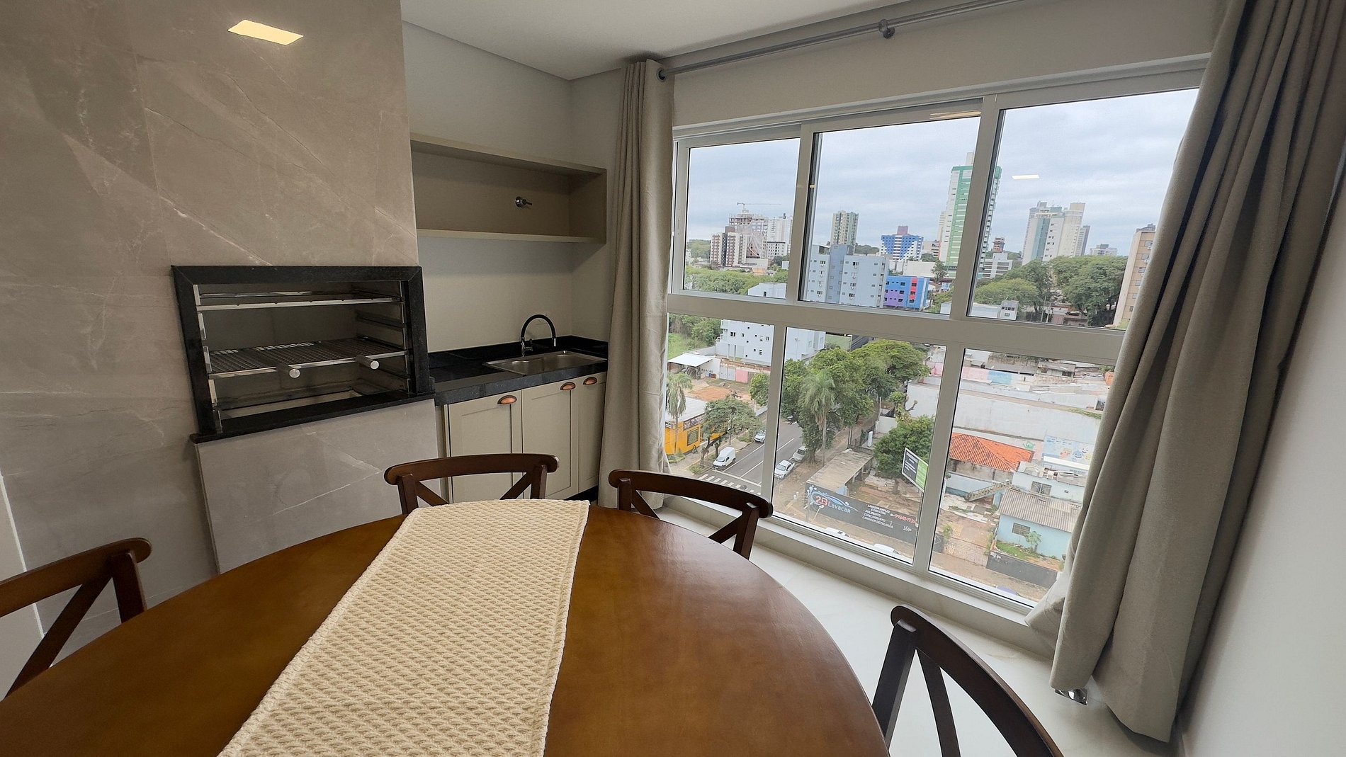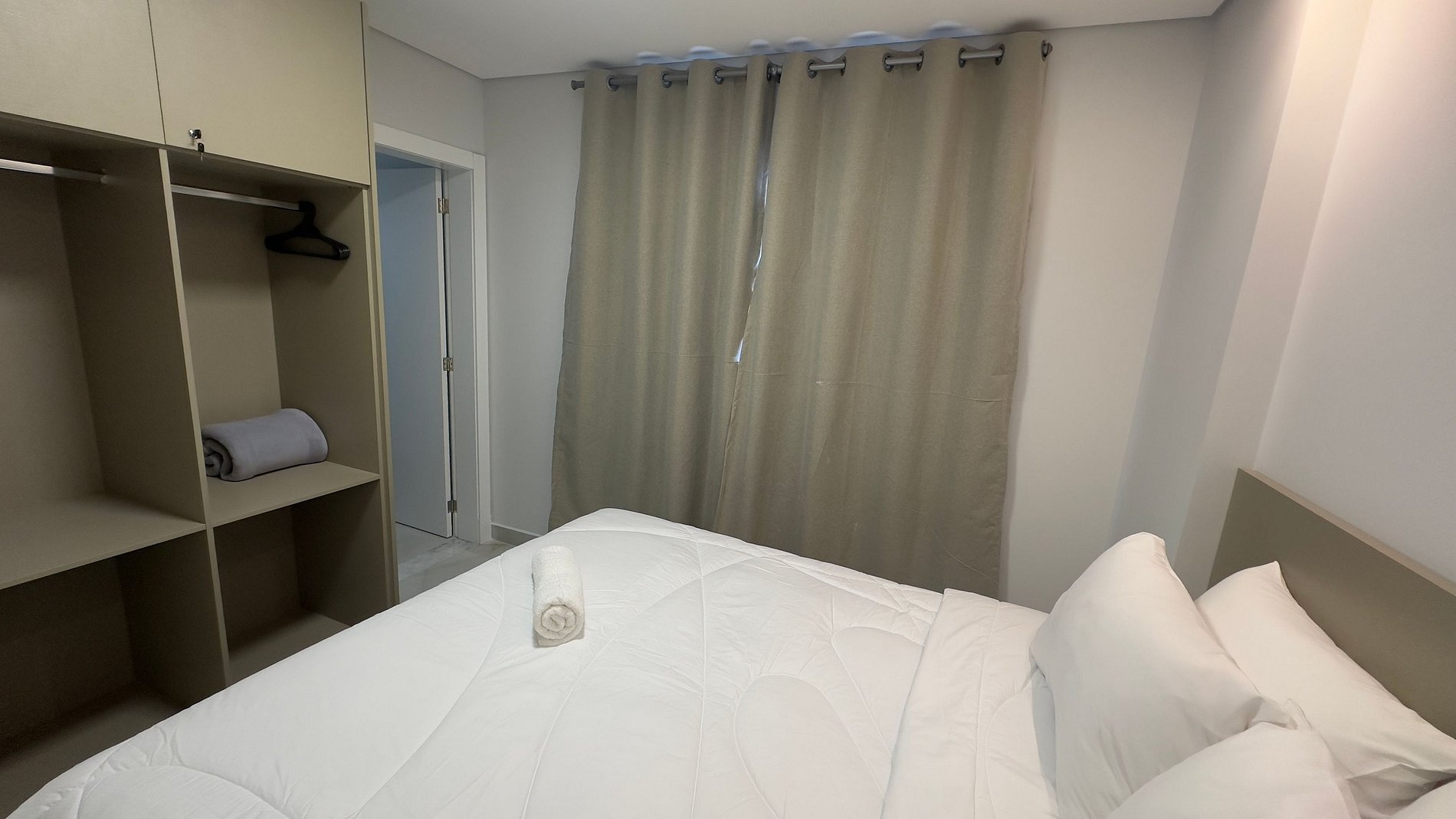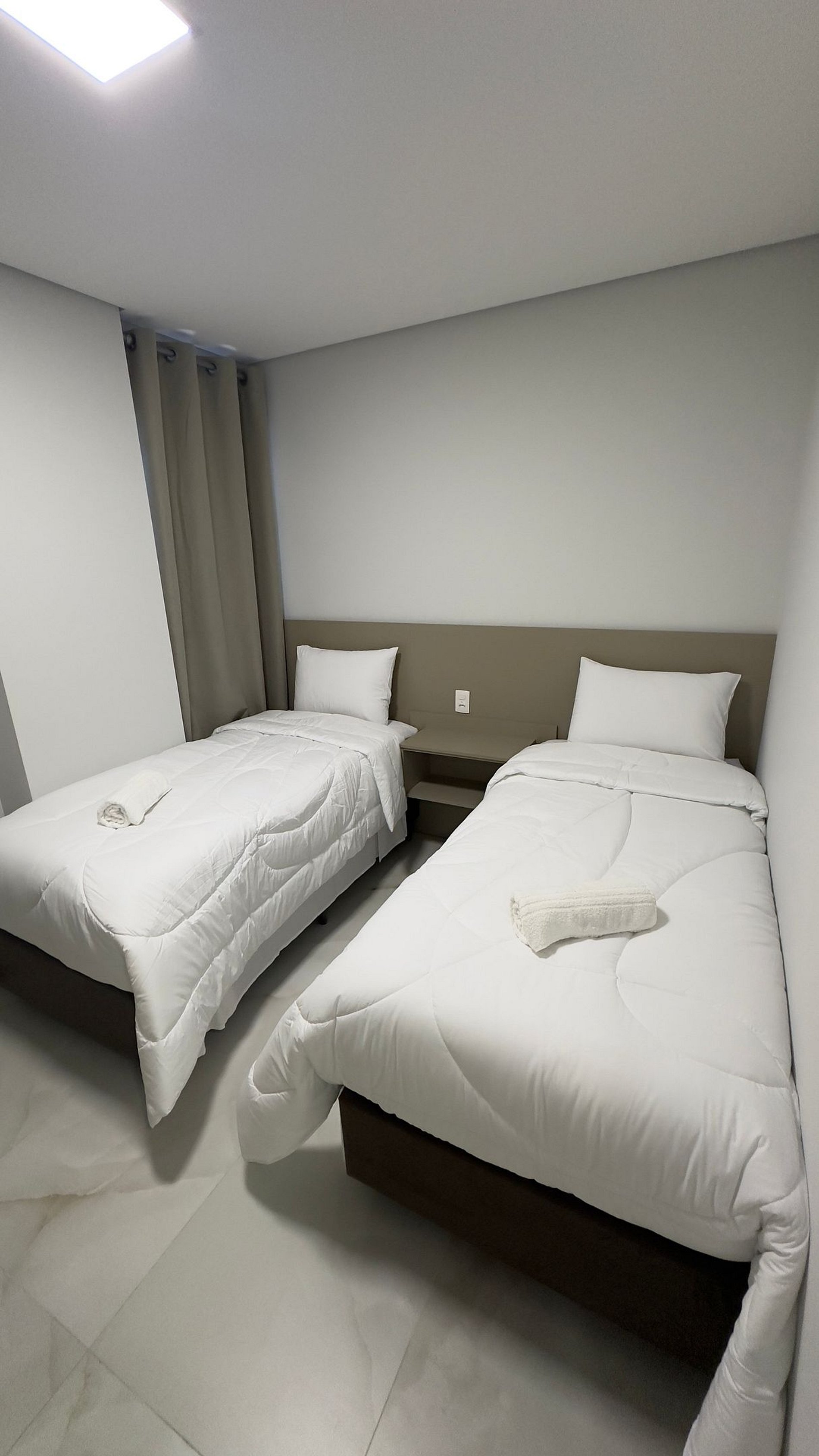O apartamento dispõe de três quartos, sendo uma suíte com cama queen, outro quarto com cama queen e um terceiro com duas camas de solteiro. Todos os quartos têm móveis planejados, guarda-roupas espaçosos, ar condicionado e uma vista incrível da cidade.