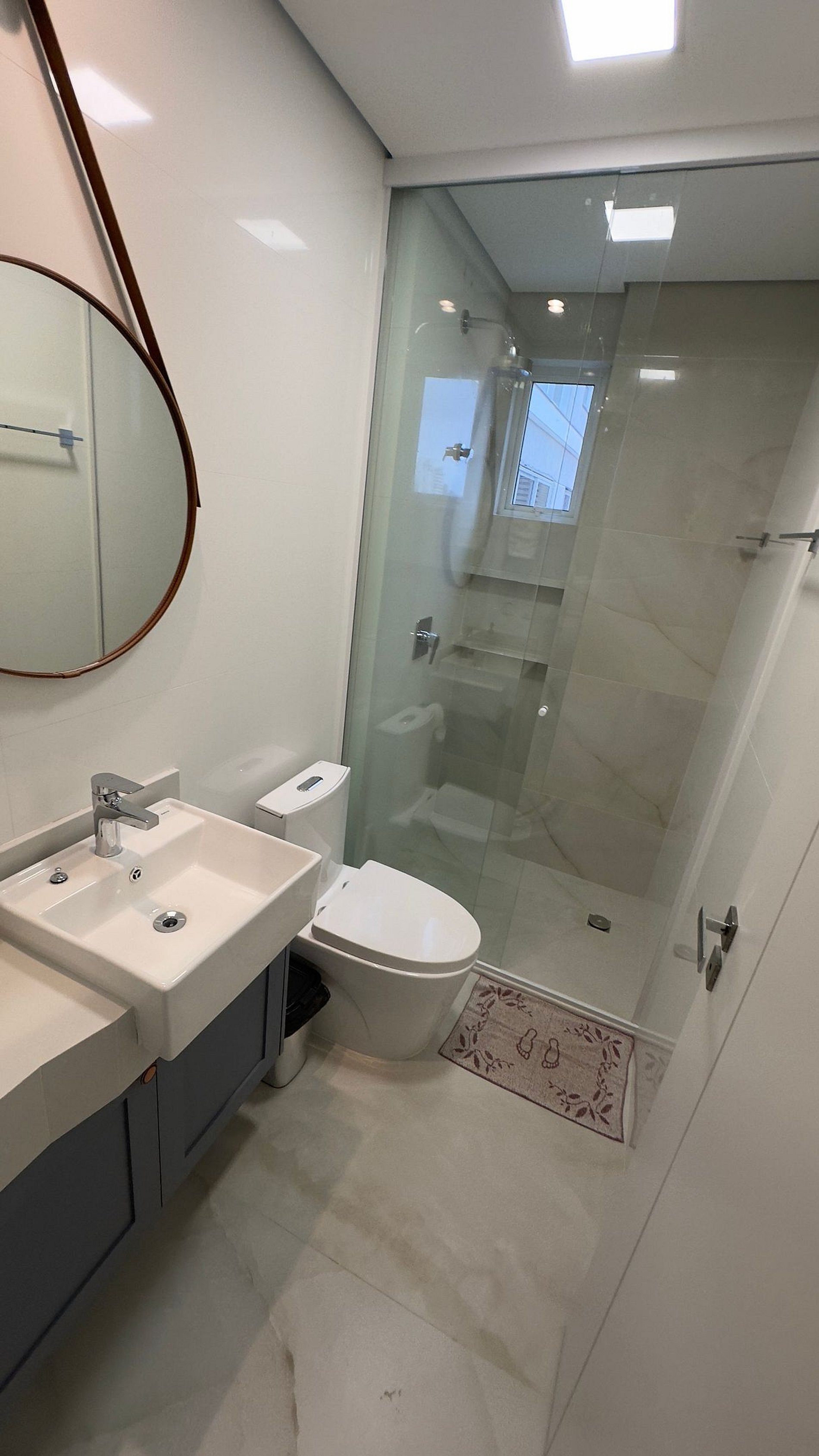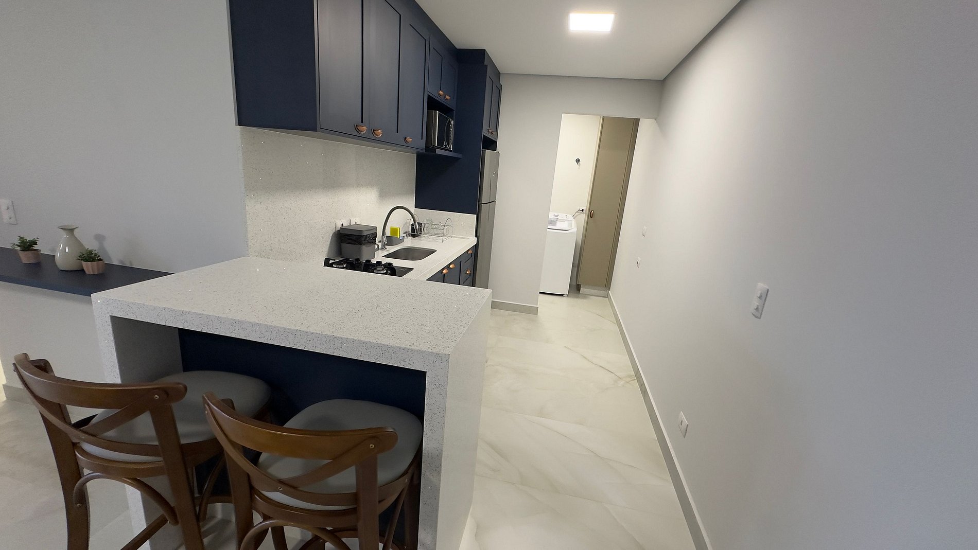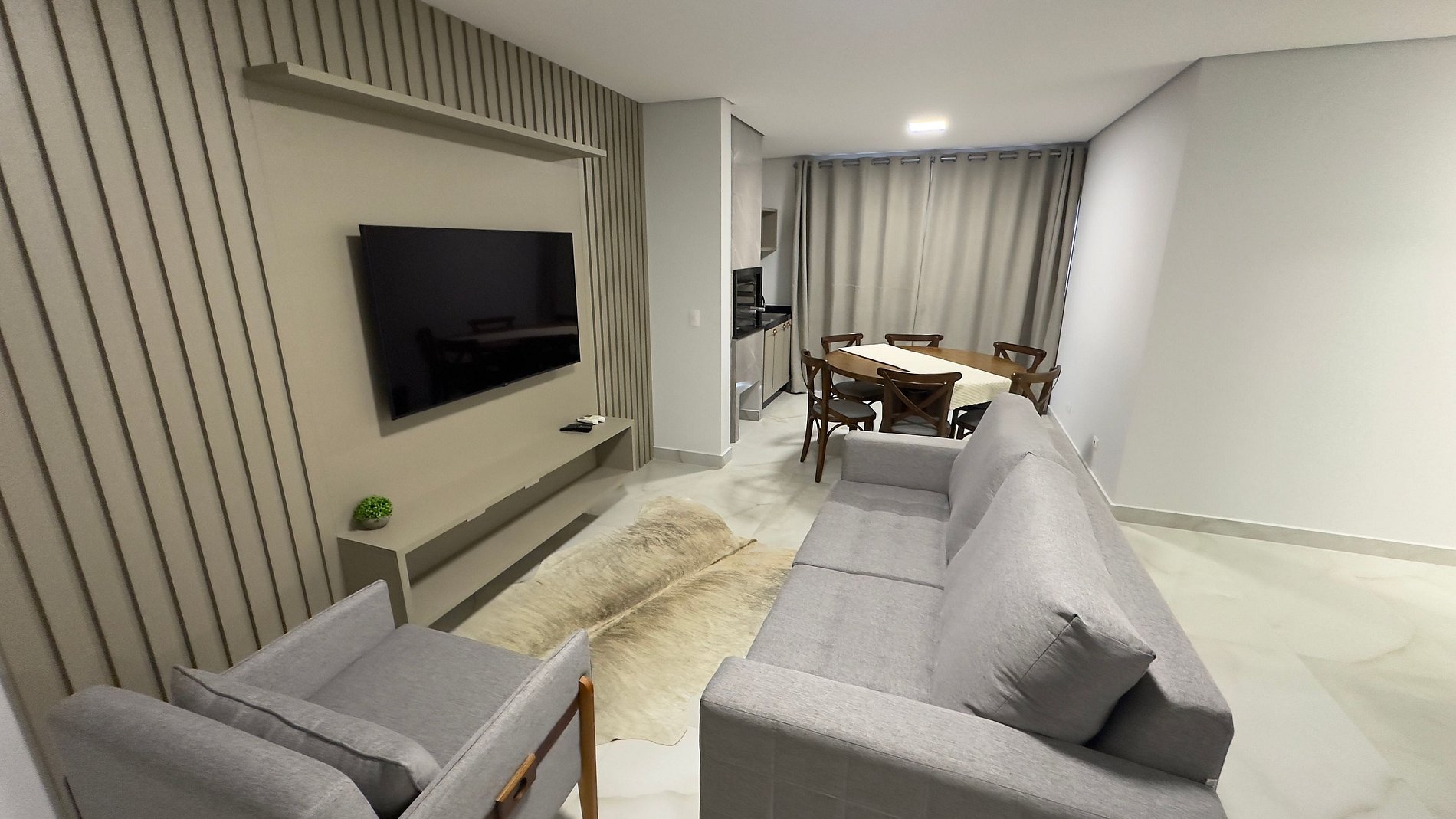 O apartamento dispõe de três quartos, sendo uma suíte com cama queen, outro quarto com cama queen e um terceiro com duas camas de solteiro. Todos os quartos têm móveis planejados, guarda-roupas espaçosos, ar condicionado e uma vista incrível da cidade.