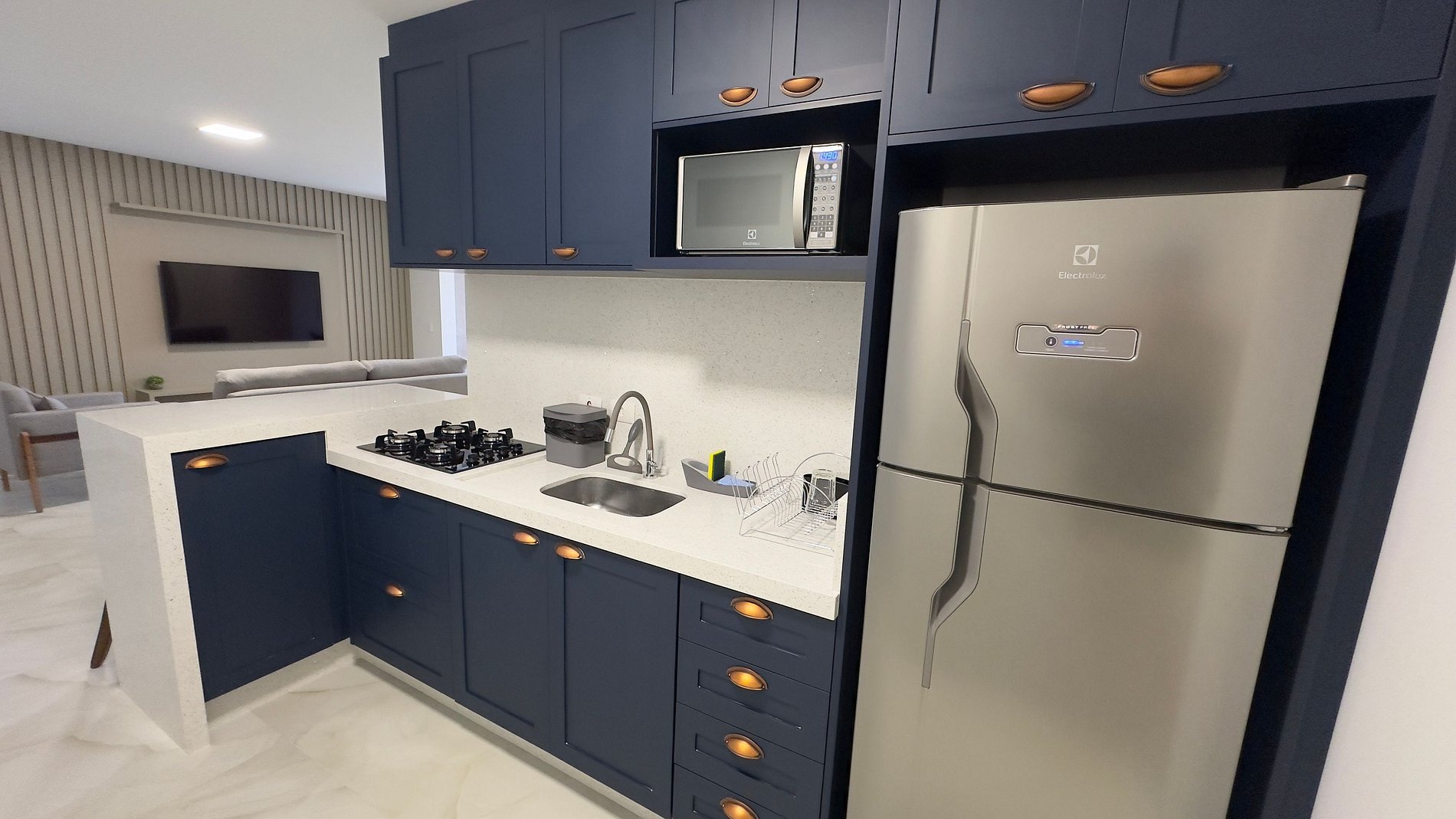 Na sala, você vai encontrar um sofá aconchegante, Smart TV e internet de 300 Mbps para garantir que você esteja sempre conectado.