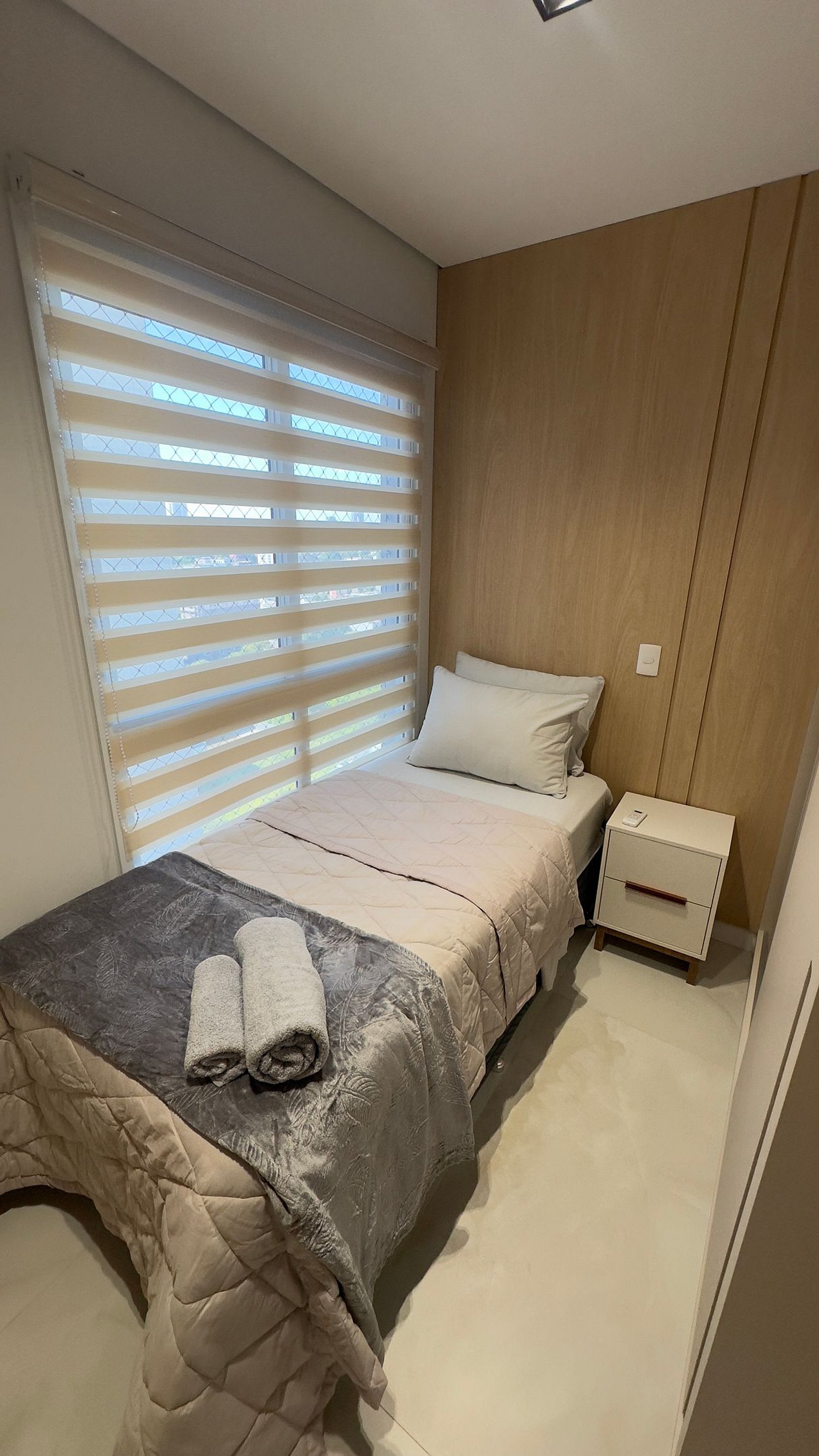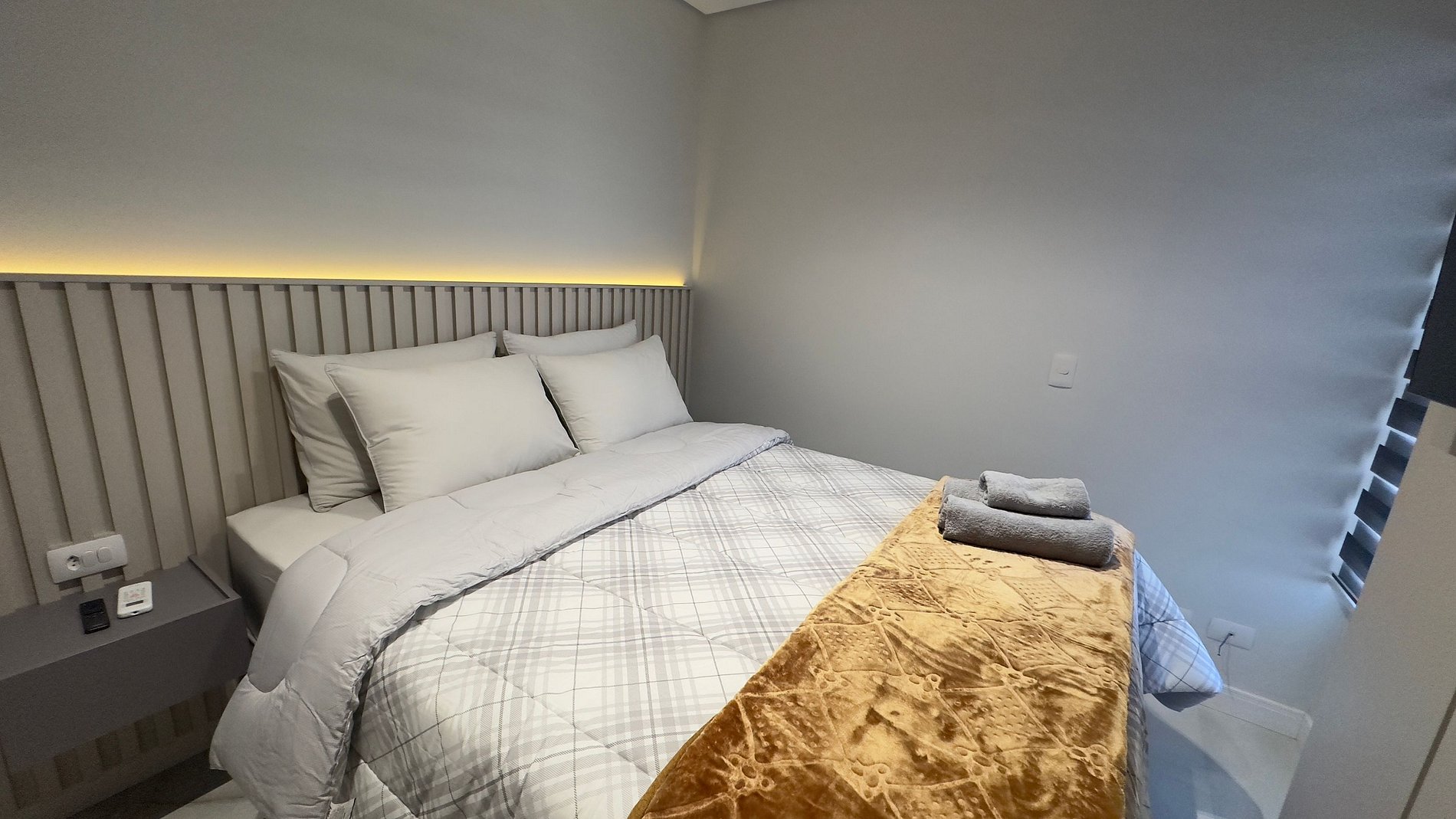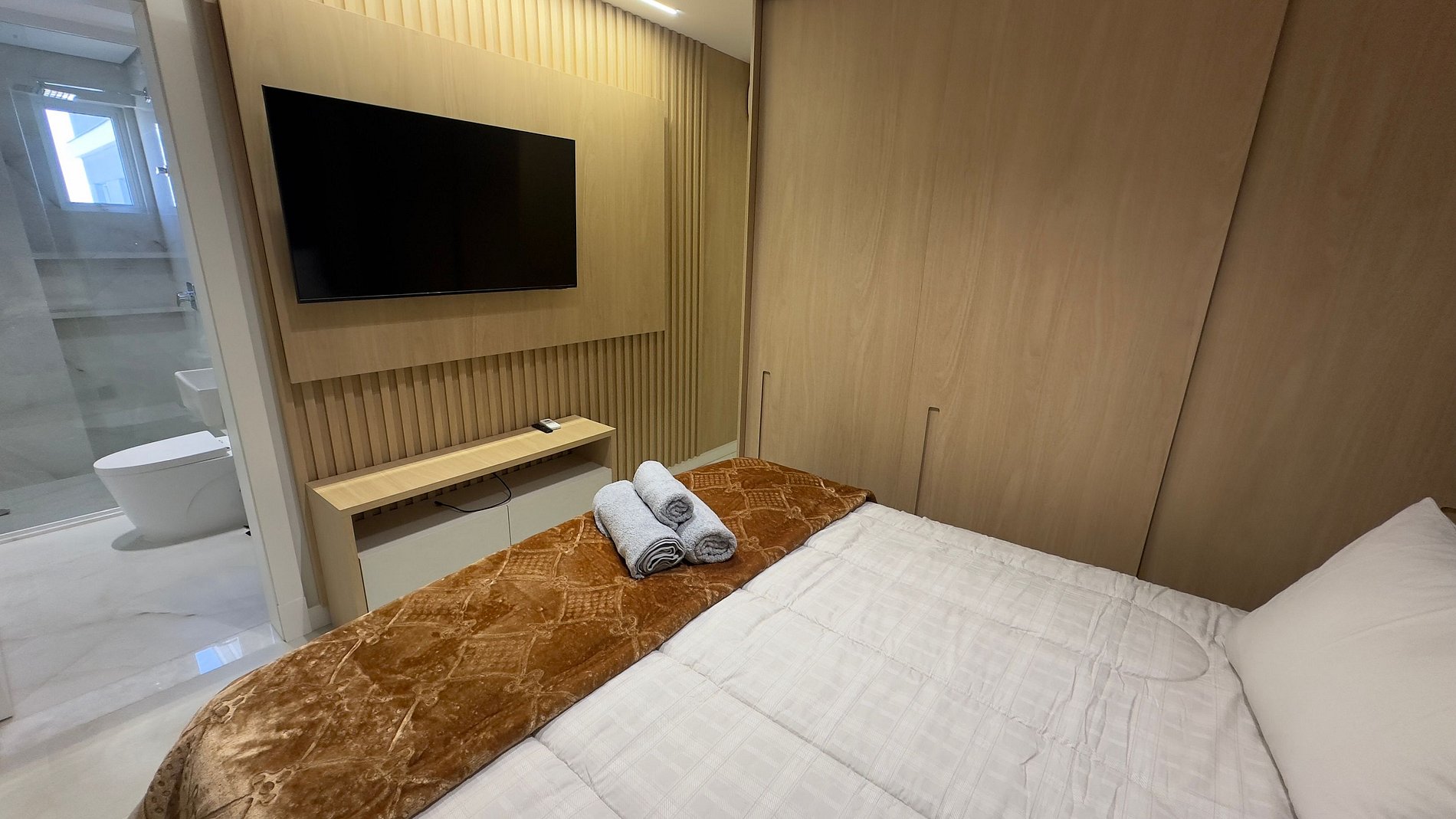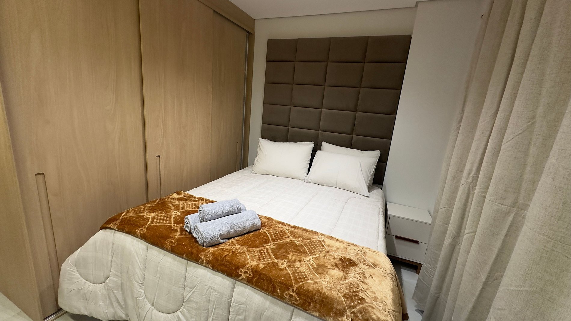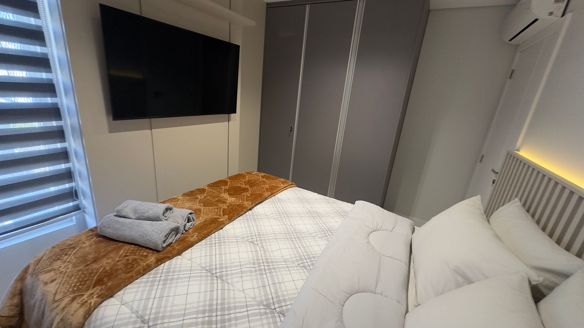 O apartamento dispõe de três quartos, sendo uma suíte com cama queen, outro quarto com cama queen e um terceiro com uma camas de solteiro. Todos os quartos têm móveis planejados, guarda-roupas espaçosos, ar condicionado e uma vista incrível da cidade.