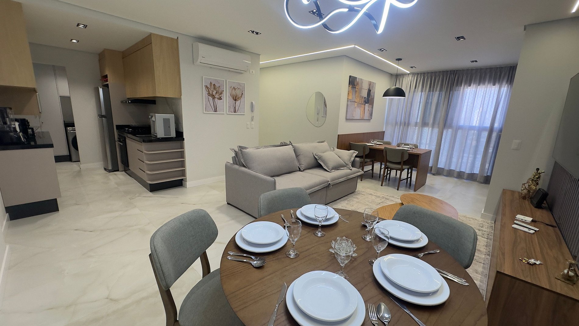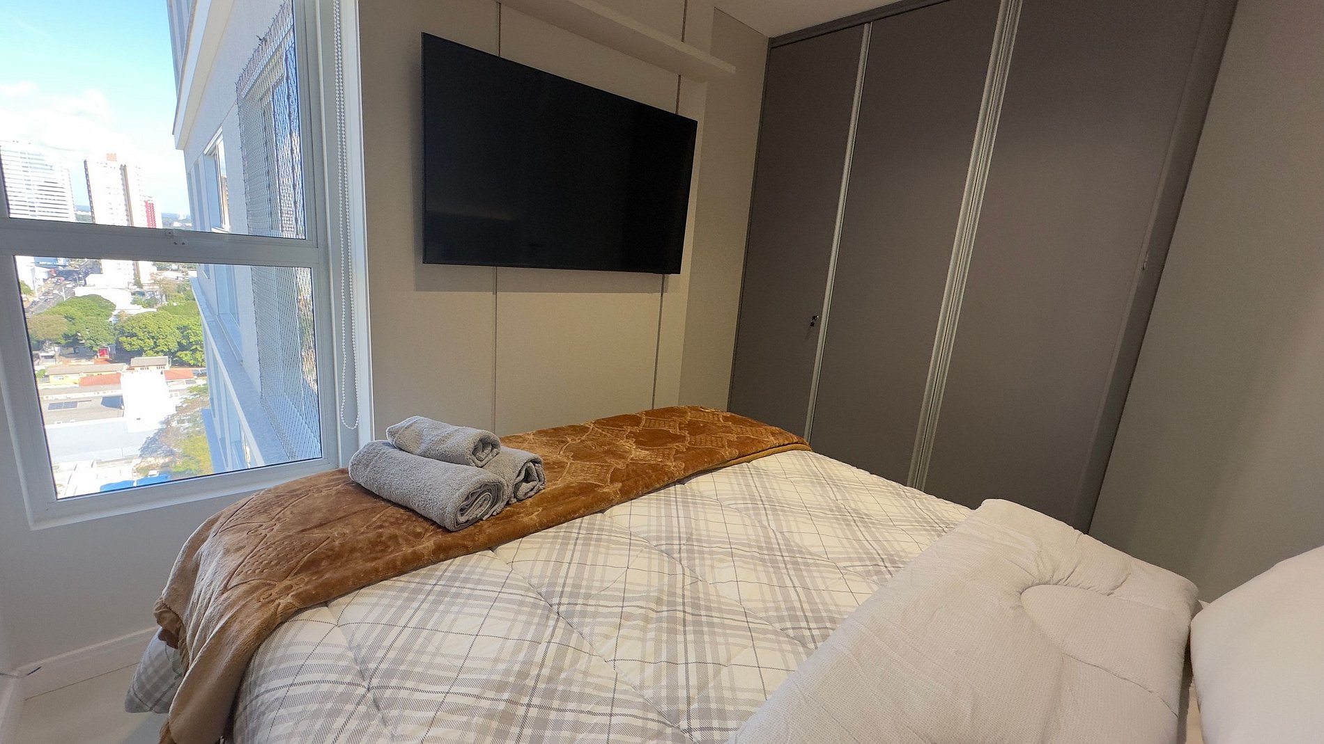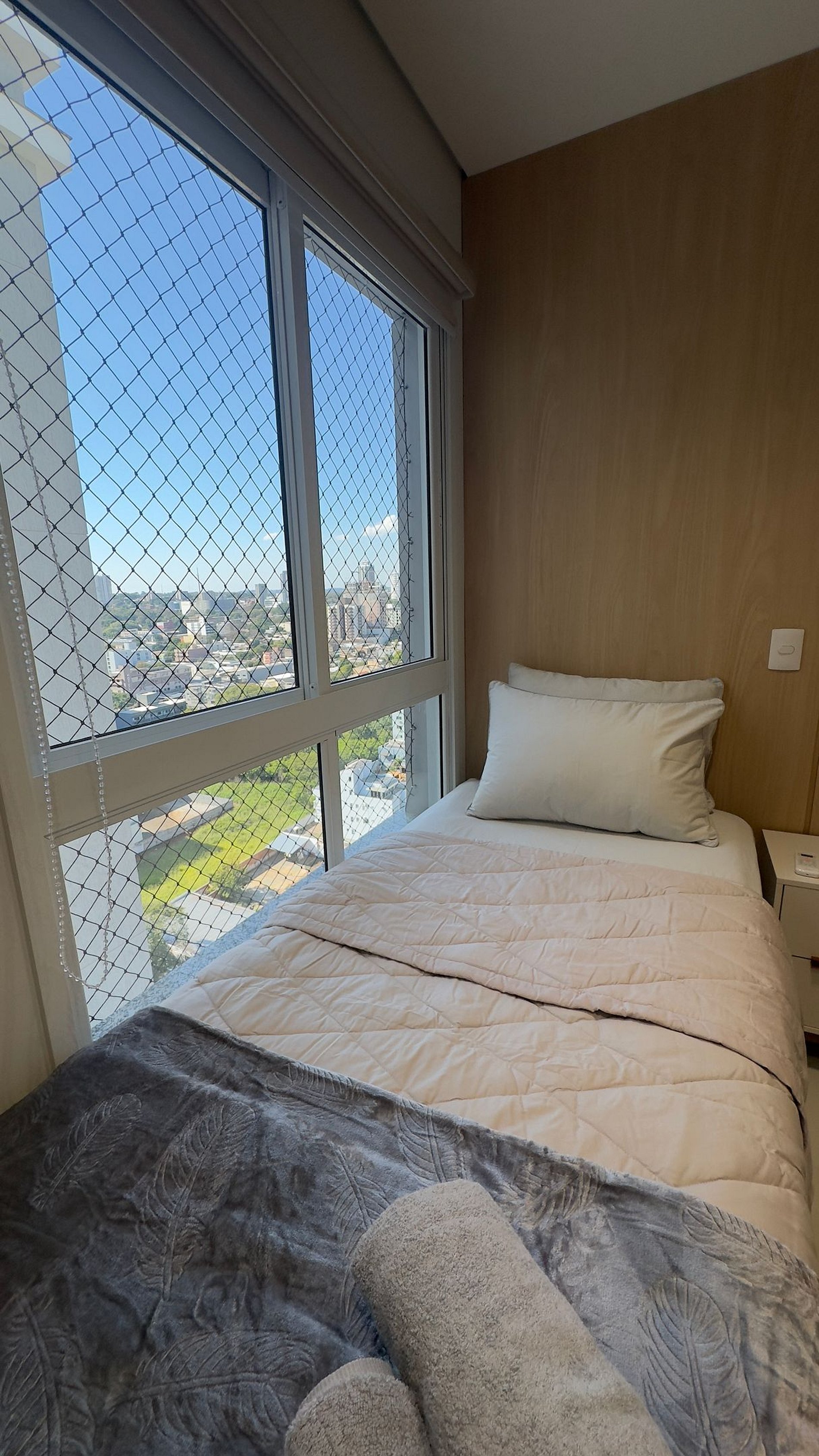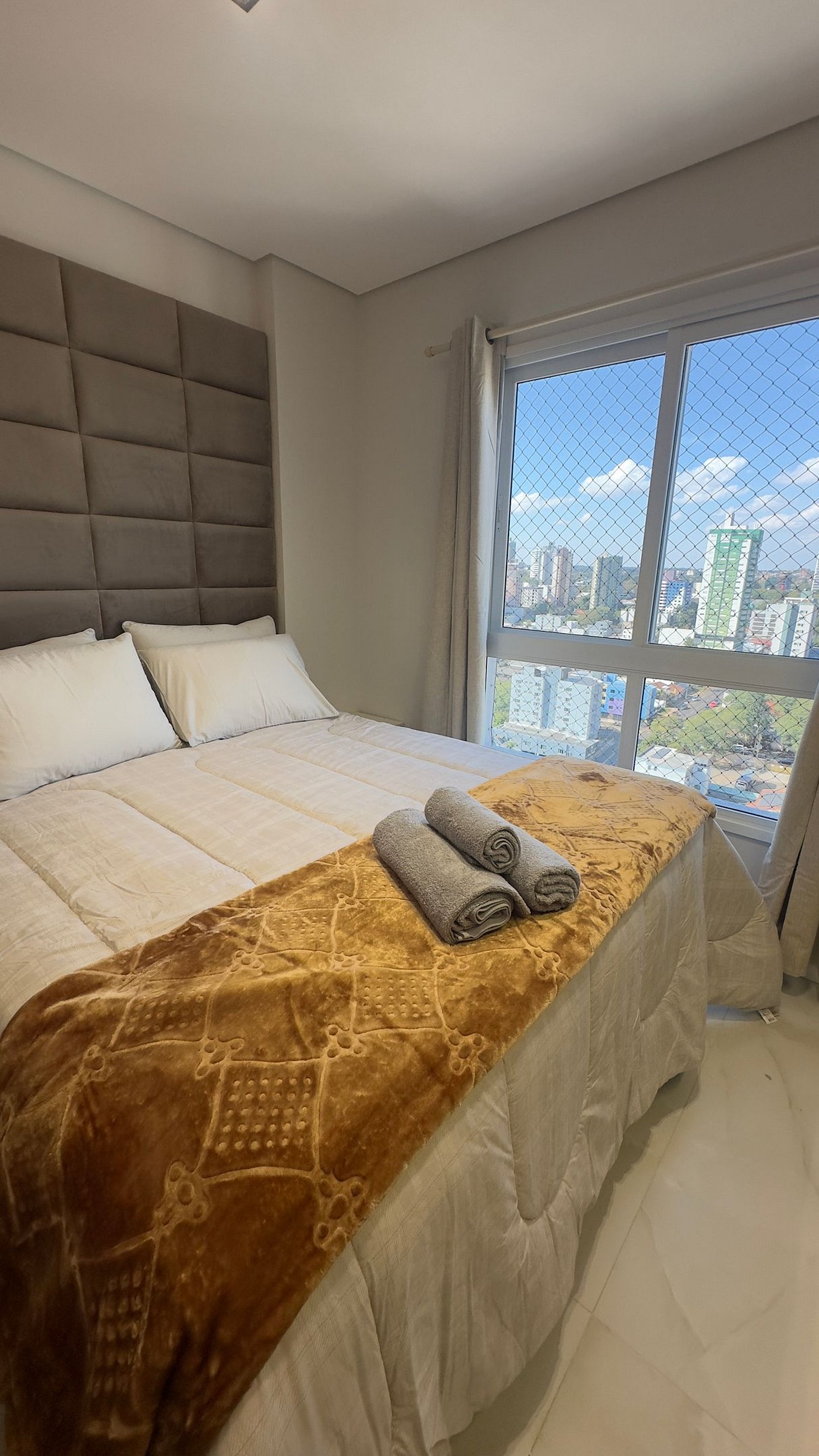 O apartamento dispõe de três quartos, sendo uma suíte com cama queen, outro quarto com cama queen e um terceiro com uma camas de solteiro. Todos os quartos têm móveis planejados, guarda-roupas espaçosos, ar condicionado e uma vista incrível da cidade.