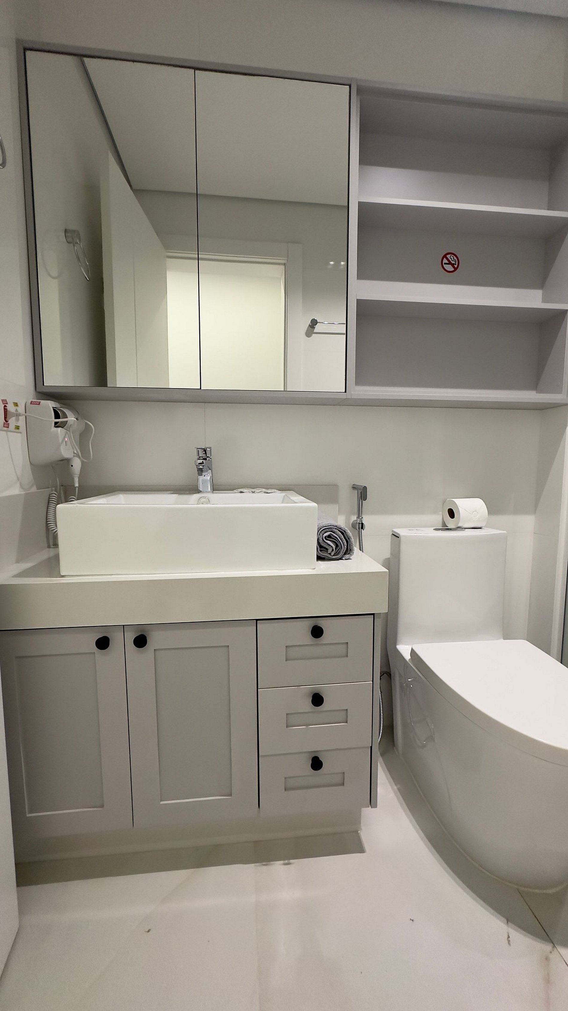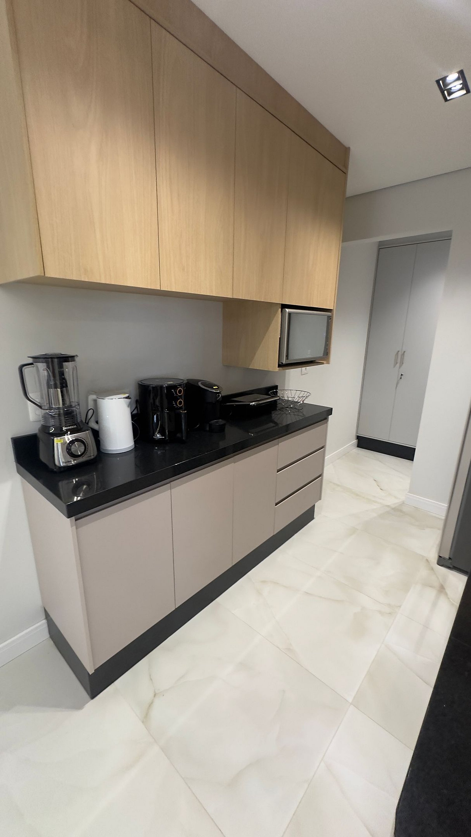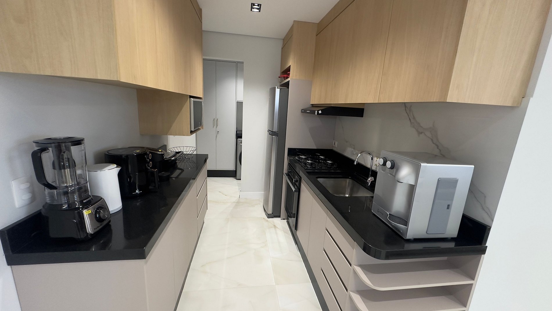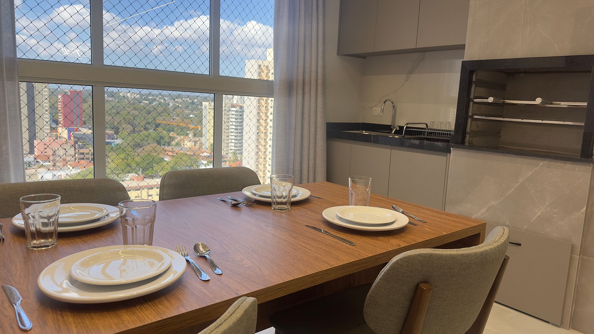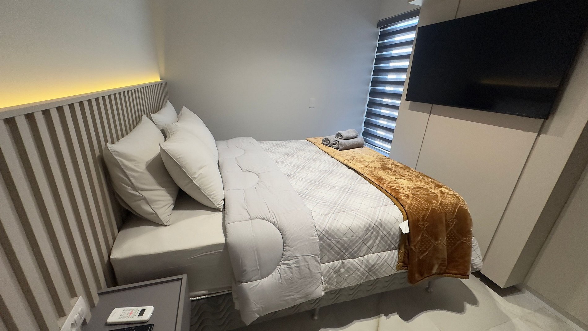 O apartamento dispõe de três quartos, sendo uma suíte com cama queen, outro quarto com cama queen e um terceiro com uma camas de solteiro. Todos os quartos têm móveis planejados, guarda-roupas espaçosos, ar condicionado e uma vista incrível da cidade.