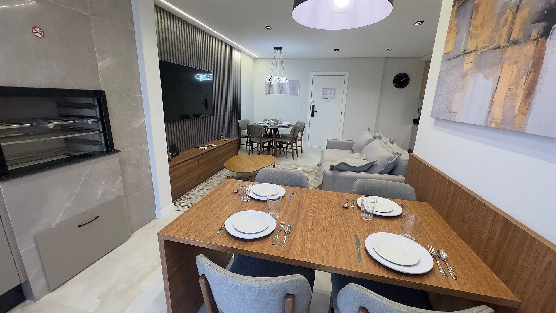 O destaque fica por conta do espaço gourmet com churrasqueira, perfeito para confraternizações e momentos especiais. A cozinha planejada é linda e totalmente equipada com eletrodomésticos, facilitando suas refeições durante a estadia. Além disso, há um espaço de lavanderia com máquina de lavar e tanque para sua conveniência.