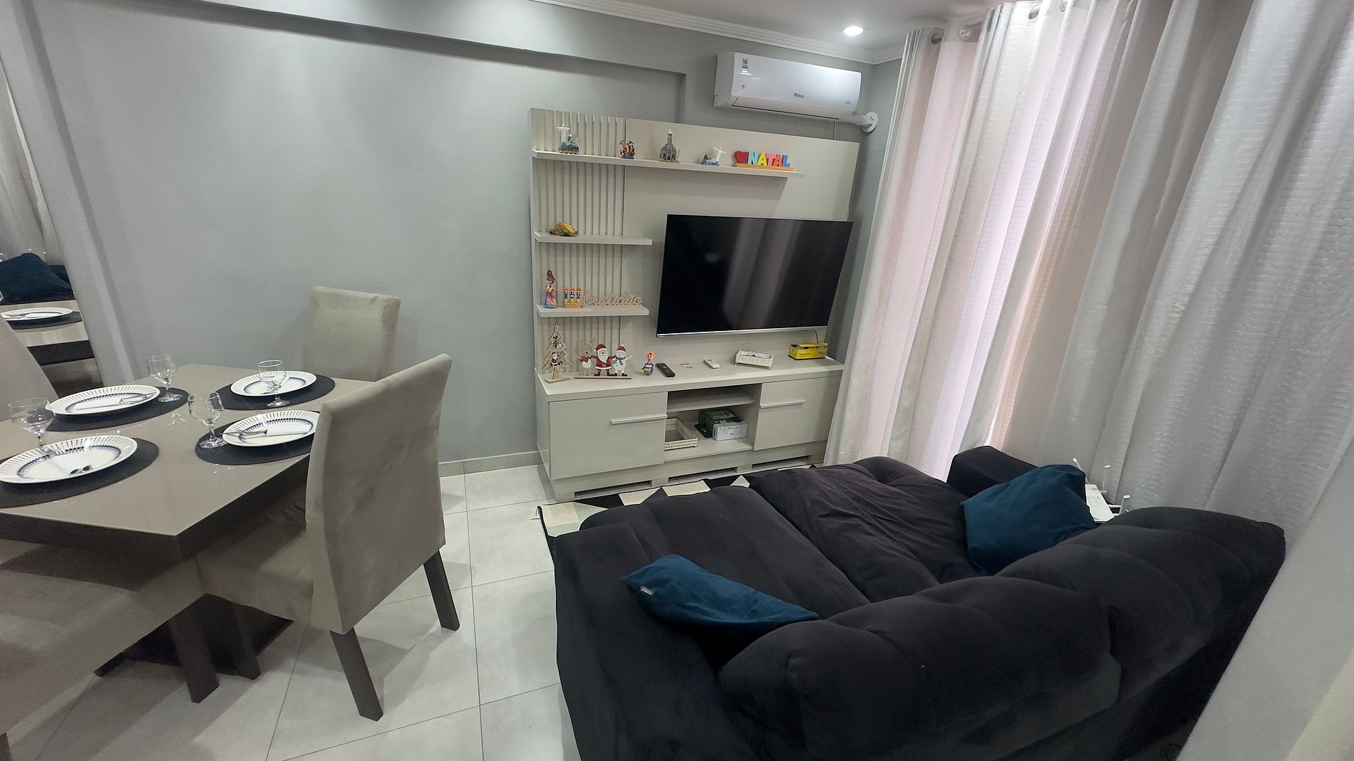 Sala de estar e jantar integradas: sofá, TV, mesa de jantar e Wi-Fi gratuito.