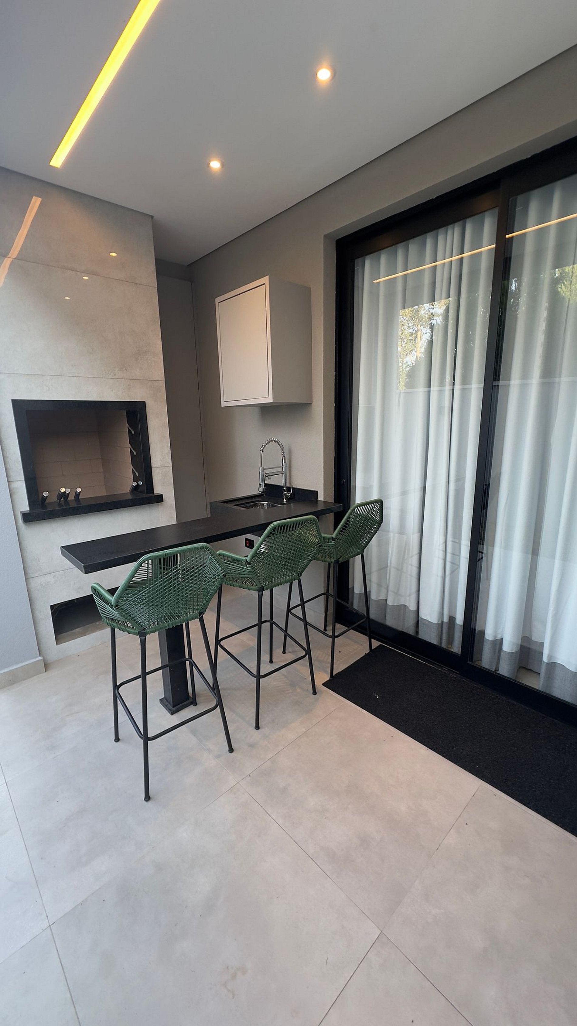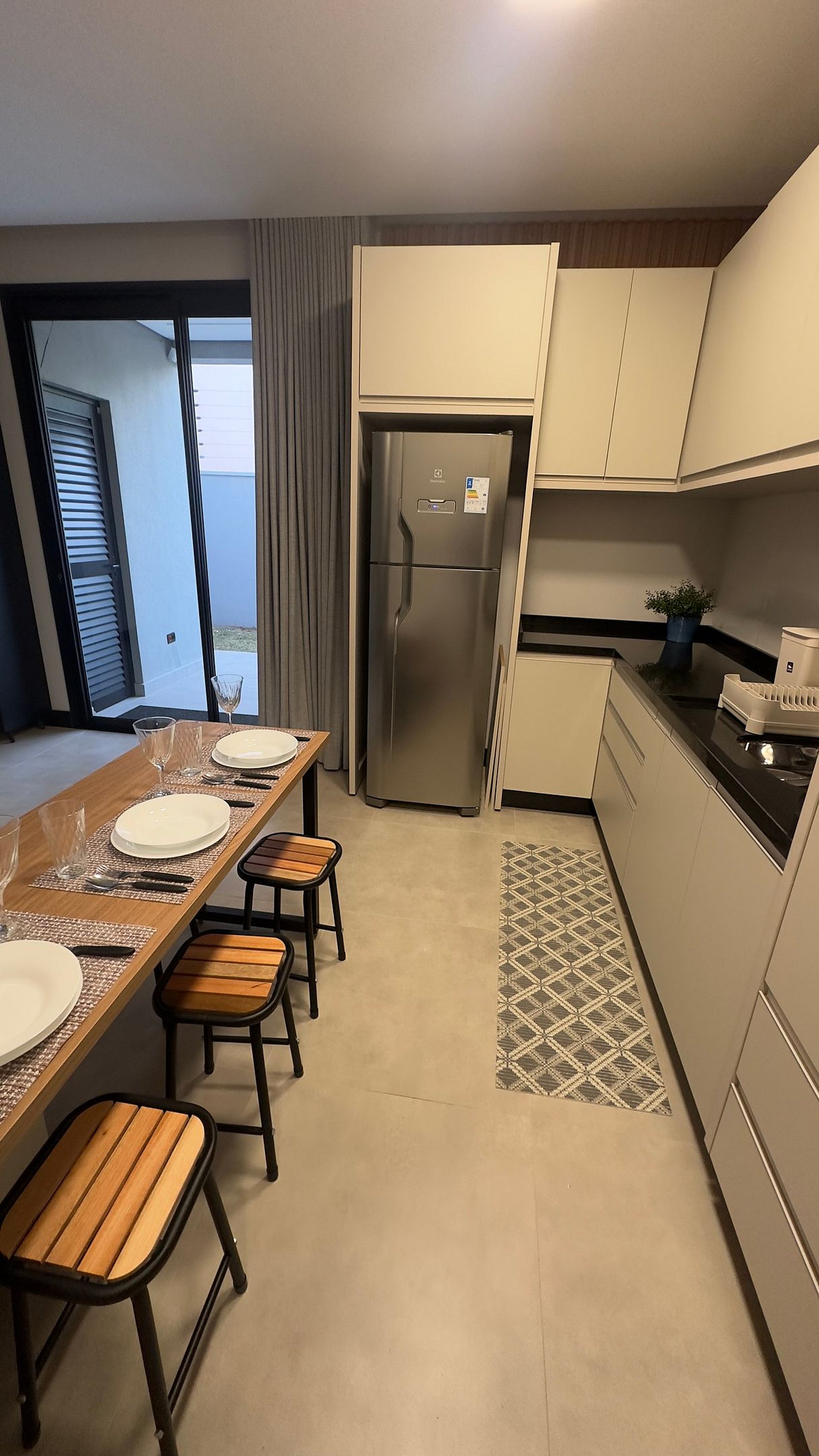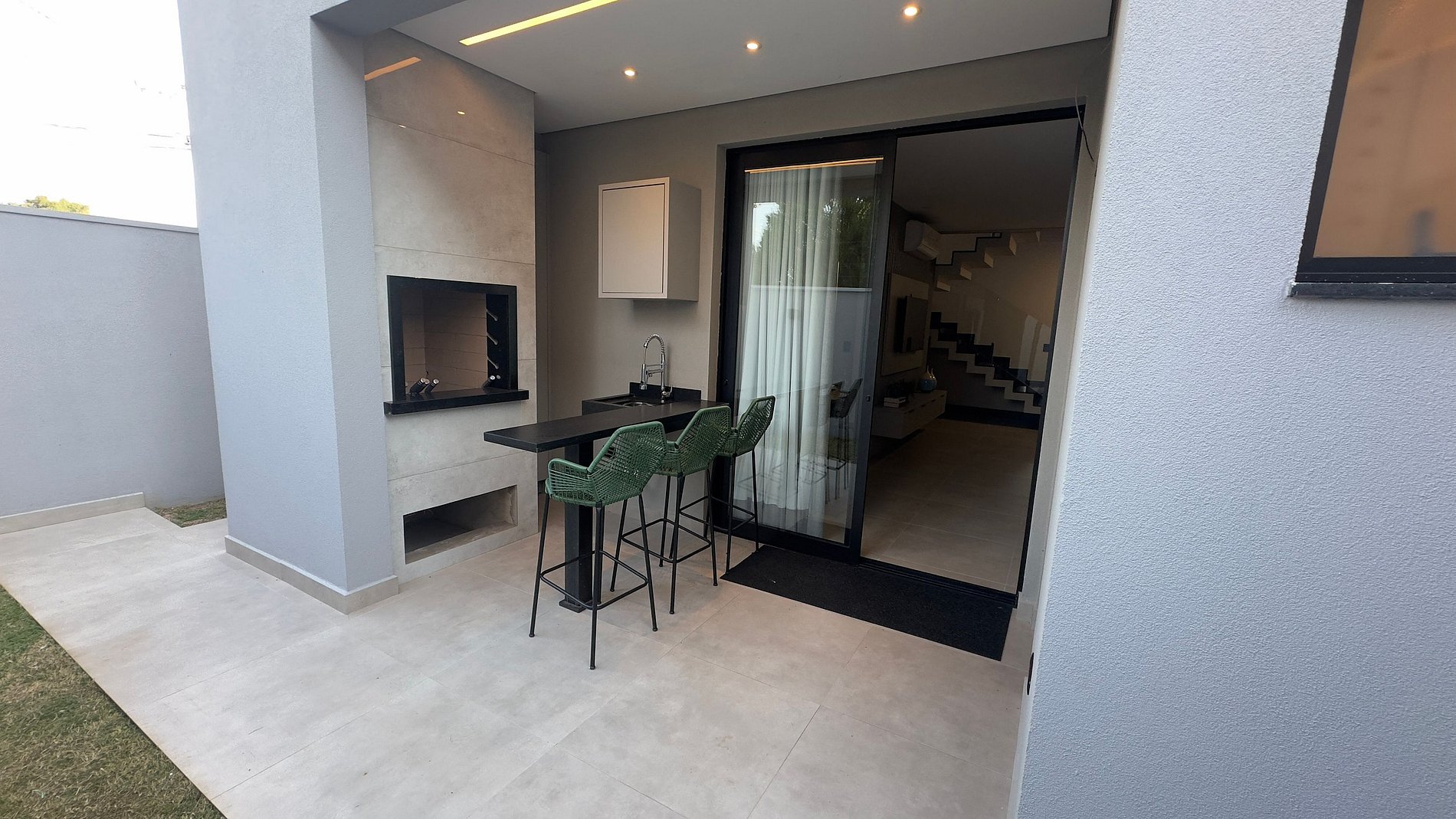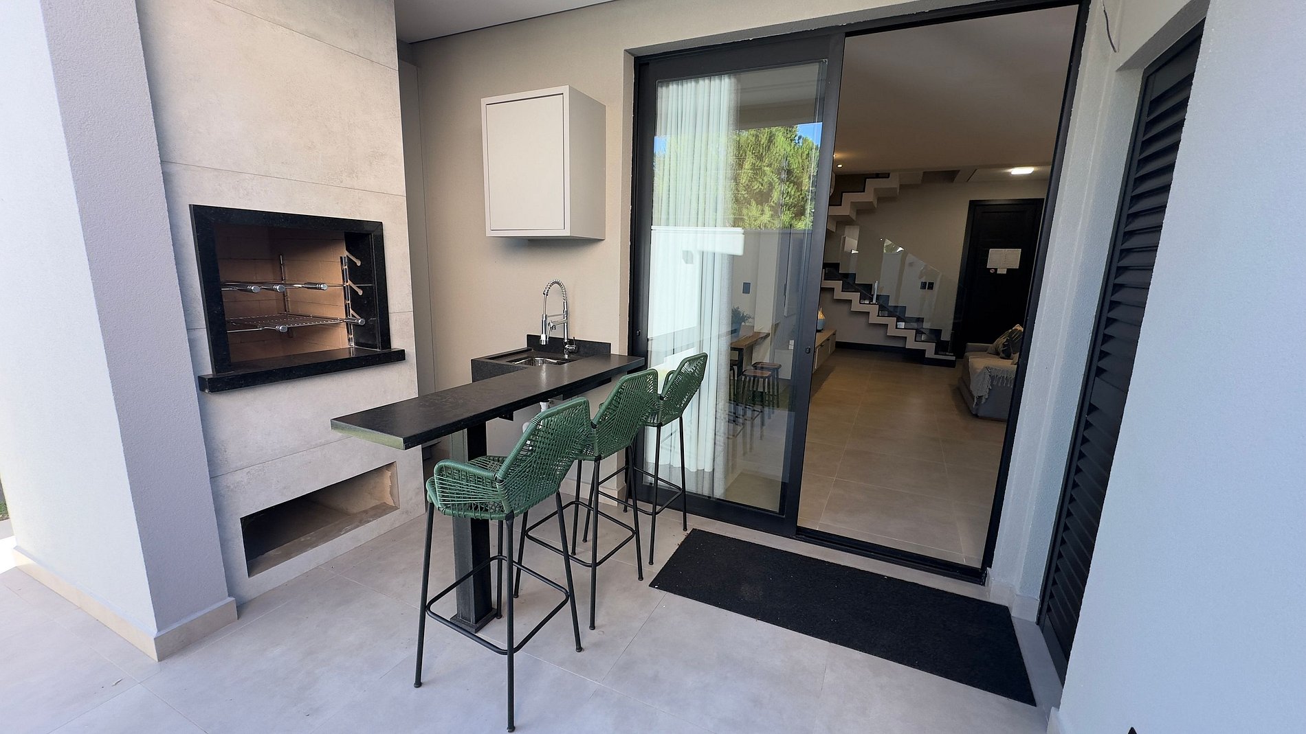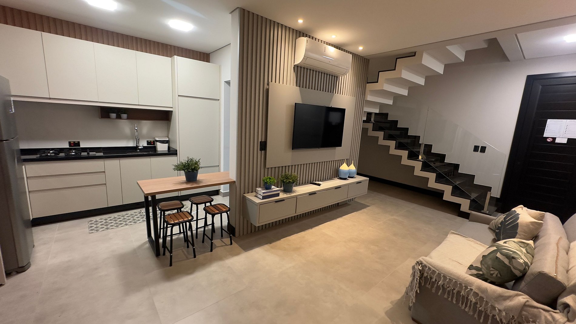 No piso térreo, você encontrará uma sala ampla com sofá-cama tamanho queen super confortável, cozinha equipada com utensílios e eletrodomésticos para o dia a dia, lavanderia com máquina de lavar e tanque, além de uma área gourmet externa aconchegante com churrasqueira, bancada e banquetas — ideal para momentos especiais.